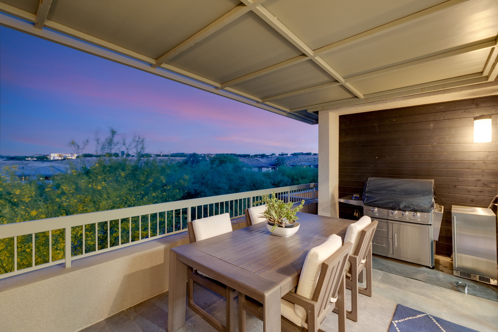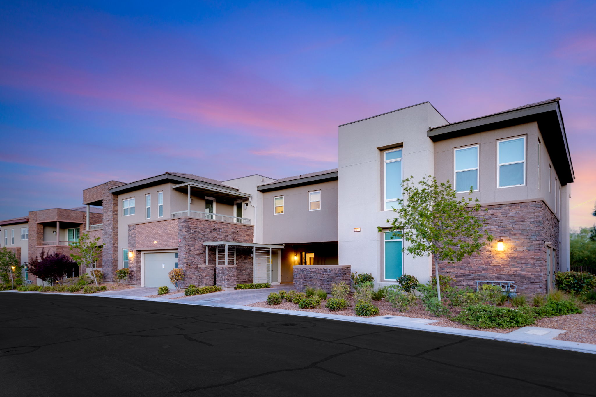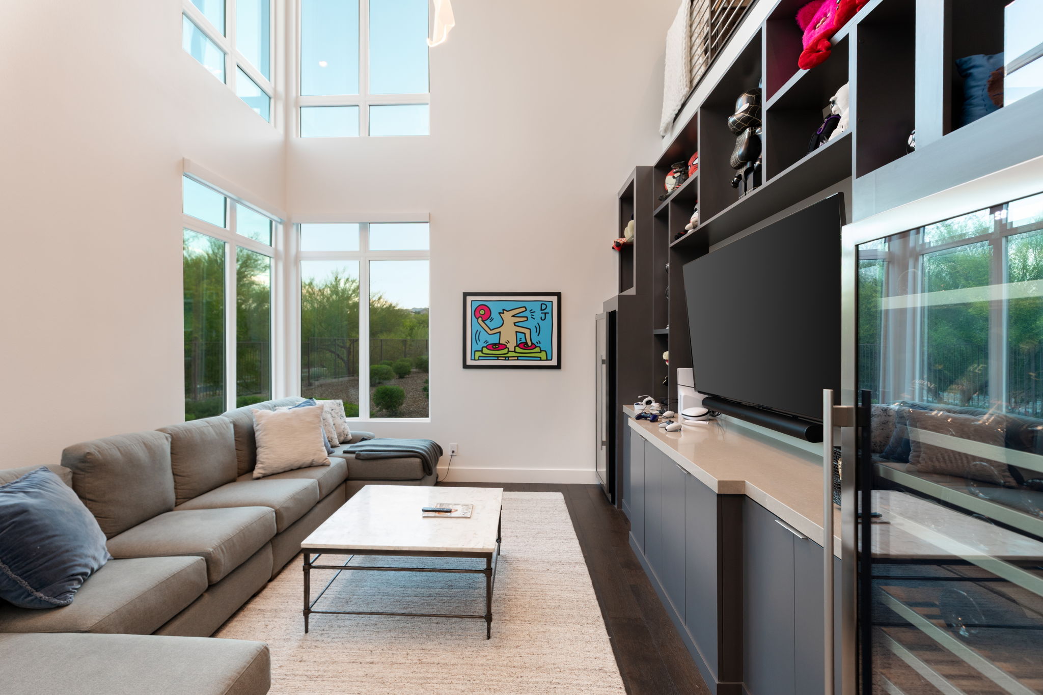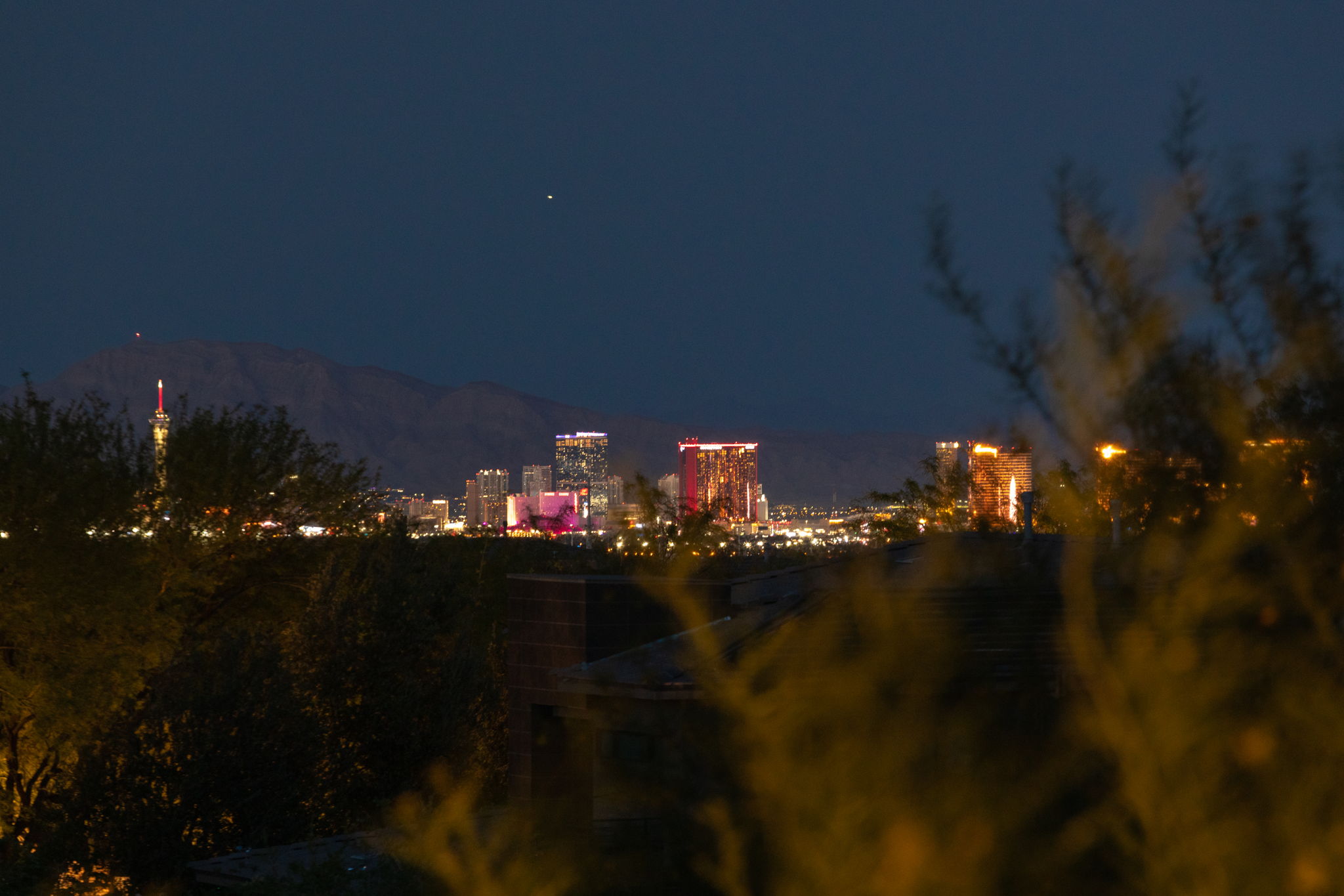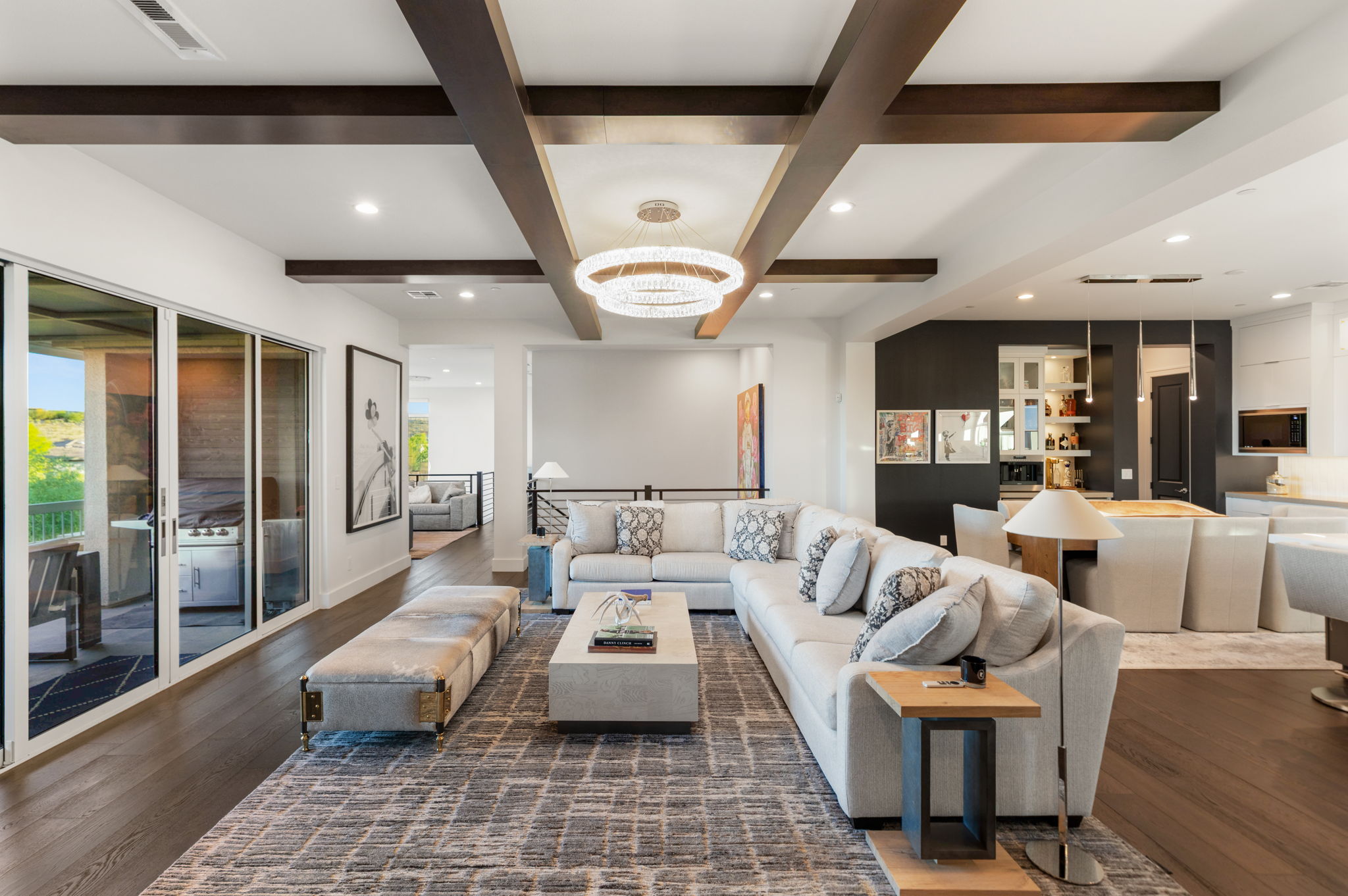 The great room is enhanced by ceiling beams, custom millwork, and a striking wine and media wall. Motorized shades and luxury vinyl plank flooring add comfort and style. A private main-level terrace captures captivating Strip and city views. Offering four bedrooms, a loft, a secondary living area, and an office, this home blends sophistication with functionality. Residents enjoy access to Club Ridges amenities, including pool, tennis, and fitness center.