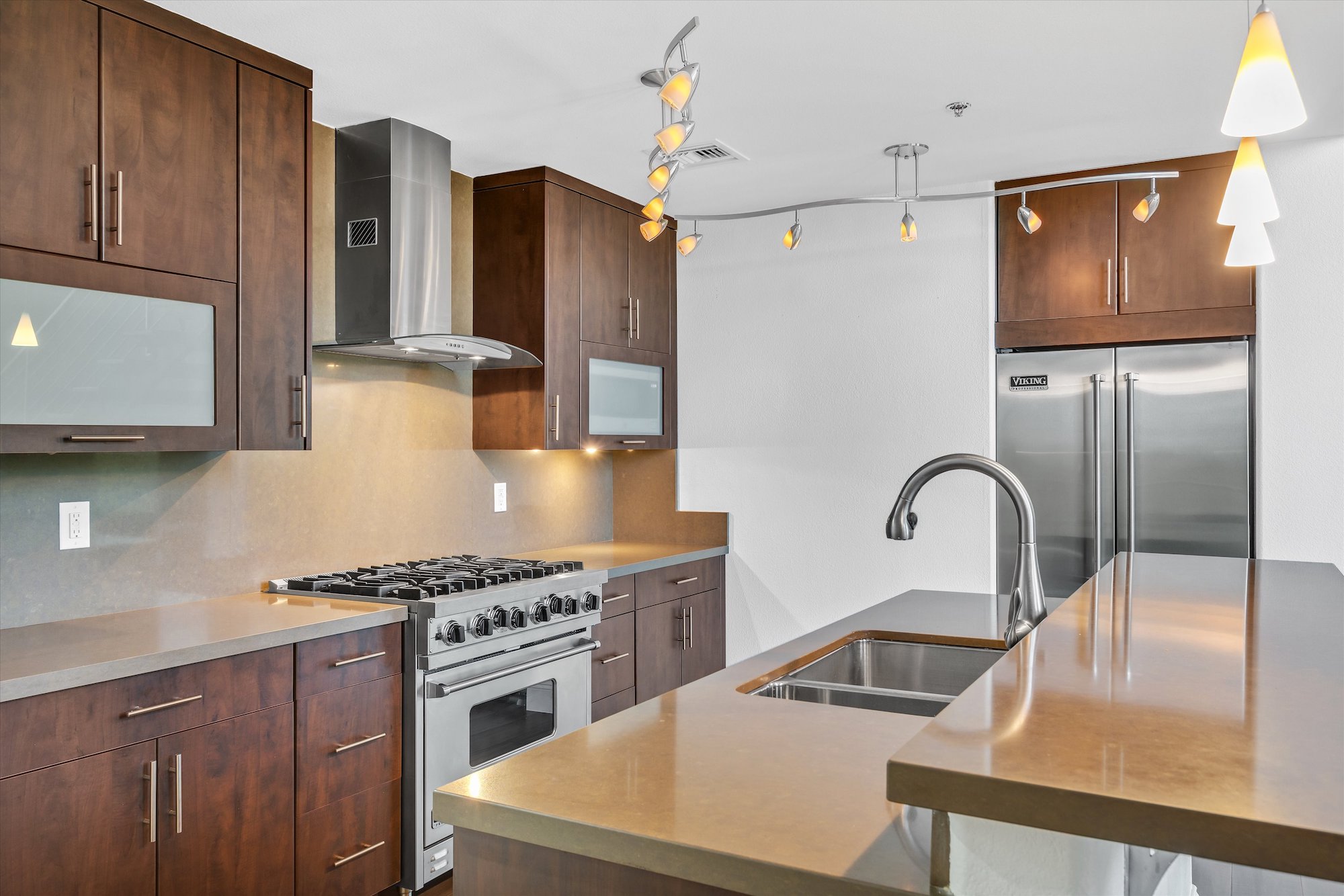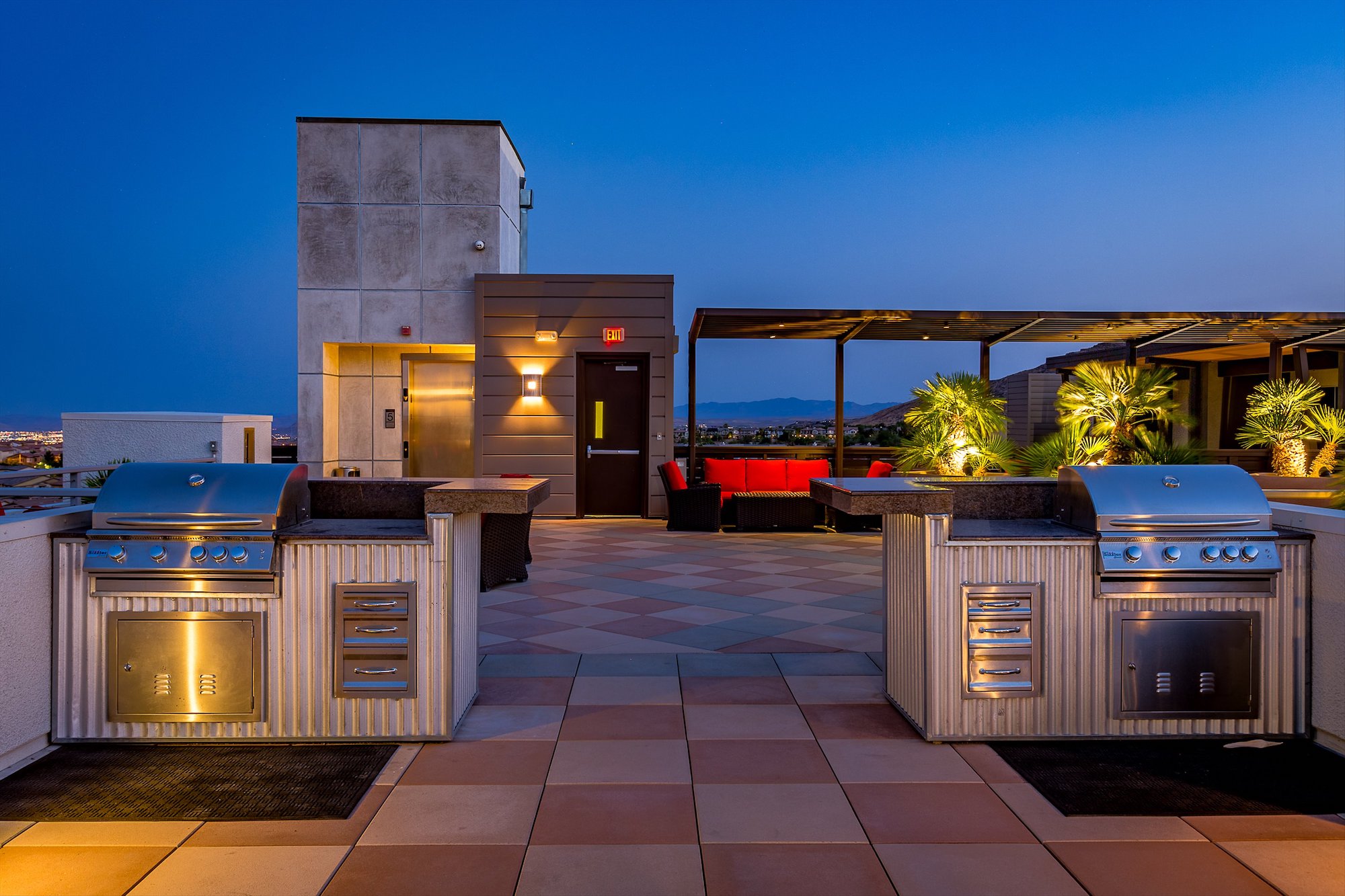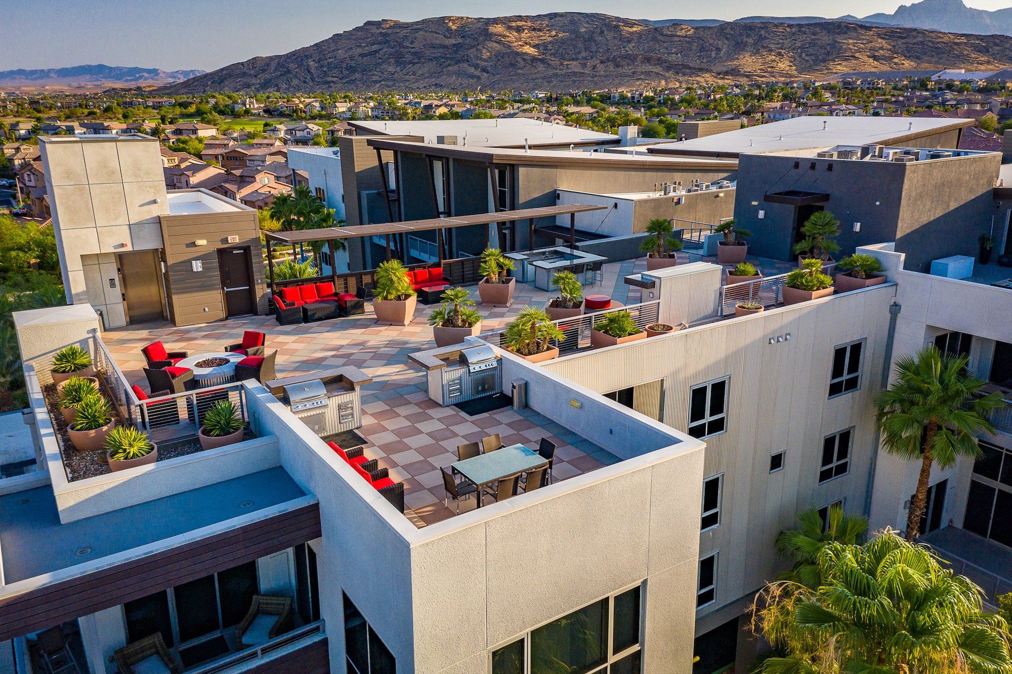 The kitchen is a vision of excellence featuring quartz countertops, a large island, stainless steel appliances, and a built-in bar with a wine cooler. Step outside onto the large balcony thatās perfect for entertaining. Enjoy the gorgeous mountain and city views from the buildingās rooftop deck that features a BBQ area, fireplace, pool & more. 2 secured parking spots are included. If you are looking for contemporary loft living in the heart of Summerlin that is safe, secure, and convenient, this is it.