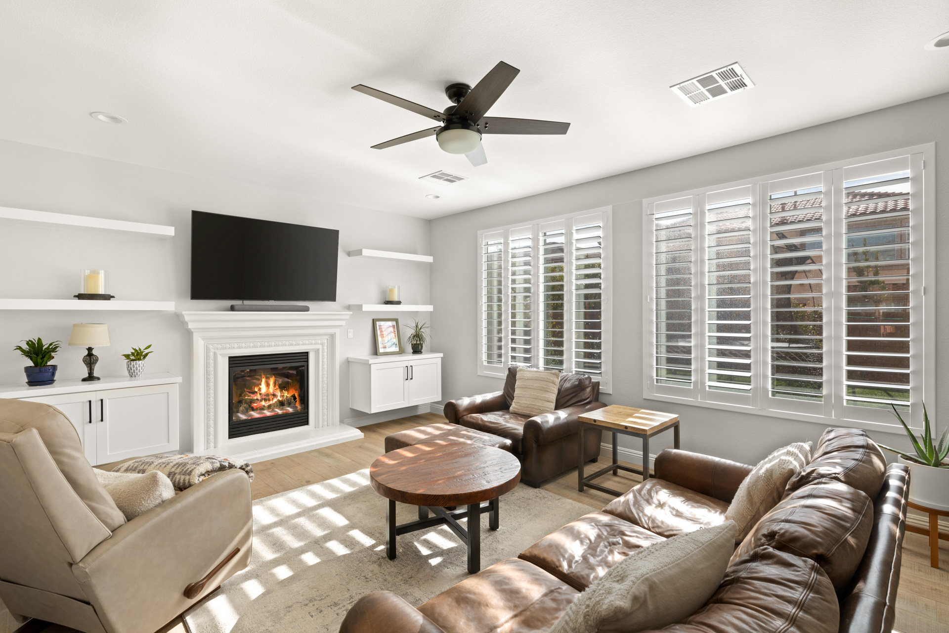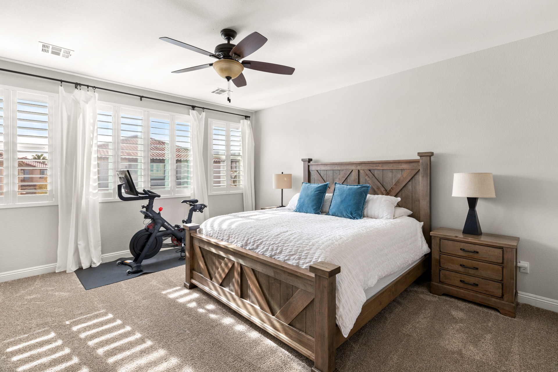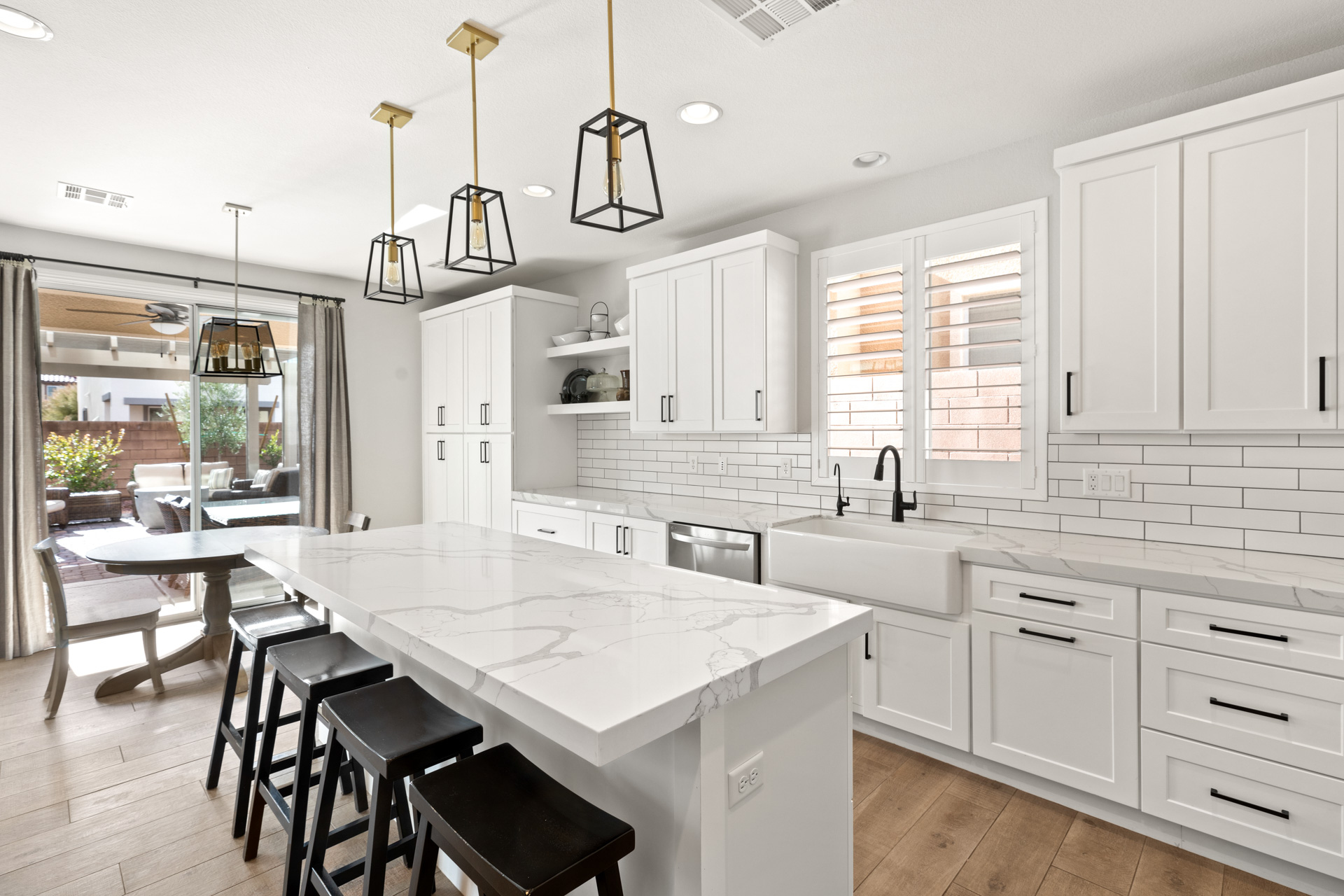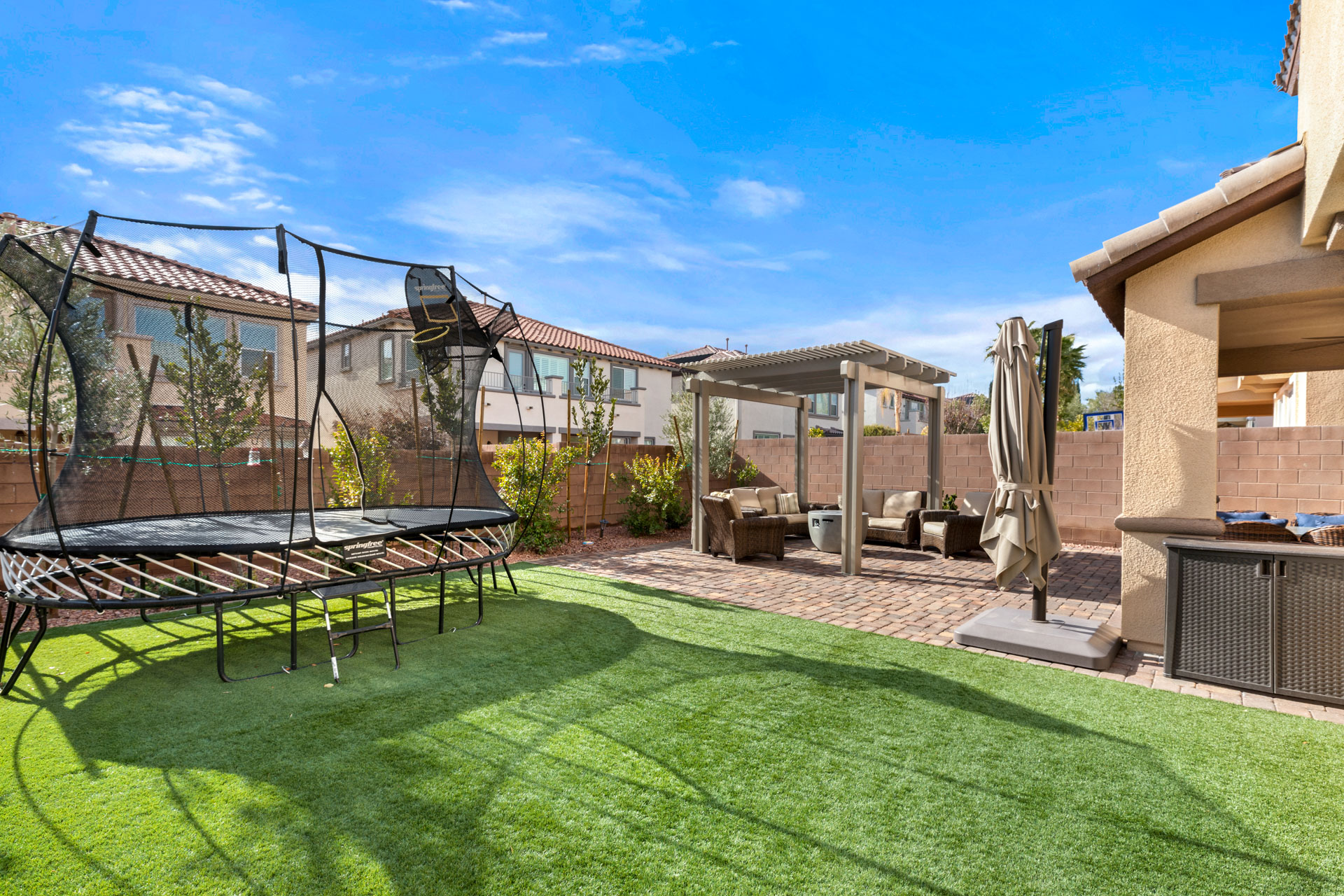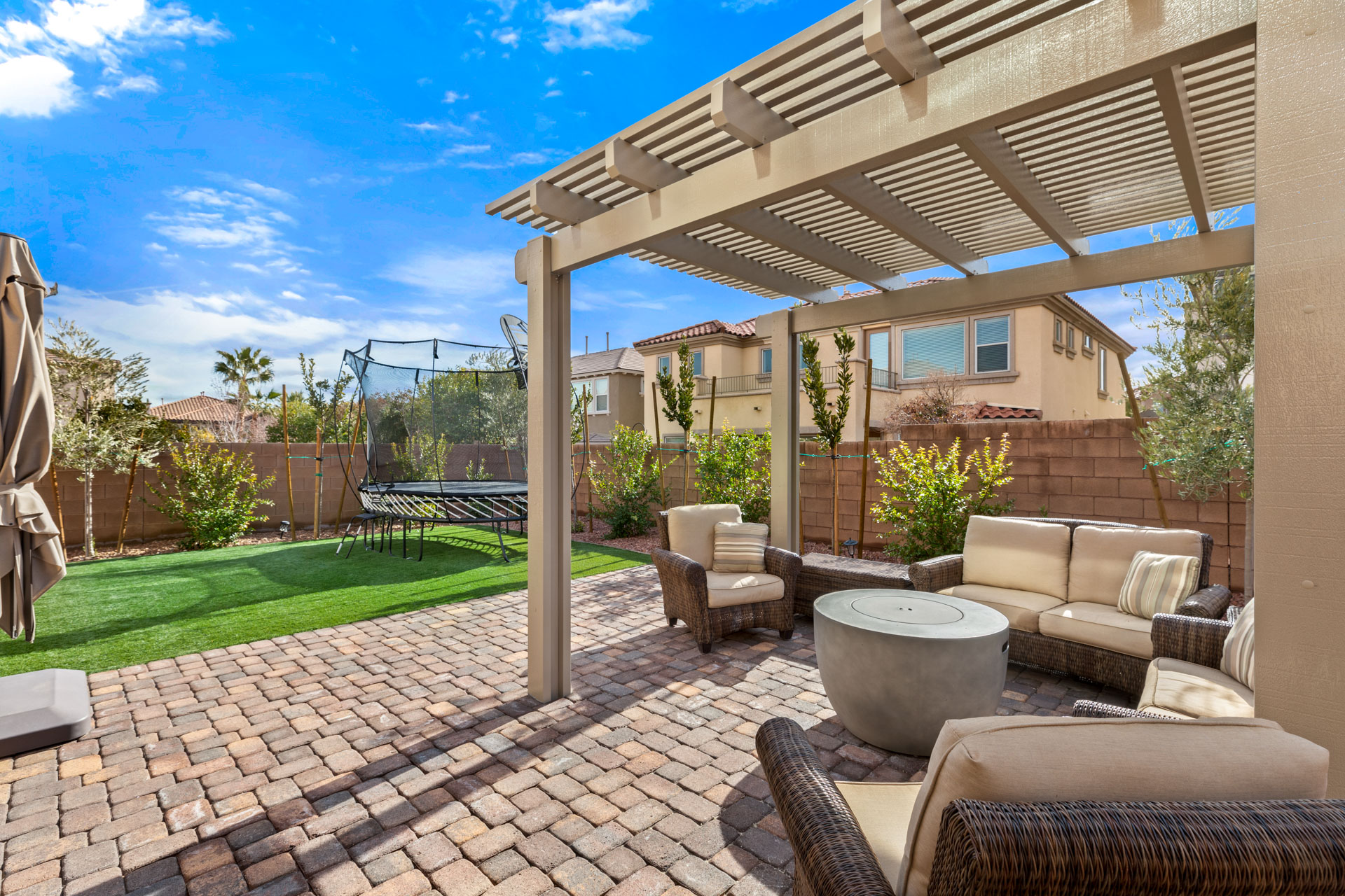 All countertops and cabinetry on the second floor reflect the same magnificent, fashionable upgraded design as those downstairs. Yielding gorgeous white cupboards, drawers, built-ins, quartz countertops, and fully upgraded bathroom and closet in the master! When the day is done and it is time to relax and take in the beautiful sunset that Las Vegas is known for, your backyard is the best place to be. With your pristine, manicured landscape you can unwind and settle down under your covered patio, or make your way over the pavers to the large pergola and nestle in. Whichever you choose, your home captures a magnificent view of the magical Red Rock mountains.