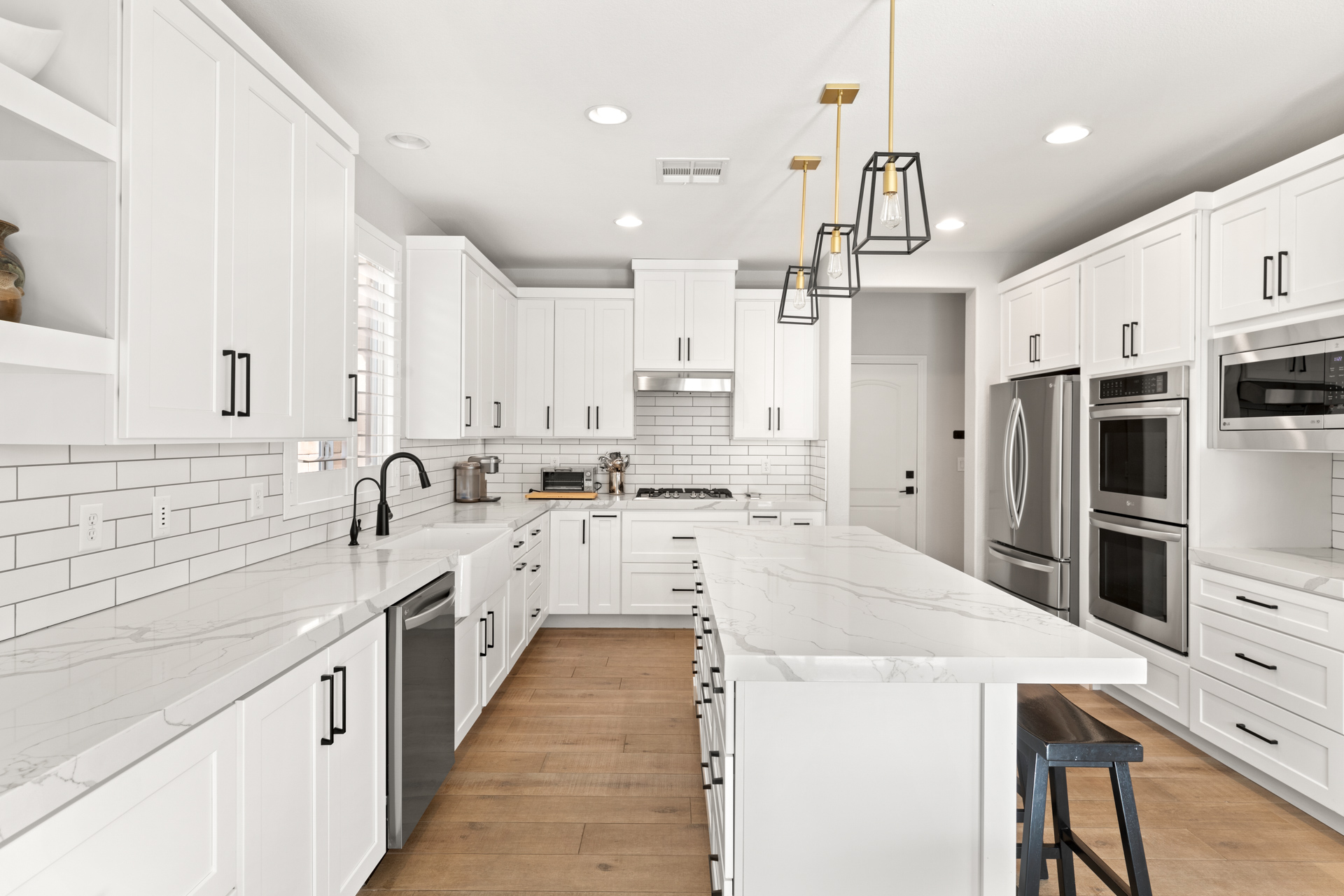 Gorgeous ceramic tile extends throughout. The contemporary theme permeates into the kitchen where you will find white cabinetry, quartz countertops, a farmhouse sink, breakfast nook, and upgraded fixtures. If you like to entertain, or just need additional space for the family, make your way upstairs. An enormous loft with built-in cabinets and drawers awaits, with space for a separate living room, game room, gym, or office⦠The options are limitless!
