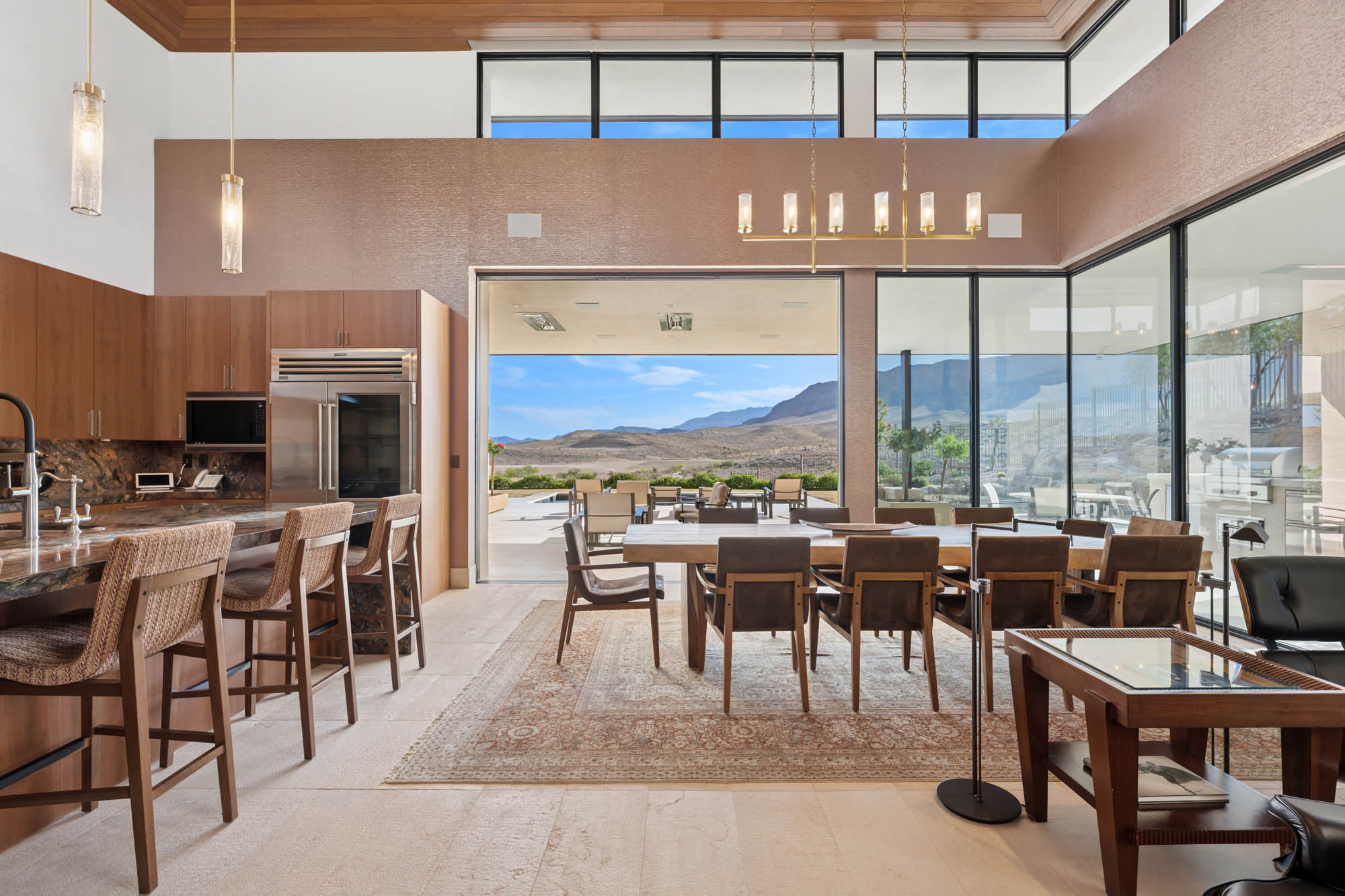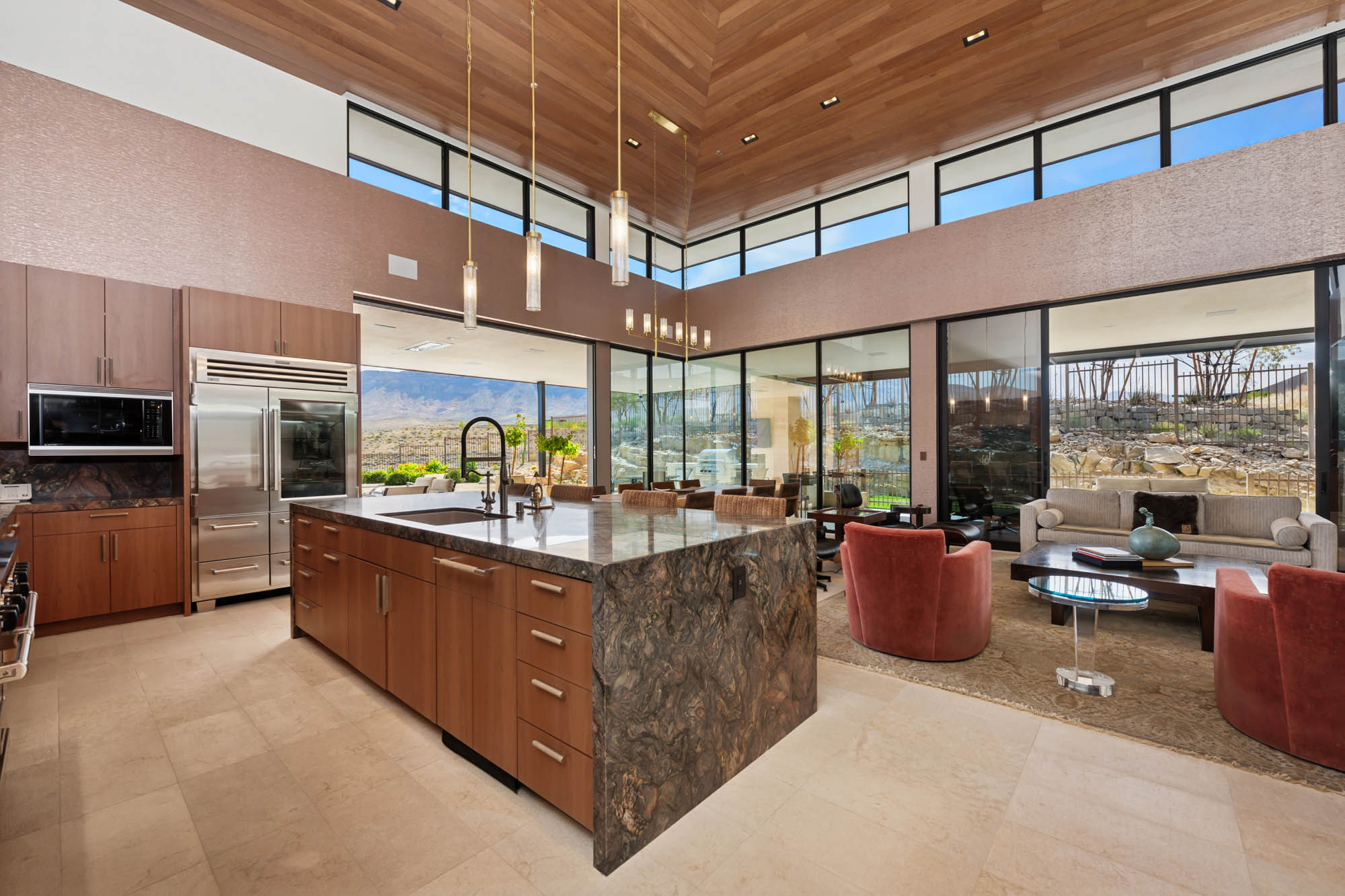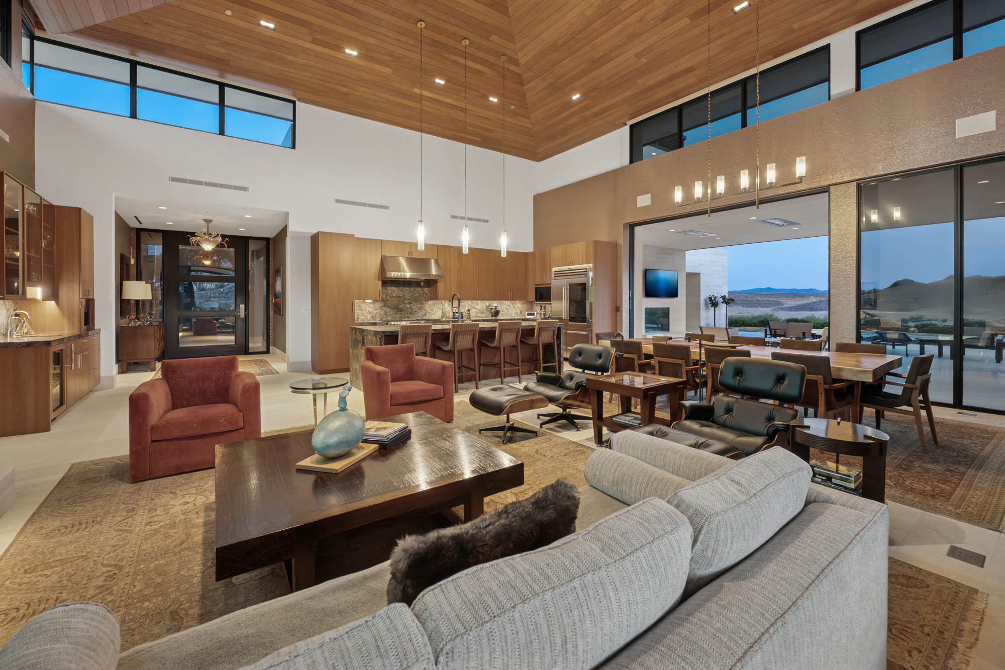 From the moment you step inside, the home delivers a sense of scale and serenity. Towering ceilings and walls of glass create a seamless connection to the outdoors, bathing the interiors in natural light and framing picture-perfect vistas at every turn. Anchoring the dramatic great room is a two-story stone fireplaceāequal parts statement piece and cozy gathering pointāsurrounded by rich wood-clad ceilings, custom built-ins, and a sleek wet bar that invites effortless entertaining.