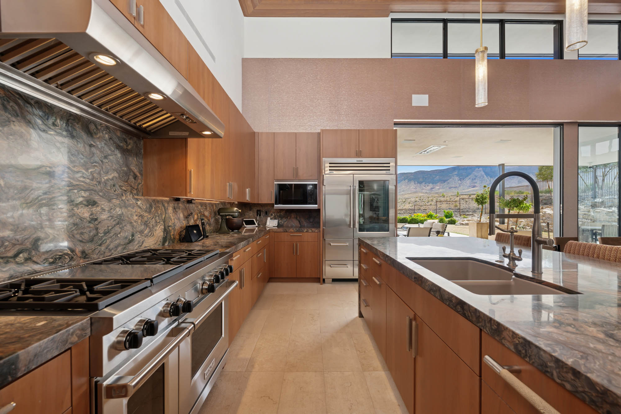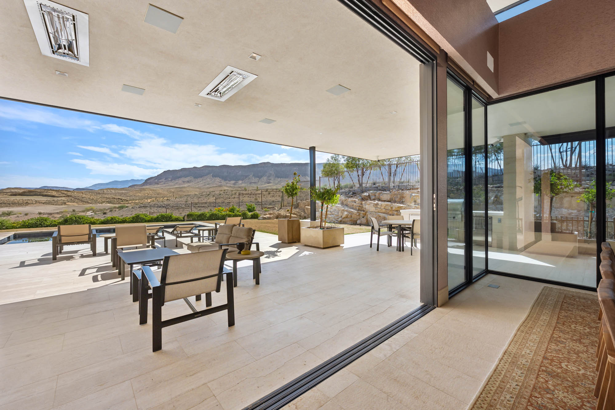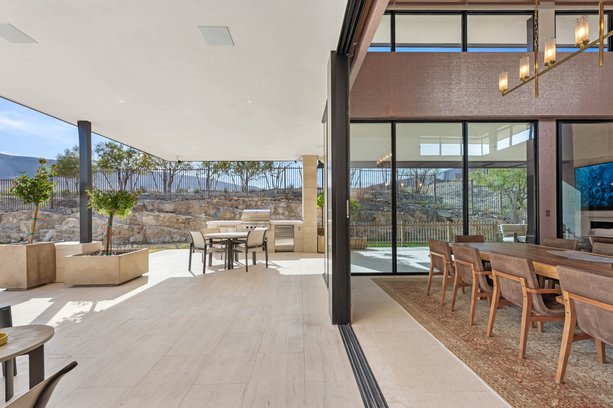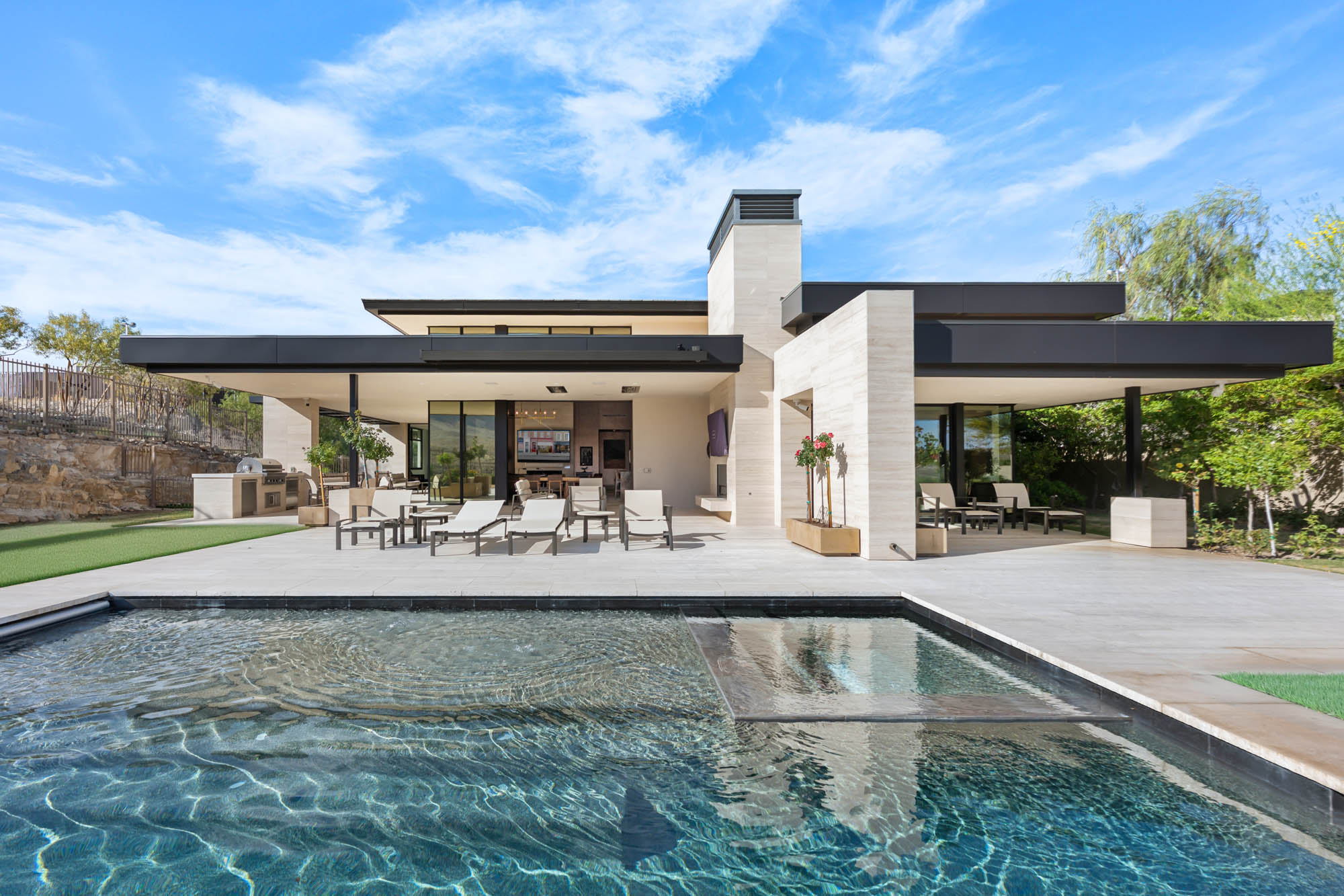 Designed with the discerning chef in mind, the open-concept kitchen pairs top-tier functionality with refined style. A massive granite waterfall island provides ample prep space and casual dining, while the professional-grade 8-burner rangeāwith built-in griddle and double ovensāmakes hosting at scale a breeze. Thoughtful design continues throughout the home, with movable glass walls that blur the line between indoors and out, creating a year-round resort experience. The layout is as functional as it is beautiful. Three spacious bedrooms and four bathrooms are thoughtfully distributed to maximize privacy and comfort. Each downstairs bedroom opens wide to the outdoors, bringing the beauty of the desert landscape into everyday life. The primary suite is a true sanctuary, with soft natural light, a dedicated makeup vanity, and a spa-style bathroom featuring a deep soaking tub, dual sinks, and a luxurious multi-head shower with a slab granite bench. Behind the scenes, this home is built for ease and efficiency, with a well-appointed laundry room offering dual washers and dryers, extensive cabinetry, and storage for every need. The oversized 3-car garage provides plenty of room for vehicles, recreational gear, and more. Step outside to discover a private backyard oasis designed for luxurious living and unforgettable gatherings. A sleek stone patio extends from the main living space and includes an outdoor fireplace, ceiling-mounted heaters, integrated speakers, and a full outdoor kitchen ideal for al fresco dining. The sparkling pool and spa combo features a tanning ledge for sun-soaked loungingāall set against a backdrop of sweeping, unobstructed views. As a resident of The Summit, you'll enjoy 24-hour guard-gated security and access to world-class amenities, including a Tom Fazio-designed golf course, wellness facilities, fine dining, and an unparalleled lifestyle centered around privacy, nature, and luxury. 11707 Discovery Canyon isn't just a homeāit's a statement. A rare opportunity to live in one of Las Vegasās most coveted communities, where every detail has been curated to elevate everyday living.