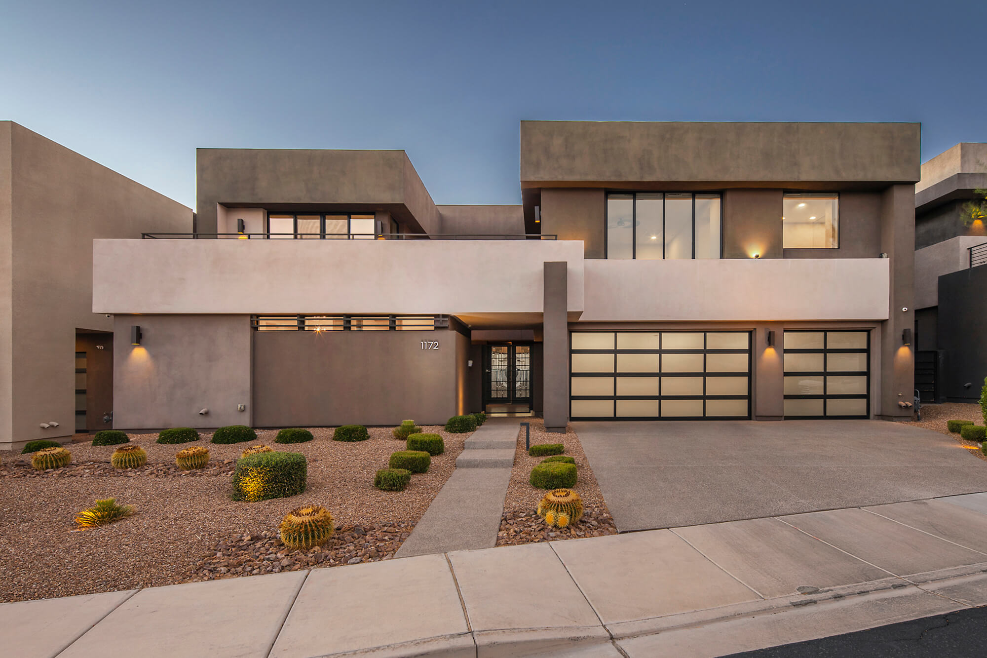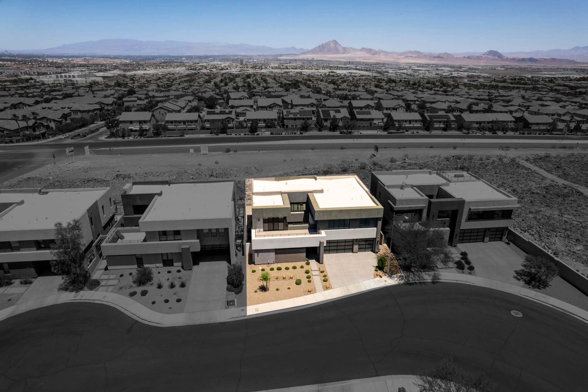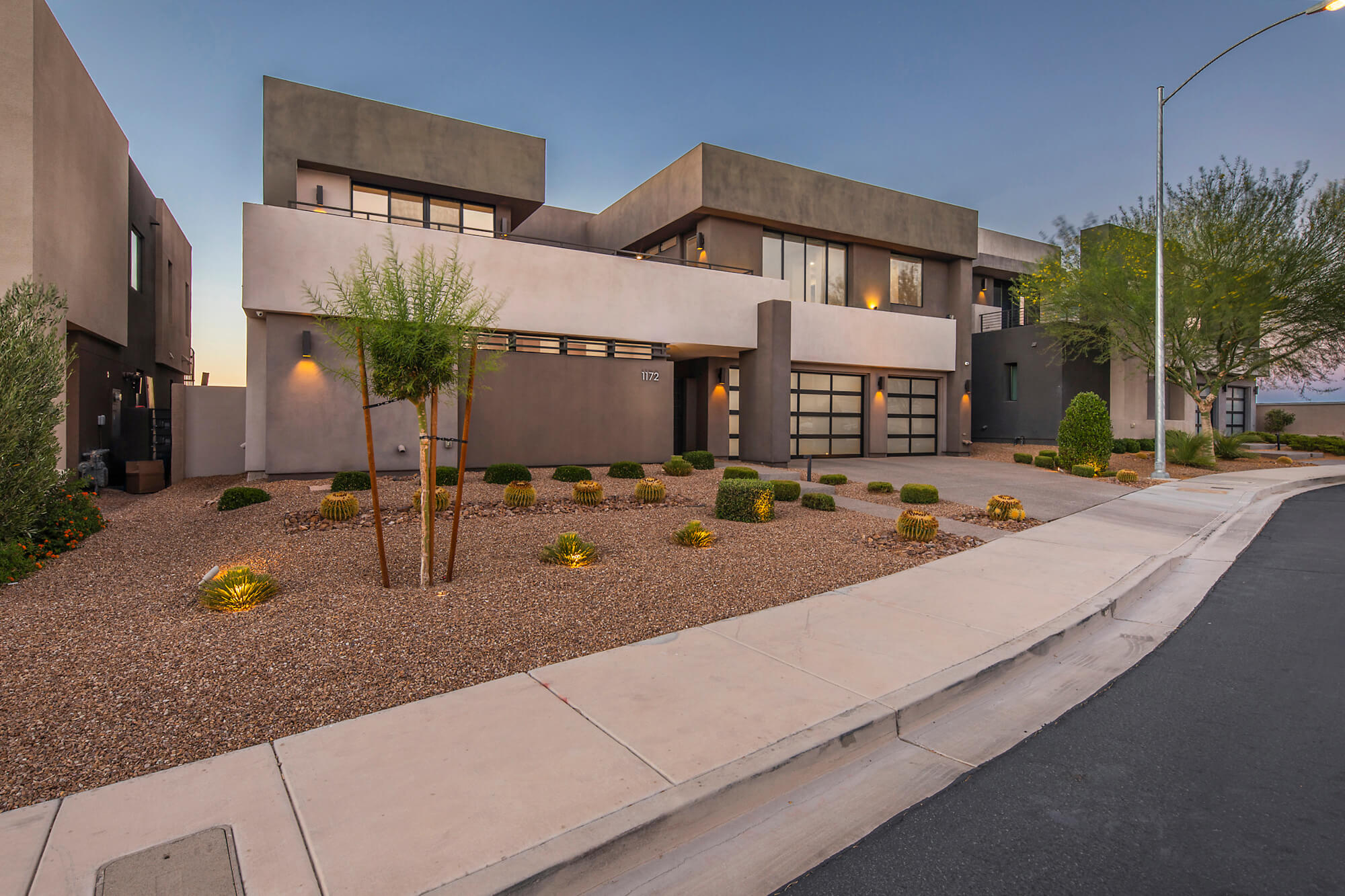 āSymphony In Beigeā is a Blue Heron custom-designed modern desert oasis home. With four bedrooms and 4 baths, this 3,934 sq. ft. house features Las Vegas strip and mountain views from both levels. Enter through a gated courtyard, perfect for enjoying private evenings outdoors, into a great room with custom granite and stone fireplace and floor-to-second-floor ceiling windows with mountain views.
