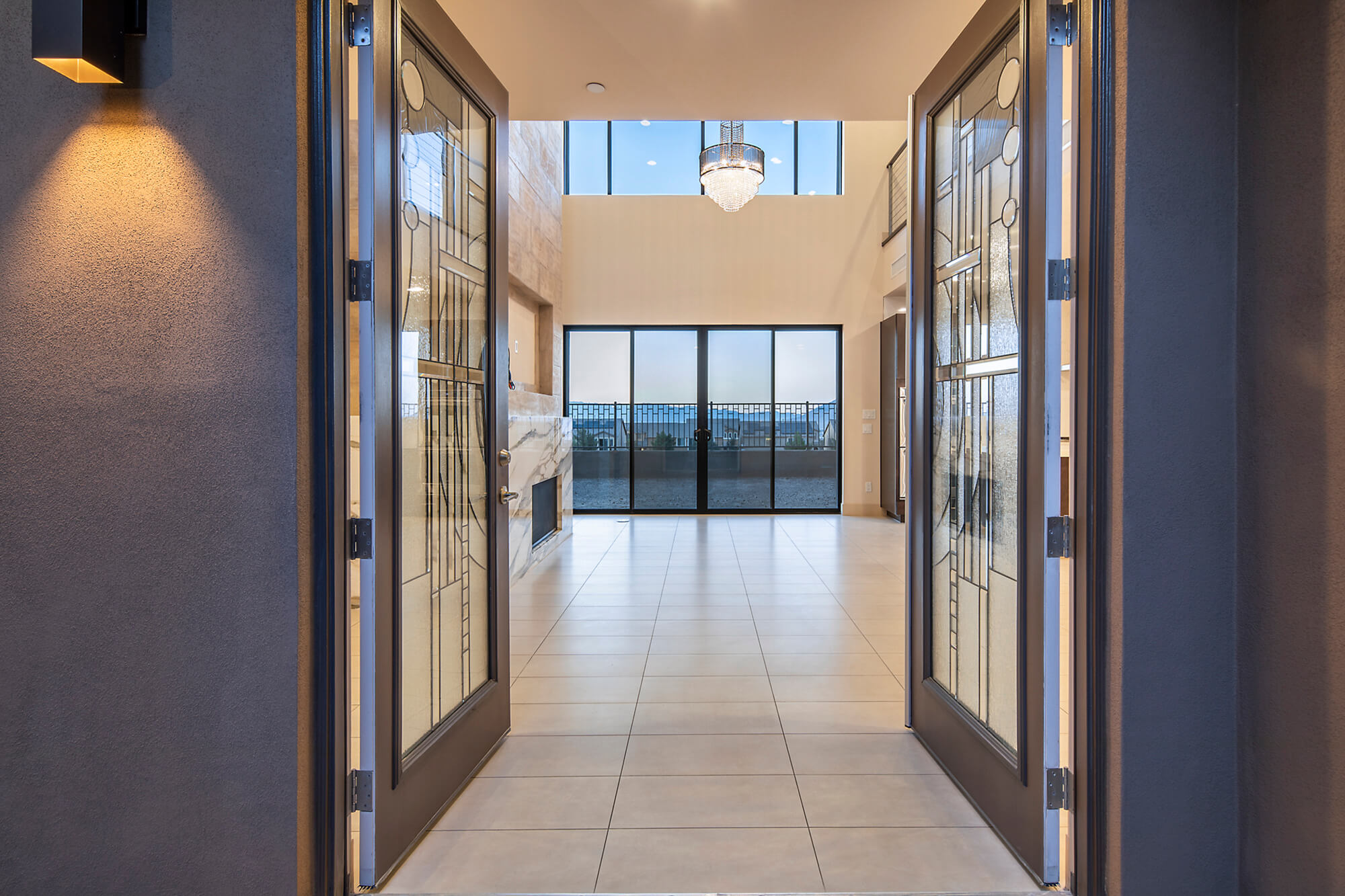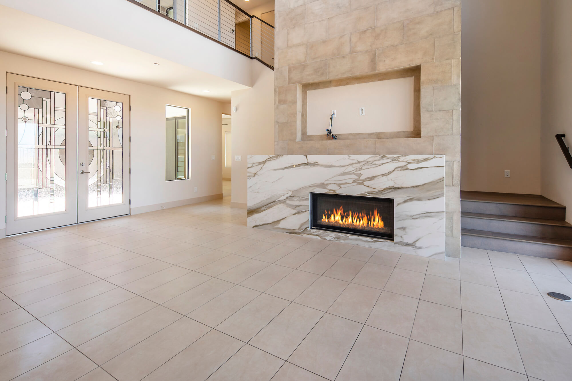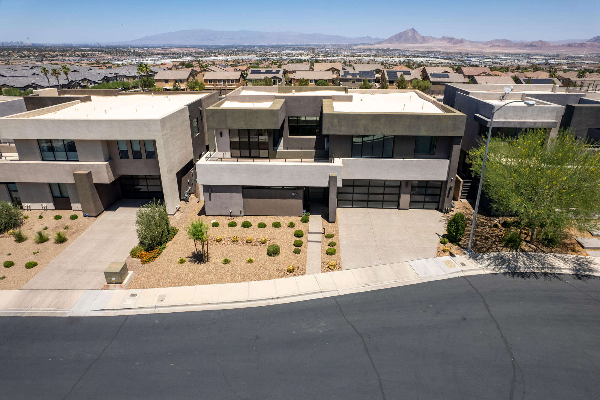āSymphony In Beigeā is a Blue Heron custom-designed modern desert oasis home. With four bedrooms and 4 baths, this 3,934 sq. ft. house features Las Vegas strip and mountain views from both levels. Enter through a gated courtyard, perfect for enjoying private evenings outdoors, into a great room with custom granite and stone fireplace and floor-to-second-floor ceiling windows with mountain views.