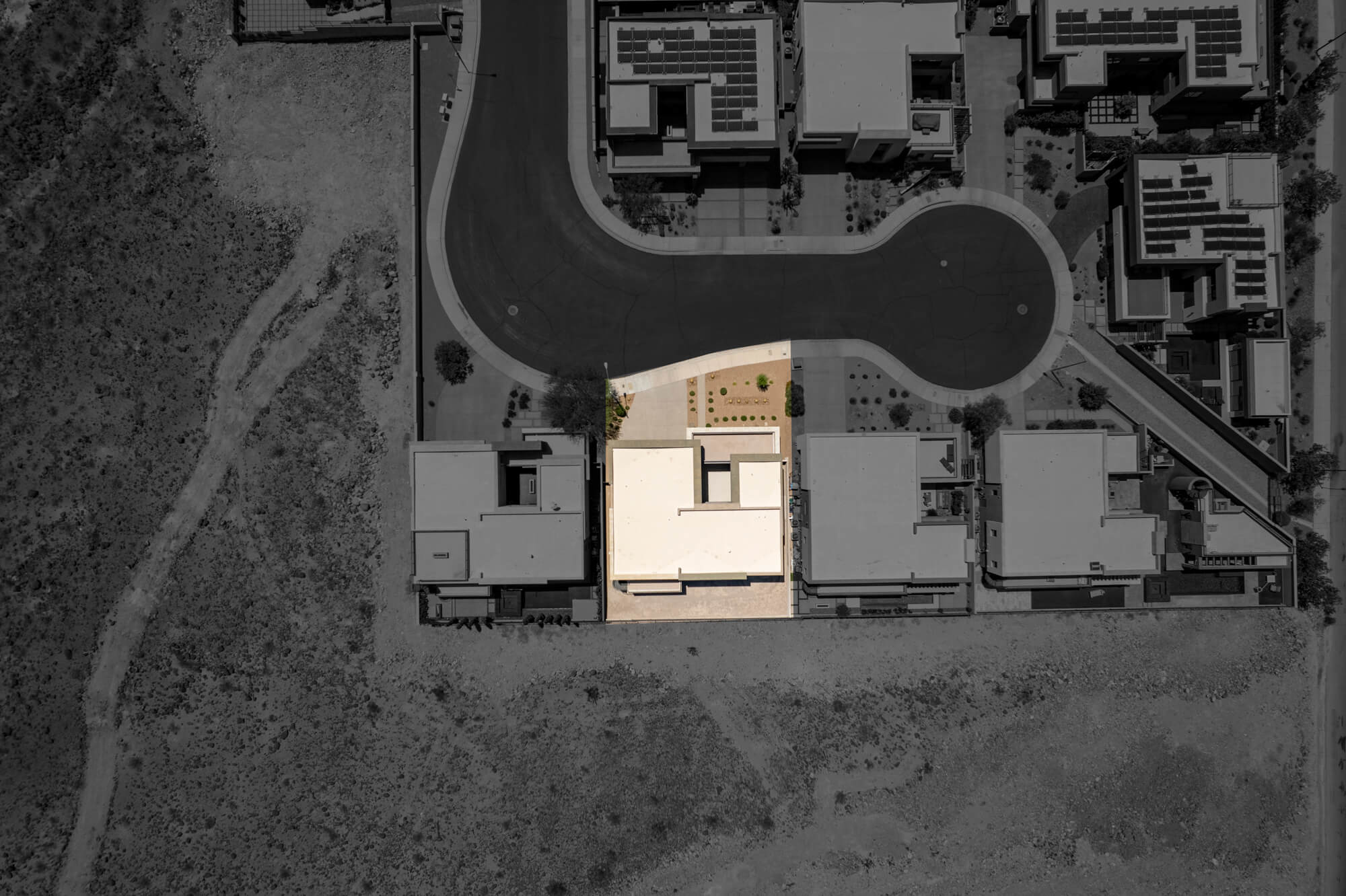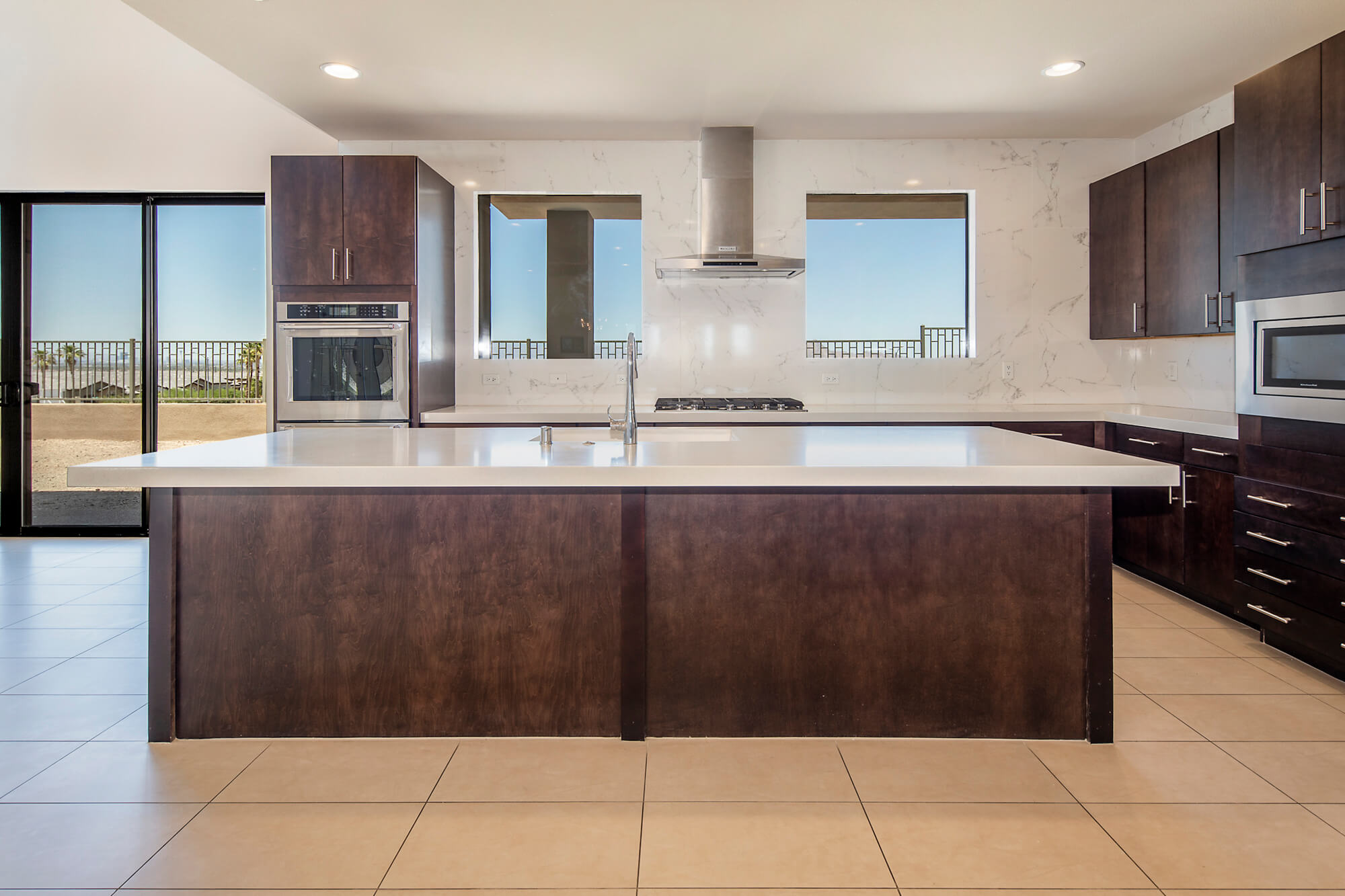 An adjoining chefās kitchen includes an island with bar seating, double ovens, a five-burner cooktop, and all-stainless appliances. The first-level bedroom suite, including a soaking tub, separate walk-in showers and closet with built-in shelving and dresser, opens to the interior courtyard. An office with large bay window completes the first floor. On the second level, a family room overlooks the great room and exits onto a balcony affording those magnificent strip and mountain views.