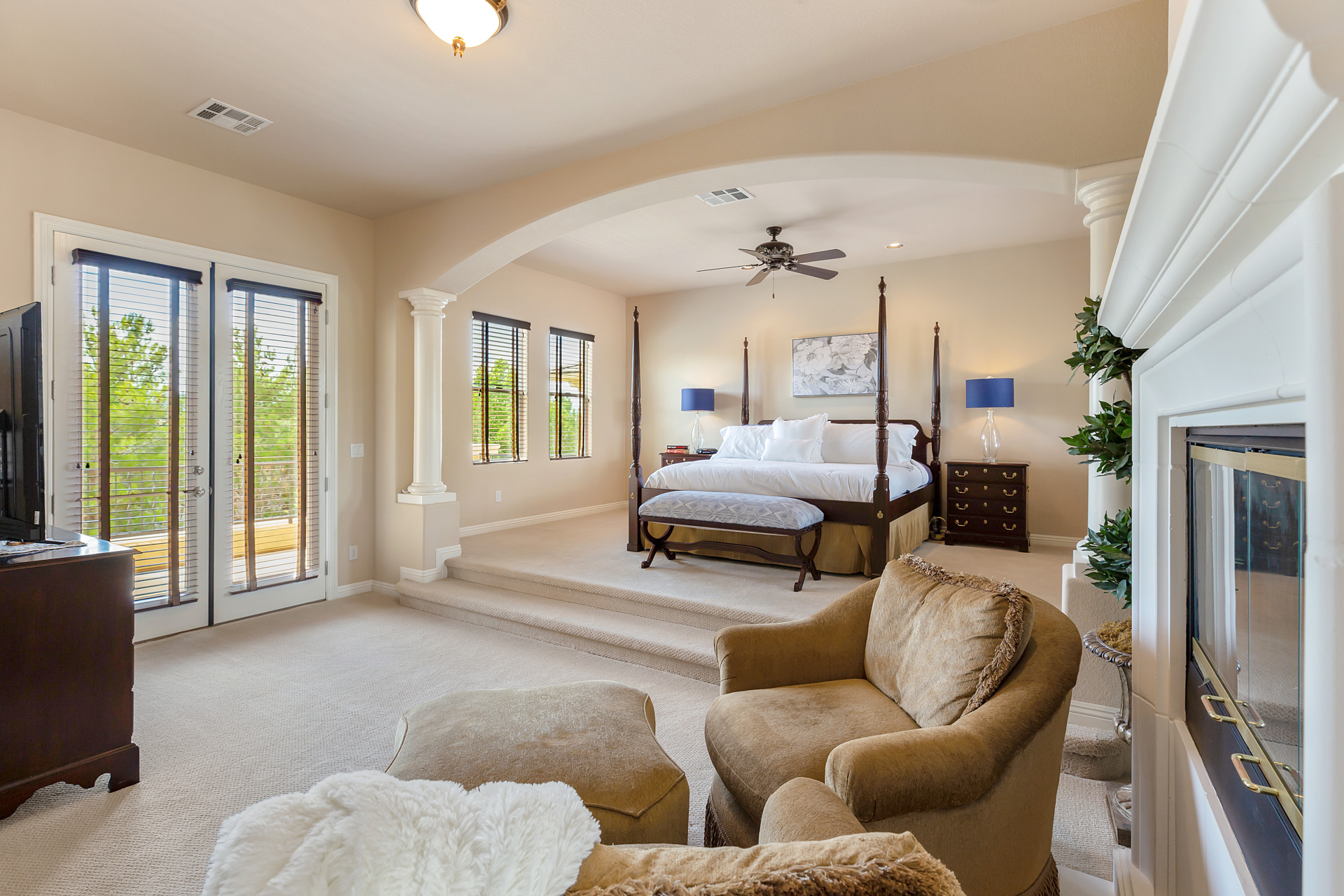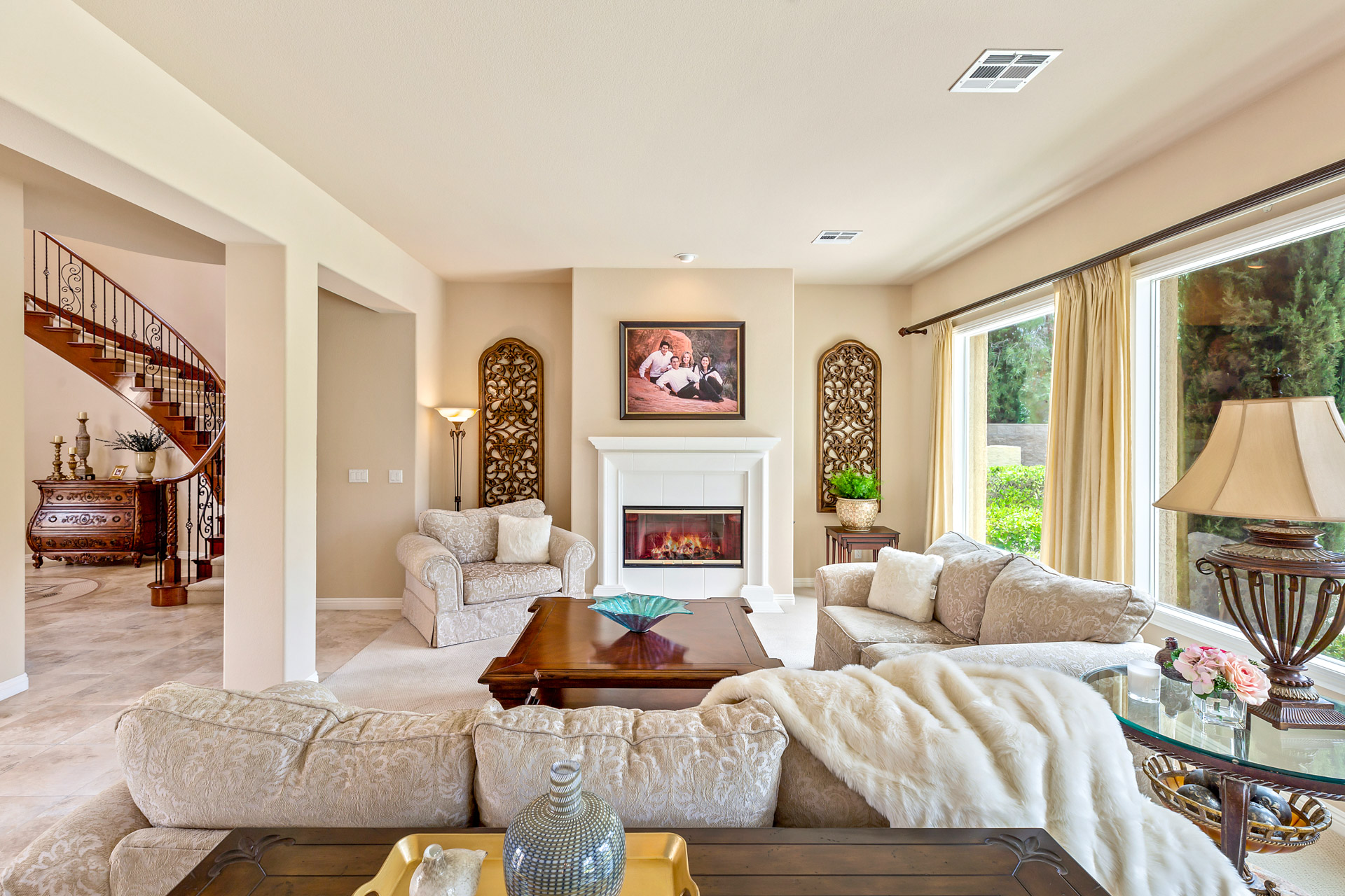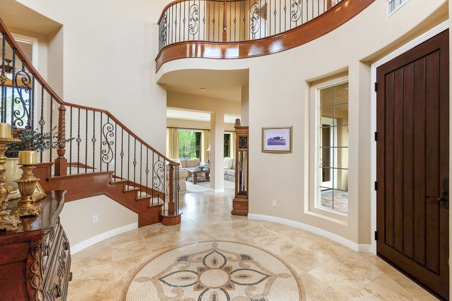 As you approach, the home greets you with an intimate courtyard, a charming oasis adorned with pavers, a fireplace, and a tranquil water fountain. Mature shrubs frame the scene, creating a sense of seclusion and enchantment. Step through the grand entrance, and you are welcomed into a world of architectural brilliance and timeless beauty.