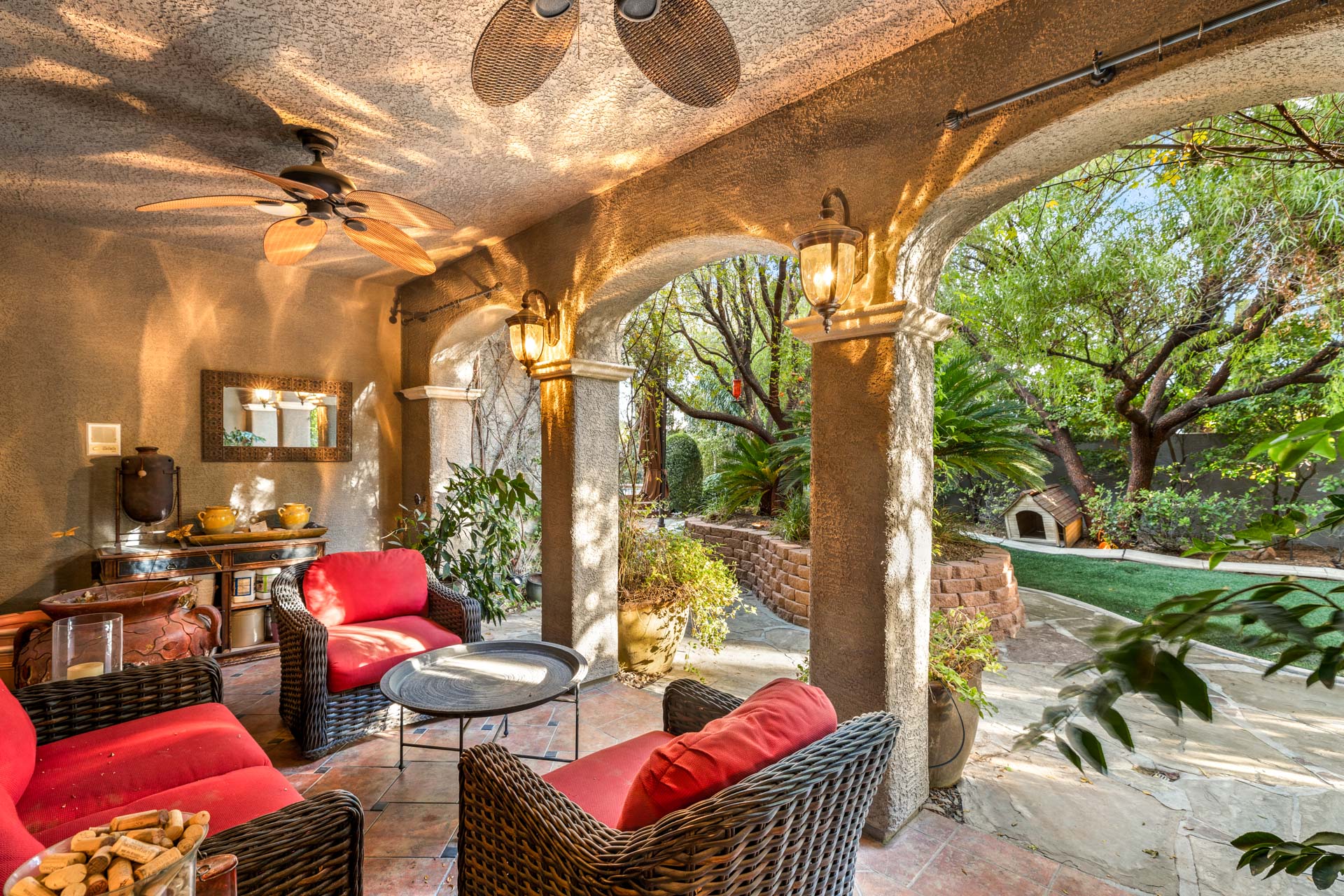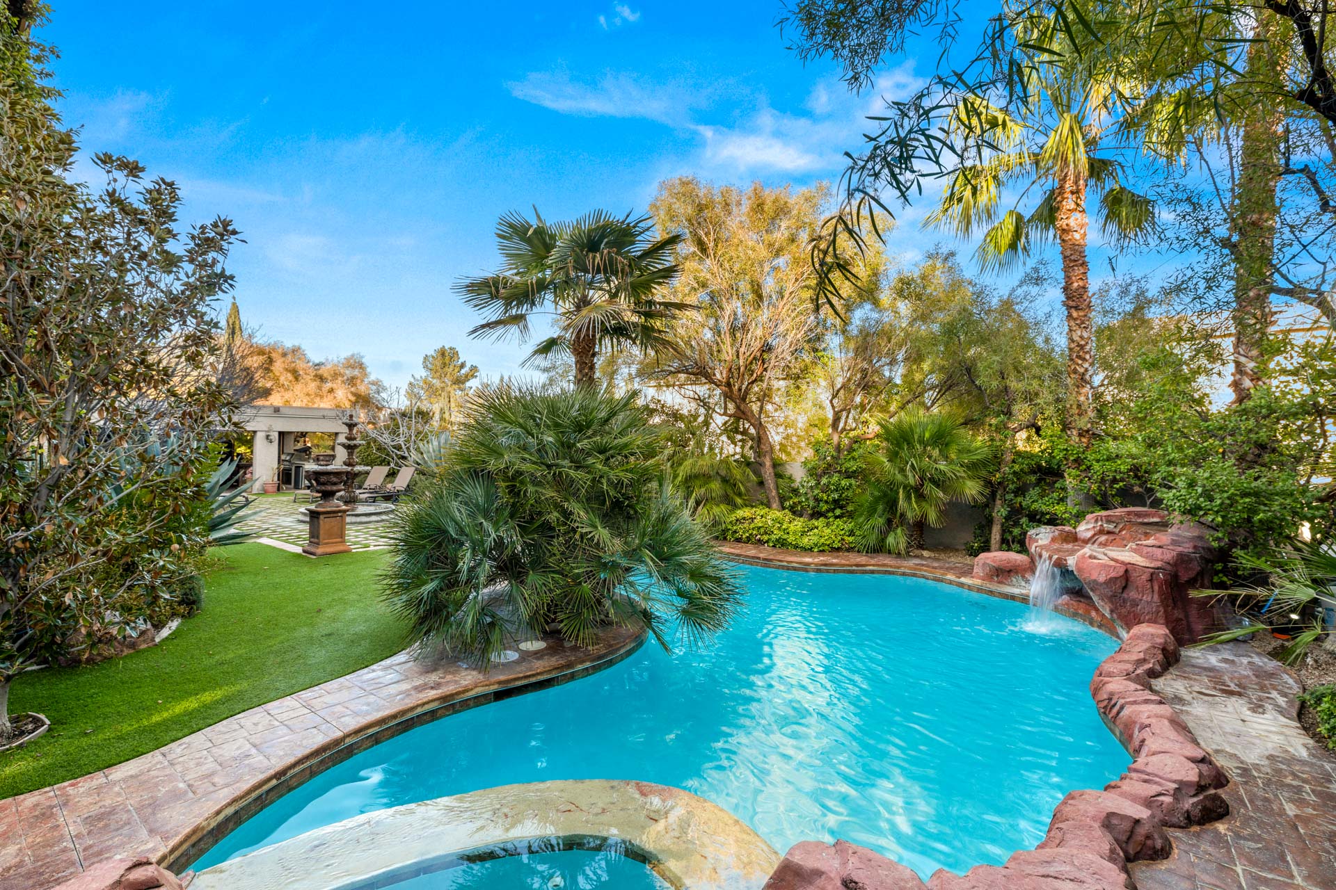 The backyard features a lovely pool, fountain, fire feature, plus a pavilion with kitchen and plenty of room for entertaining.