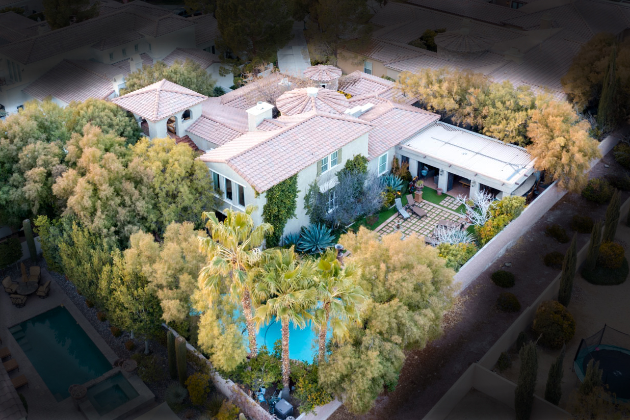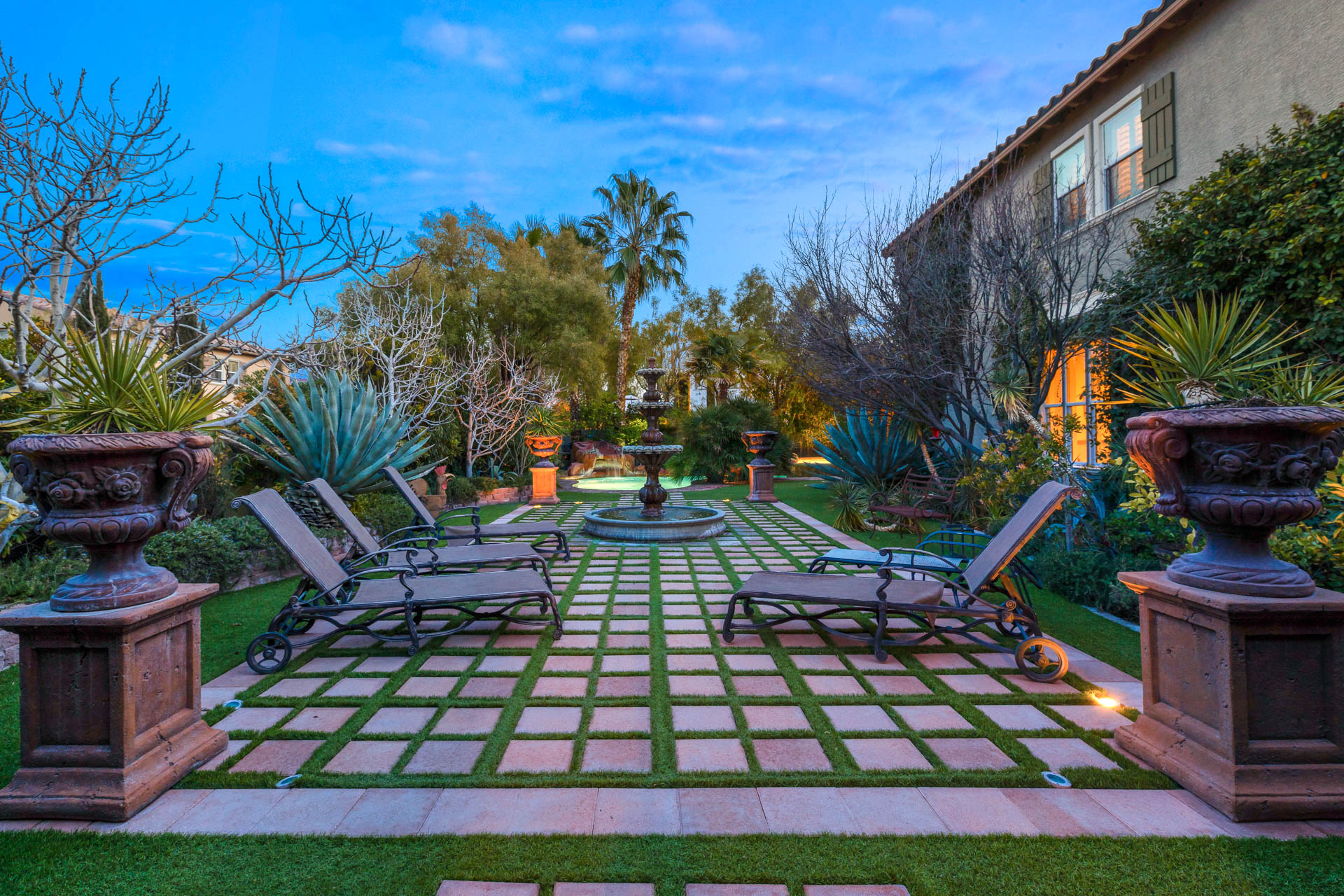 One-of-a-kind Southern Highlands Golf Club home with a .26 acre private homesite. A charming courtyard with mature landscaping and gas fireplace welcome you to this beautiful home. The great room with flagstone floors, gas fireplace and vaulted ceilings is surrounded by 5 sets of french doors that lead to amazing outdoor space.