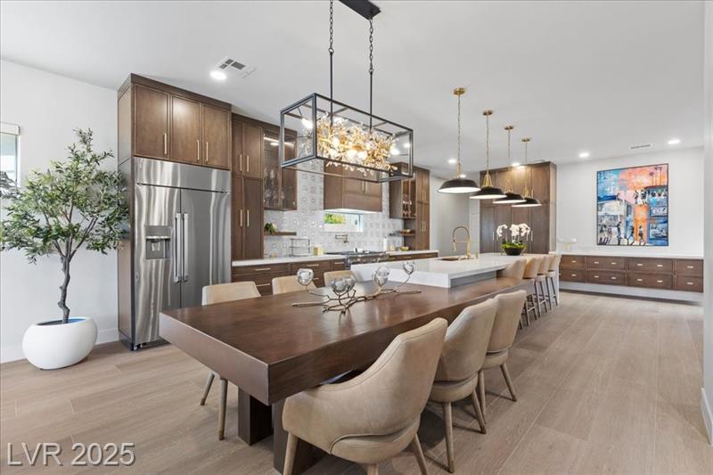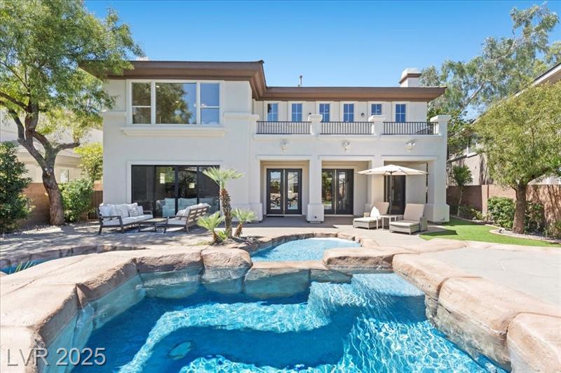 The gourmet kitchen offers a walk-in pantry and oversized island with built-in dining tableāperfect for entertaining. The ownerās suite is a retreat with a two-way fireplace, custom walk-in closet, and private balcony. Additional highlights include a mudroom, two balconies, seller-added upgrades, and versatile living spaces designed for both comfort and style. Outdoors, enjoy a newly resurfaced pebble tech pool, raised spa, waterfall, and lush landscaping. Designer furniture is also available, creating a true move-in ready lifestyle.