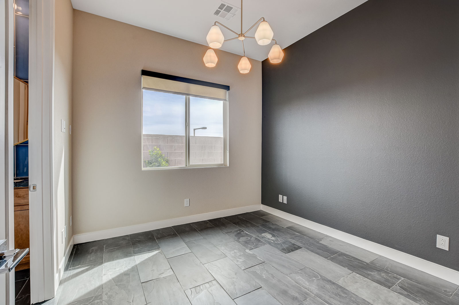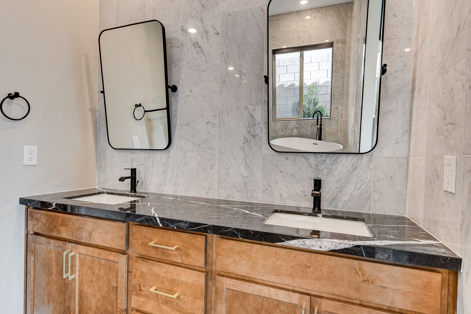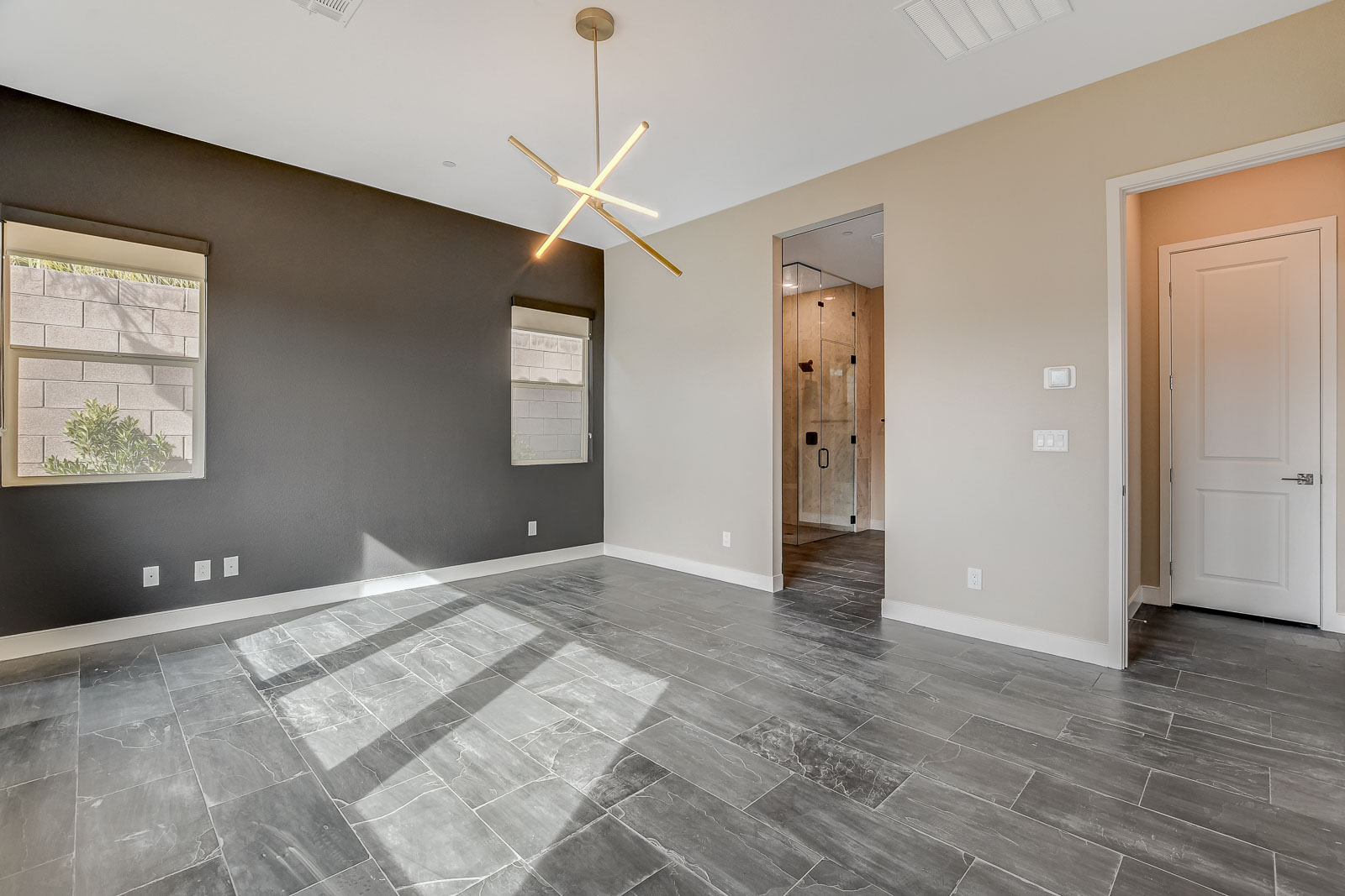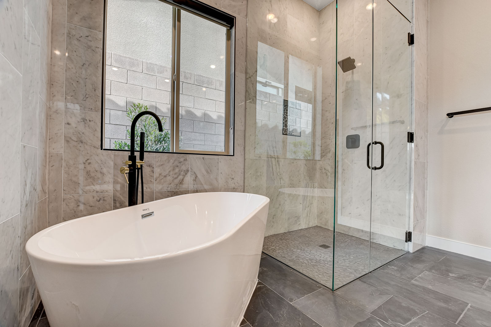 The generous primary suite boasts a spa like bath w/ floor-to-ceiling Carrara marble, glass walk-in shower and stand-alone bathtub. Additional upgrades include, black gauged slate flooring throughout, designer lighting, tankless water heater, increased door heights, vaulted ceilings and finished 3-car garage. No detail was missed in designing this stunning single story home. With all designer light fixtures, upgraded window coverings, floor to ceiling geometric tile in the guest bath, marble countertops throughout. The details are too numerous to list.
