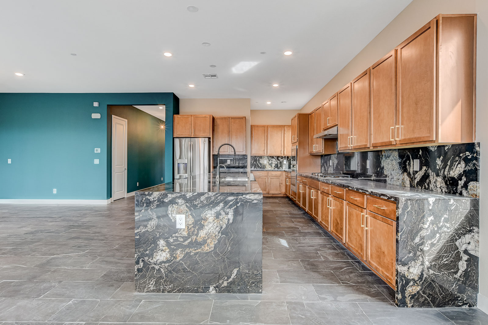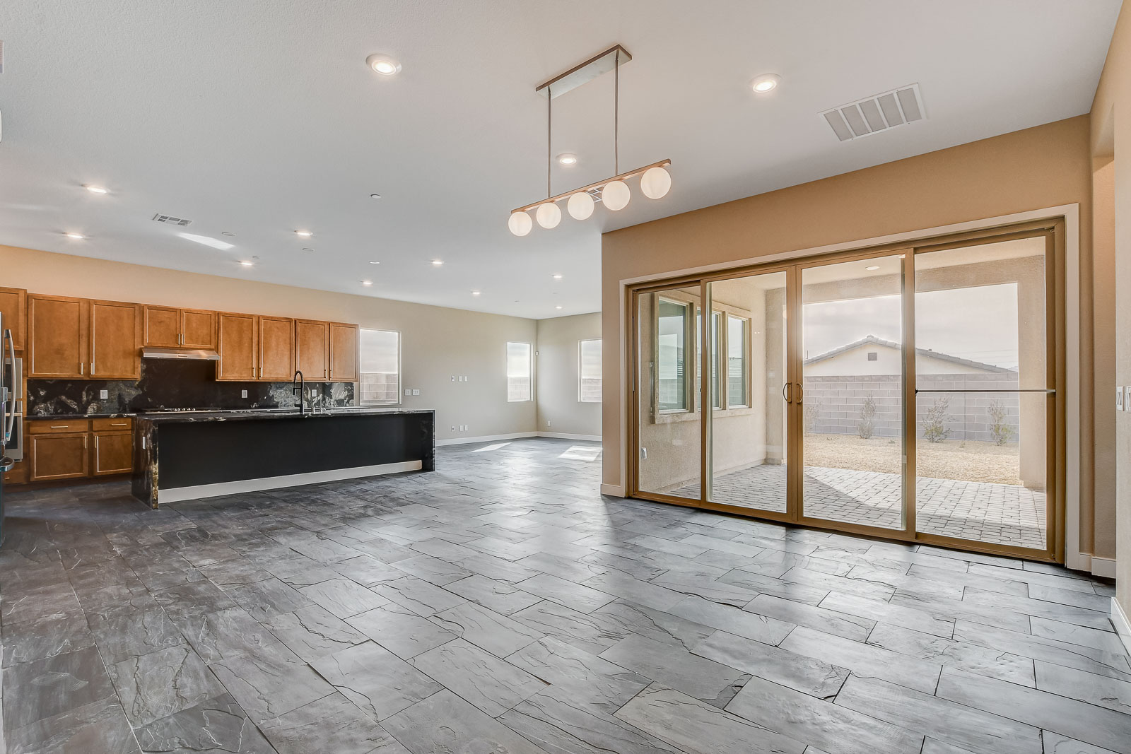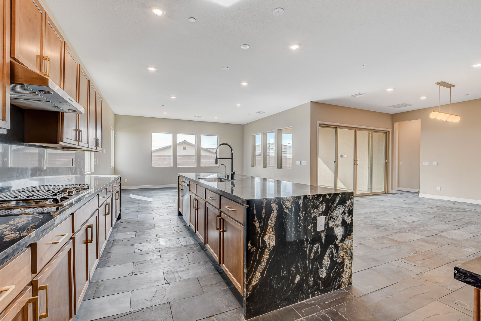 The plan reveals itself as you step into the great room that is the perfect backdrop for any occasion. Open and bright the 4 panel sliding glass doors offer indoor-outdoor living. The chefs kitchen feat. GE Profile appliances, breathtaking stone countertops, full backsplash, island w/ waterfall edge and extra thick bullnose.