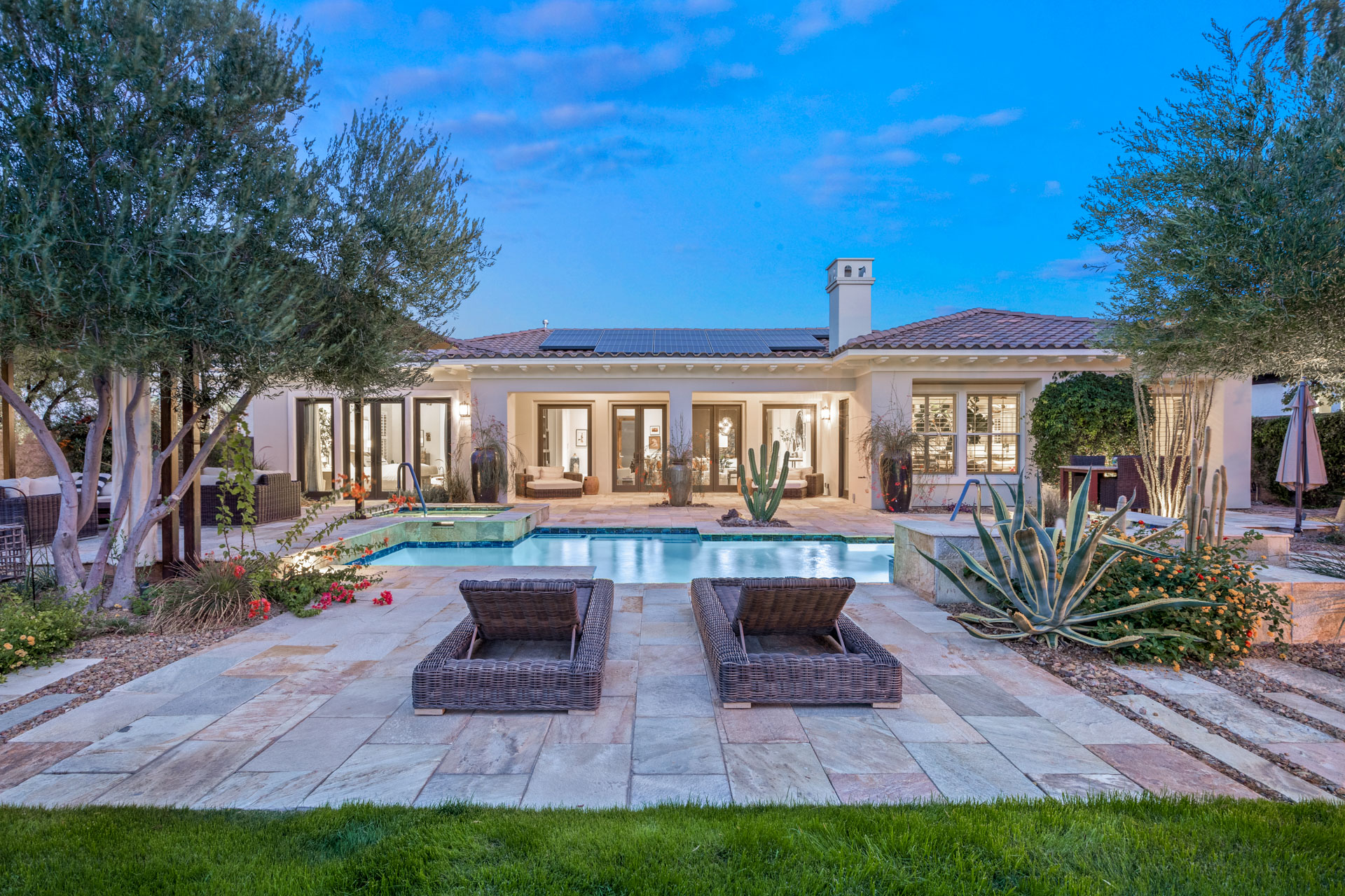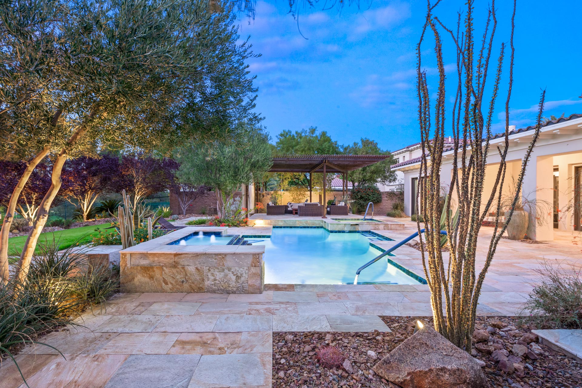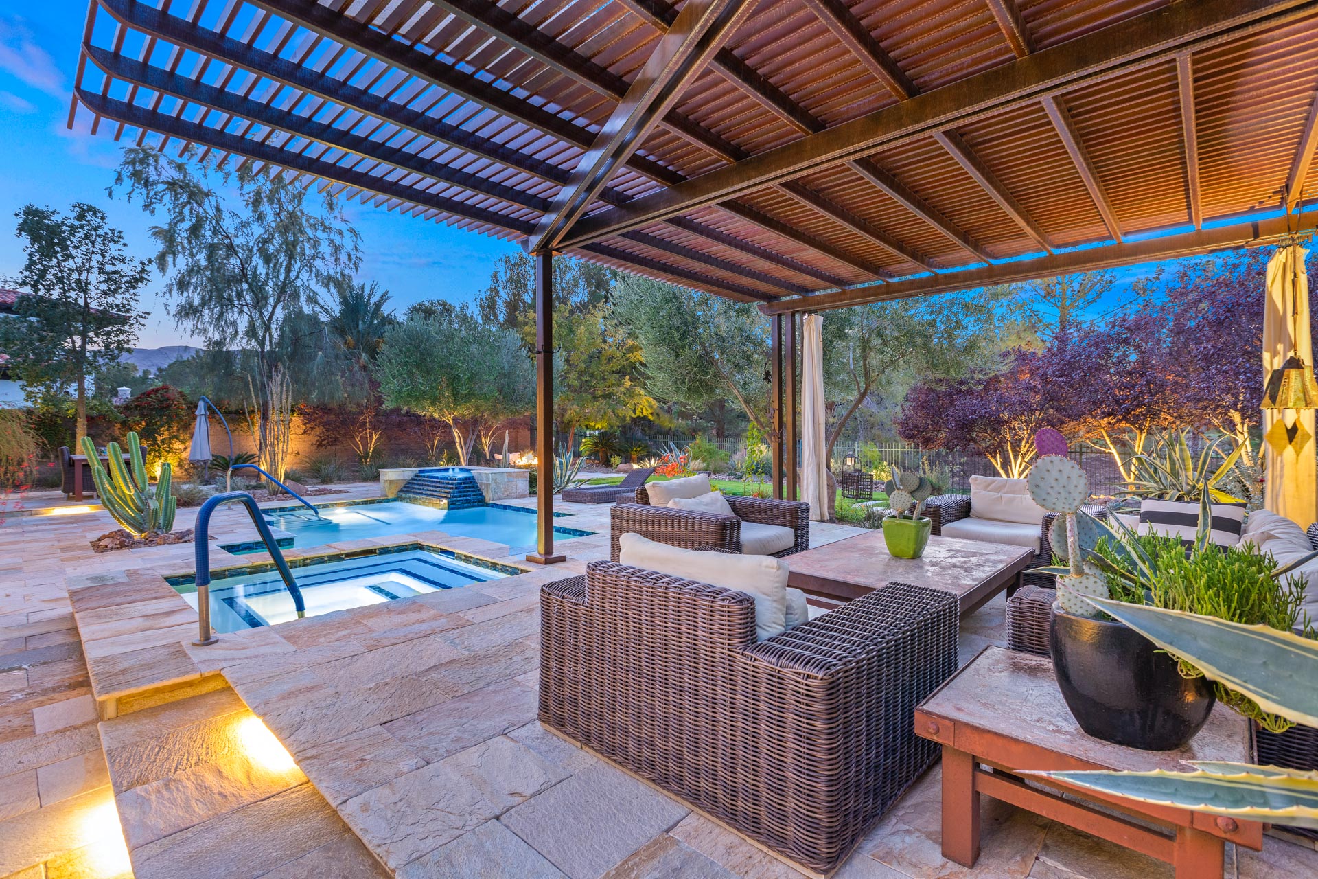 Multiple sets of doors open to the covered patio and pool area. When you step outside, the mature desert landscaping provides privacy for refreshing dips in the pool or relaxing in the spa. Beautiful slate stone surrounds the pool and seating areas. An elevated metal pergola offers dramatic views of the yard and golf course beyond.
