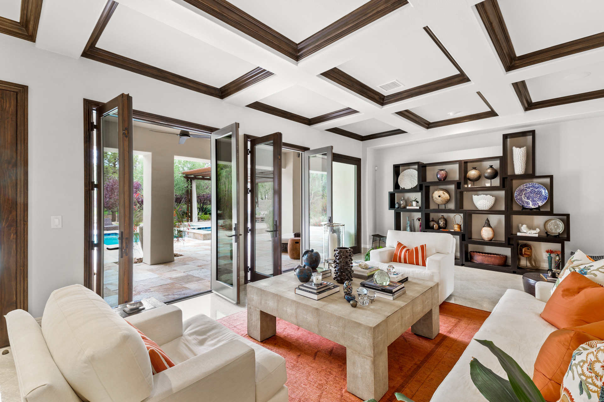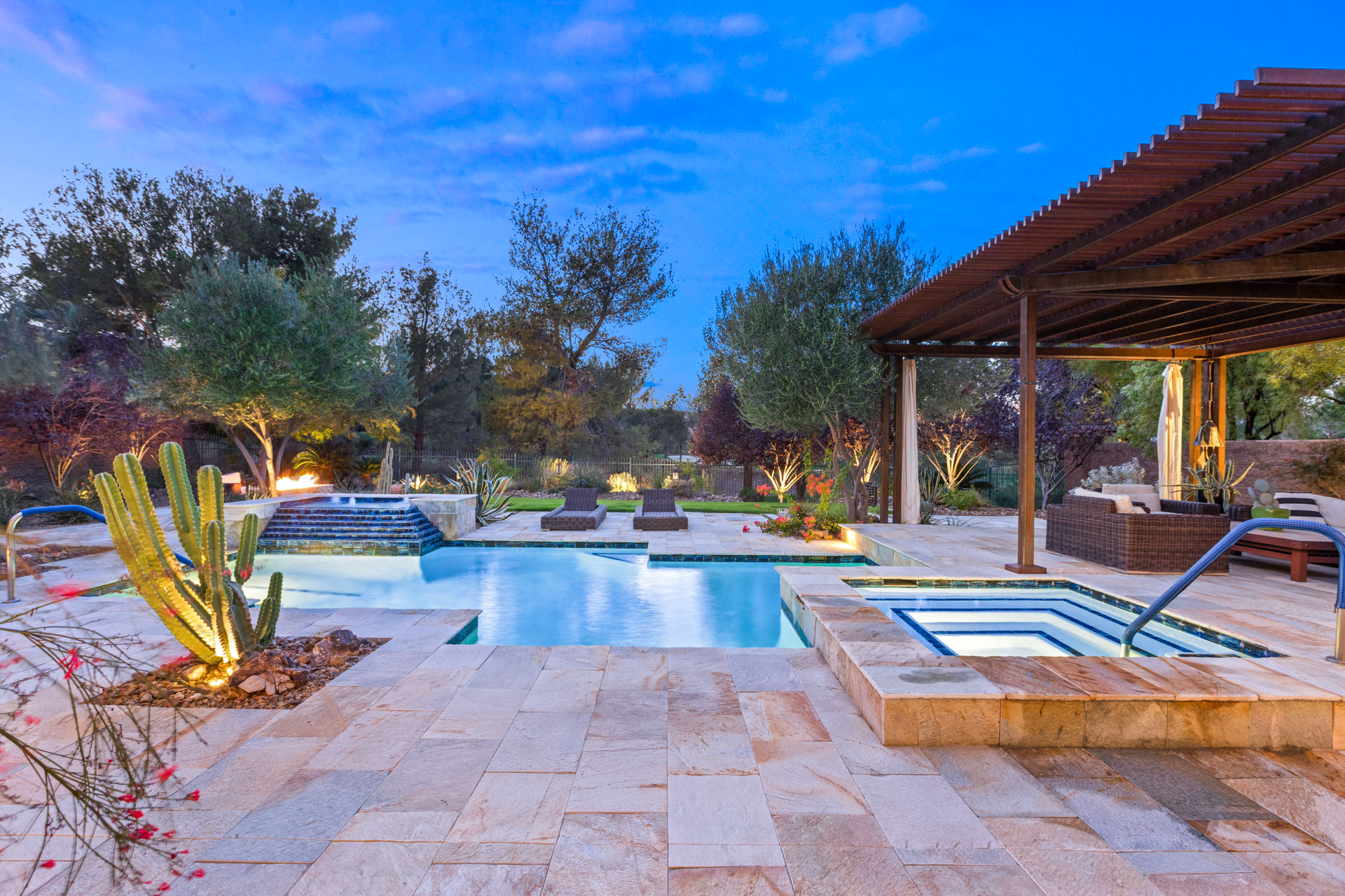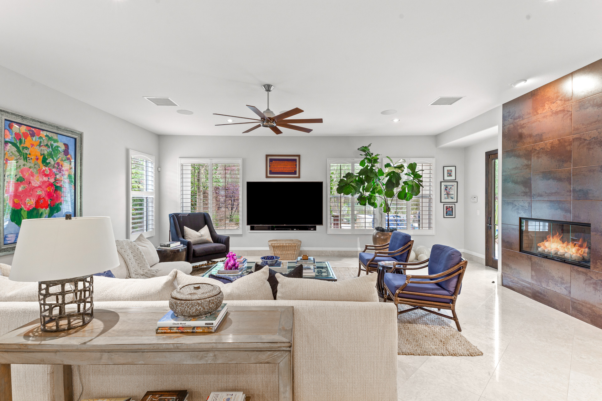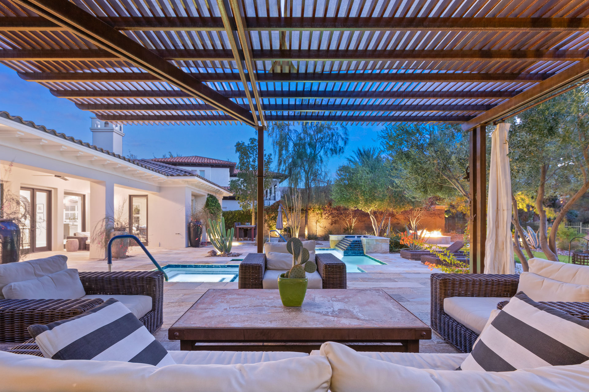 Multiple sets of doors open to the covered patio and pool area. When you step outside, the mature desert landscaping provides privacy for refreshing dips in the pool or relaxing in the spa. Beautiful slate stone surrounds the pool and seating areas. An elevated metal pergola offers dramatic views of the yard and golf course beyond.