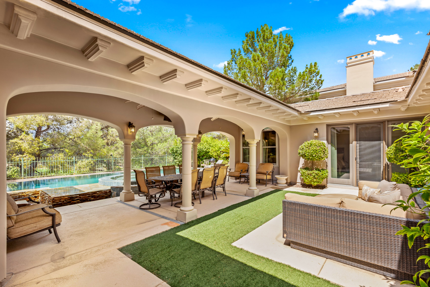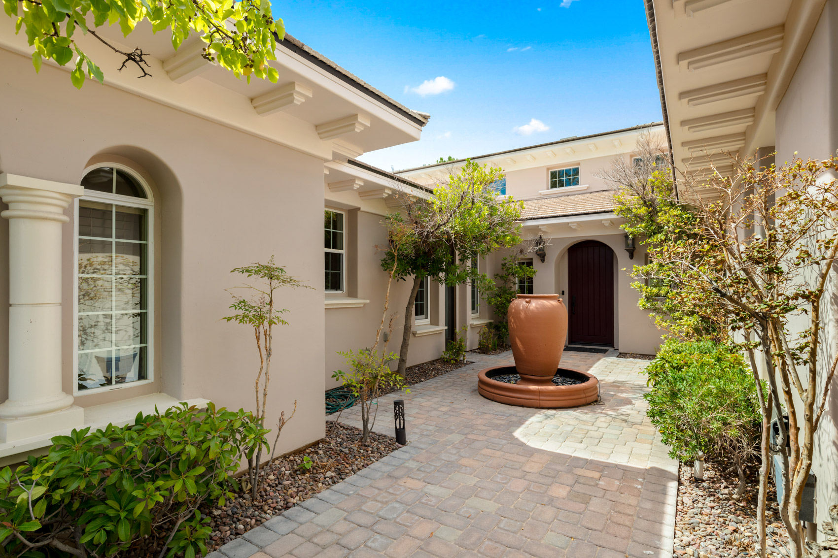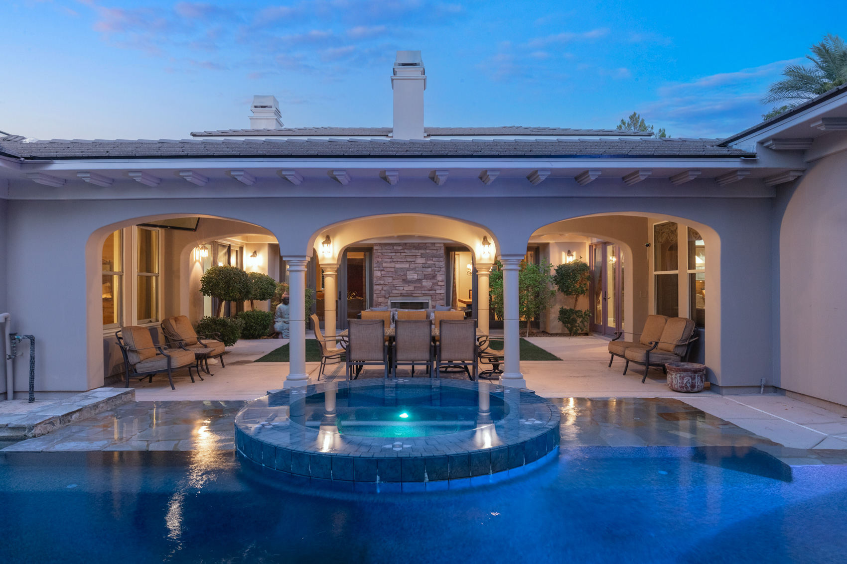 This home offers a spacious kitchen with large island, high-end appliances and is located adjacent to the family room. A generous primary suite with large walk-in closet and spa-like bath offers views to the courtyard and golf course. There are 2 en suite guest bedrooms plus a well appointed office with built-in bookcases and a wood ceiling with access to the front courtyard. The lush backyard has a courtyard with outdoor fireplace that leads to a covered patio, zero edge pool and spa.