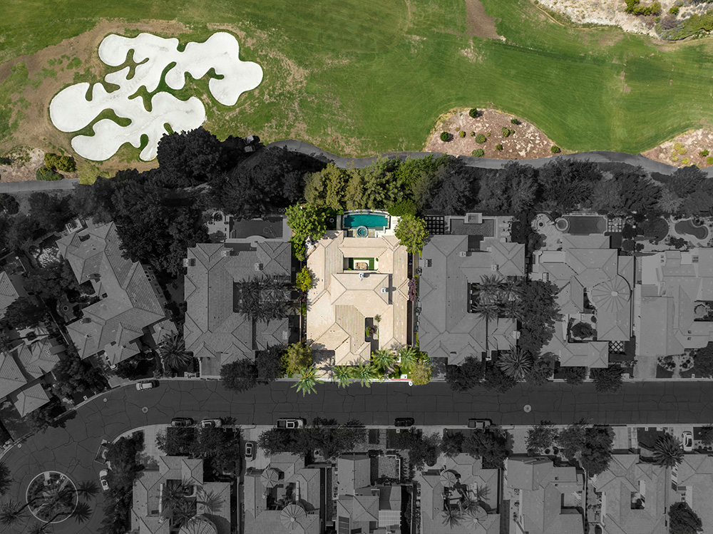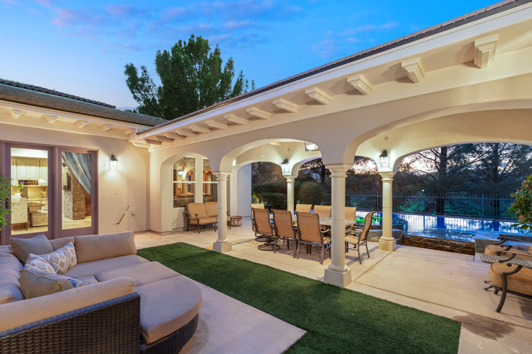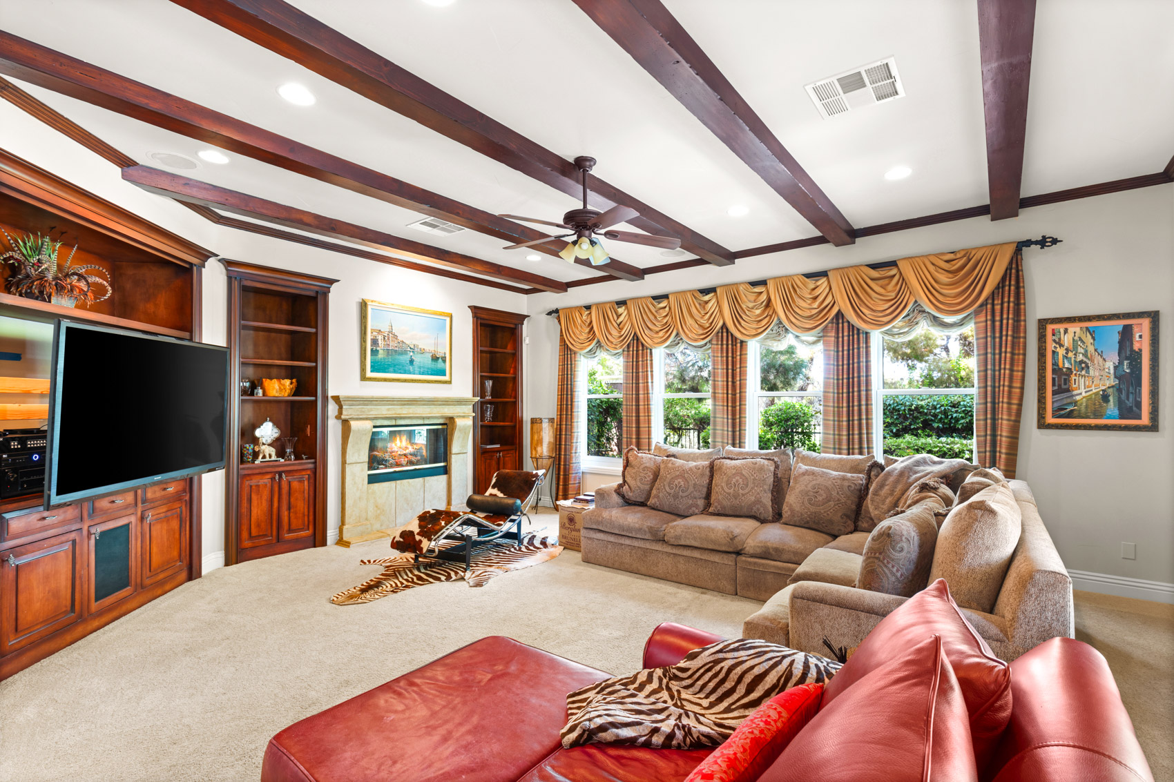 This home offers a spacious kitchen with large island, high-end appliances and is located adjacent to the family room. A generous primary suite with large walk-in closet and spa-like bath offers views to the courtyard and golf course. There are 2 en suite guest bedrooms plus a well appointed office with built-in bookcases and a wood ceiling with access to the front courtyard. The lush backyard has a courtyard with outdoor fireplace that leads to a covered patio, zero edge pool and spa.