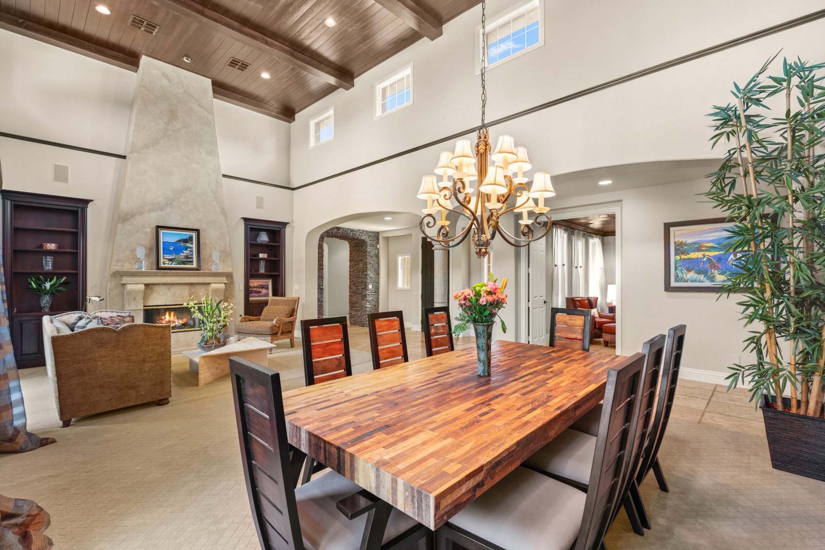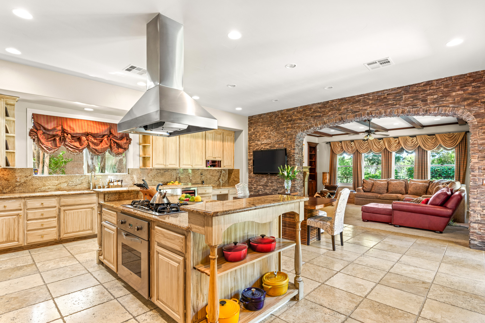 Interiors feature high ceilings and wonderful natural light. Luxurious finishes include travertine floors, stone countertops, wood ceilings in double-height living/dining room, wood beams in the family room and 3 gas fireplaces.