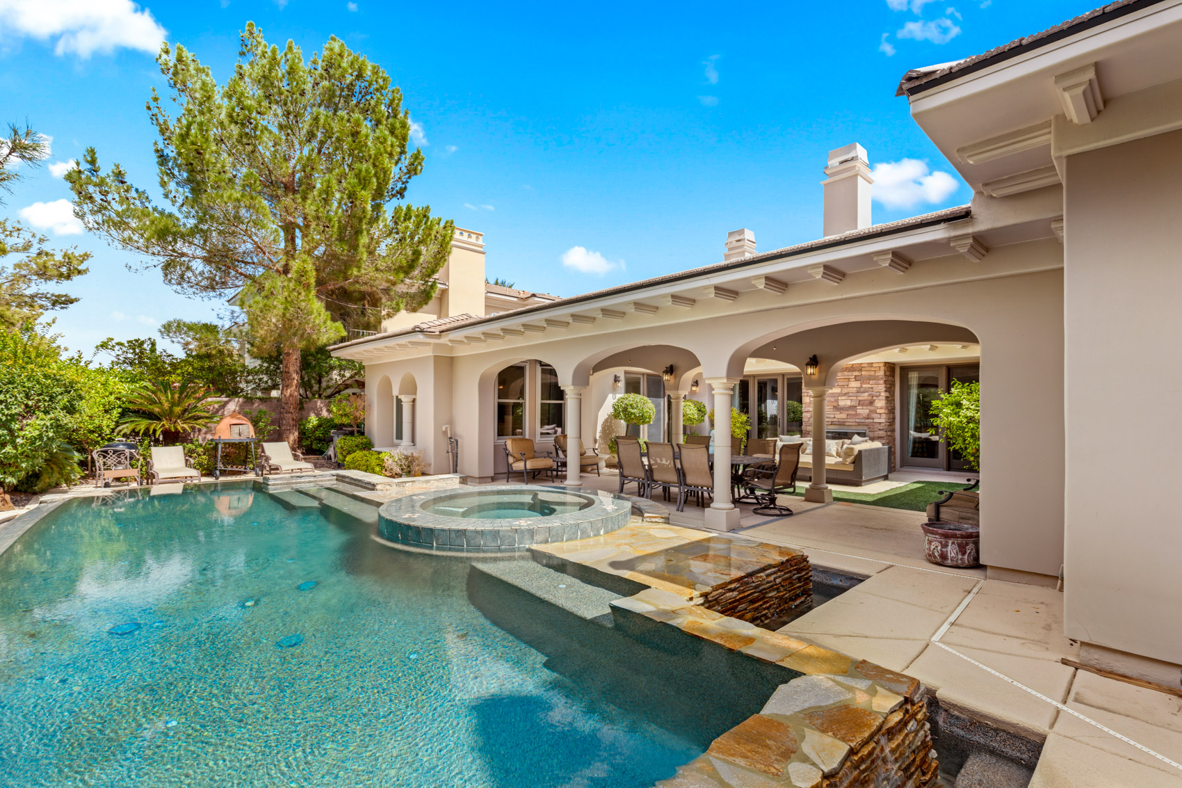 Gorgeous single story home on an elevated homesite overlooking Southern Highlands Golf Course. This mediterranean-style house has tremendous curb appeal with a smooth stucco exterior and a welcoming entry with a water feature.