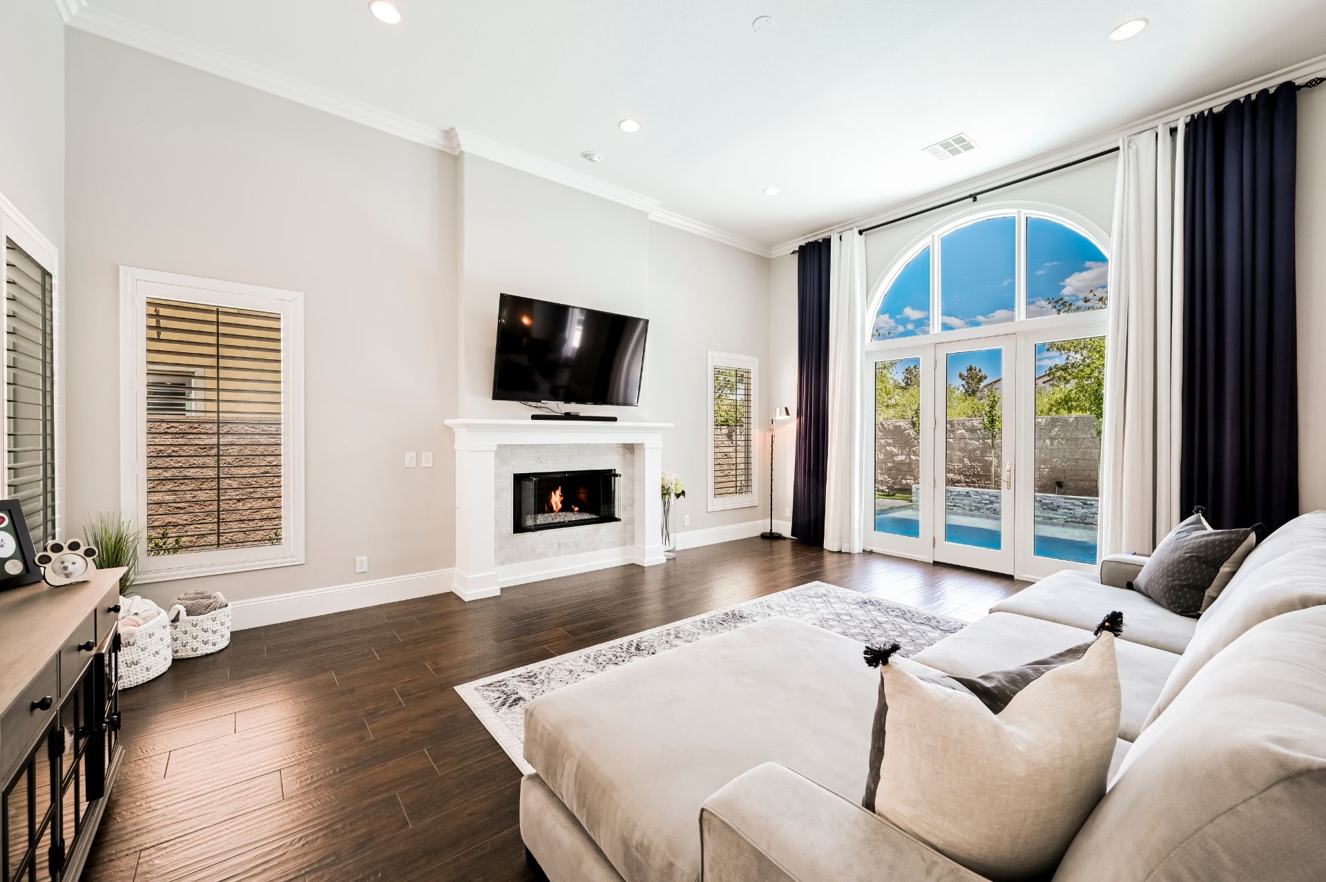 Two additional bedrooms and baths are on the ground level, but nicely separated from living and entertainment space. Wood-look ceramic floors and light colors unify the interiors, with large expanses of glass to blur the lines between indoors and out. An open-plan great room leads to a well-equipped kitchen with breakfast bar, casual dining space, wine fridge, and a cozy fireplace. It serves as the undisputed "heart of the home".