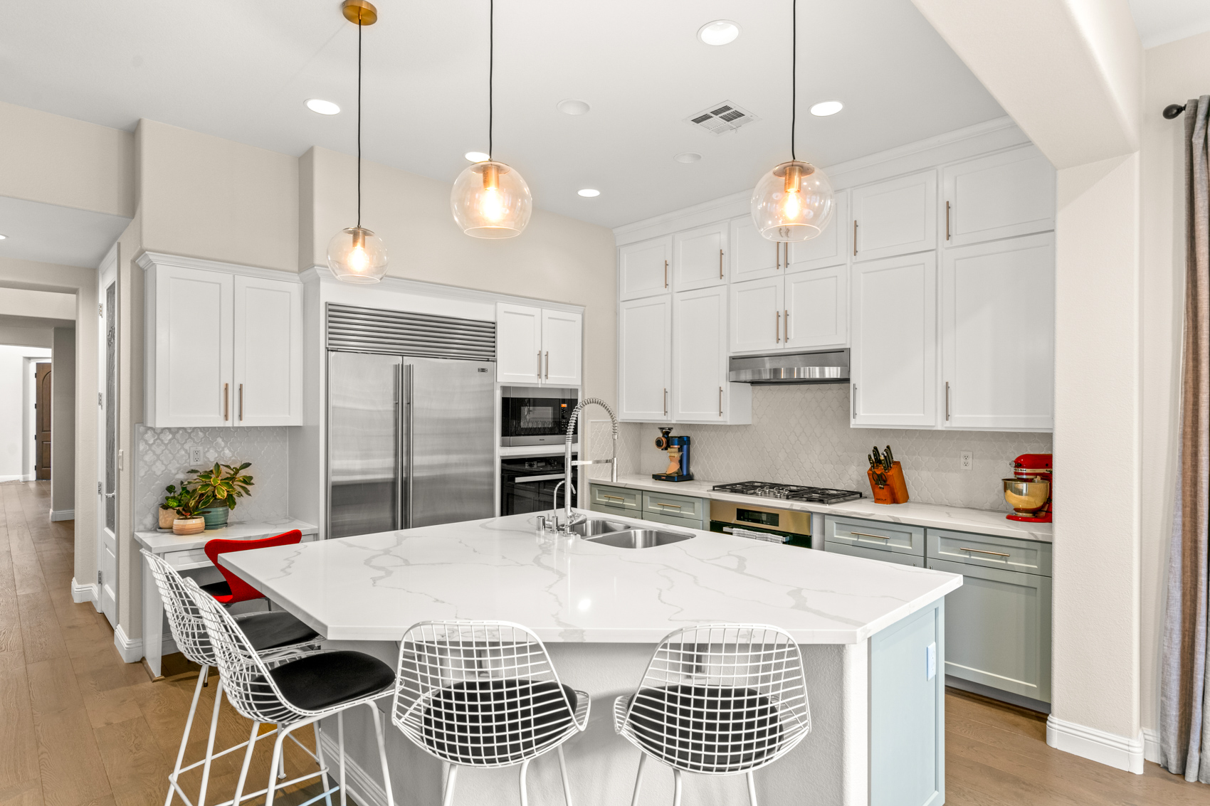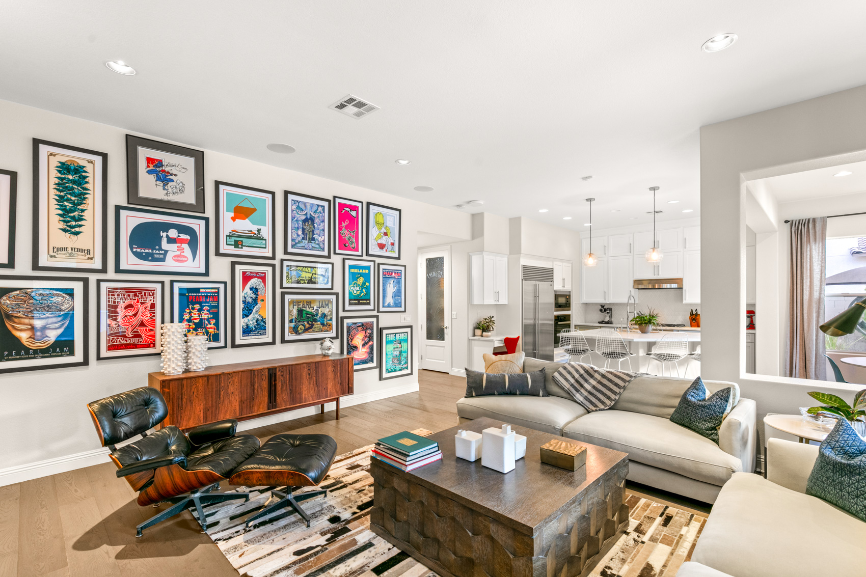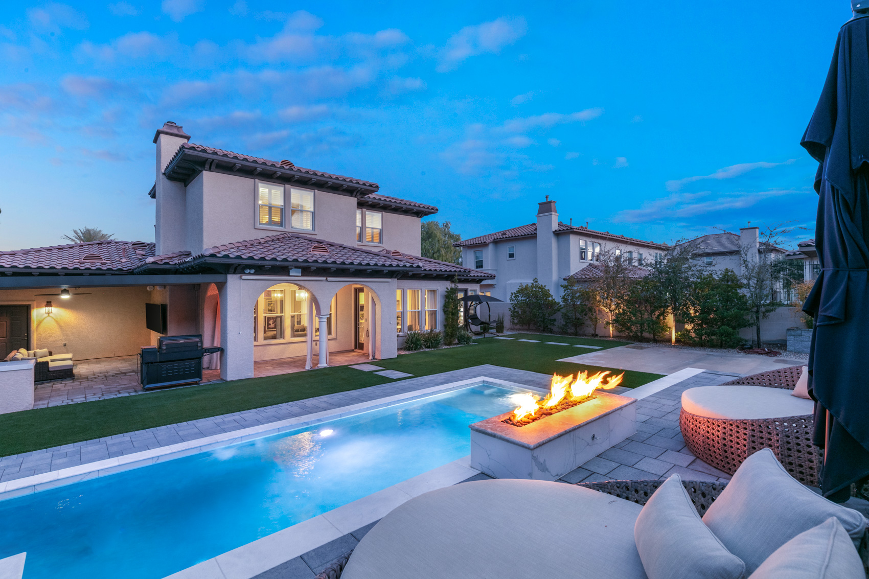 Highlights include a modern pool, elevated firepit, sport court area, built-in BBQ and a covered patio for outdoor lounging. The upscale interior features hardwood floors throughout, designer lighting fixtures, and special details like patterned tile.