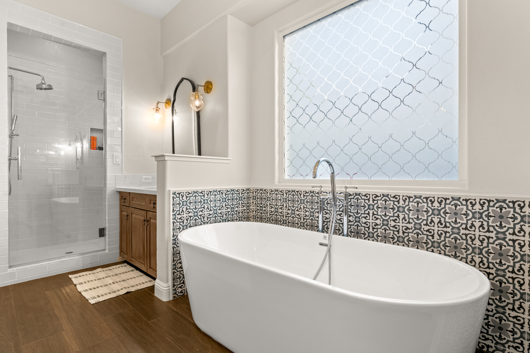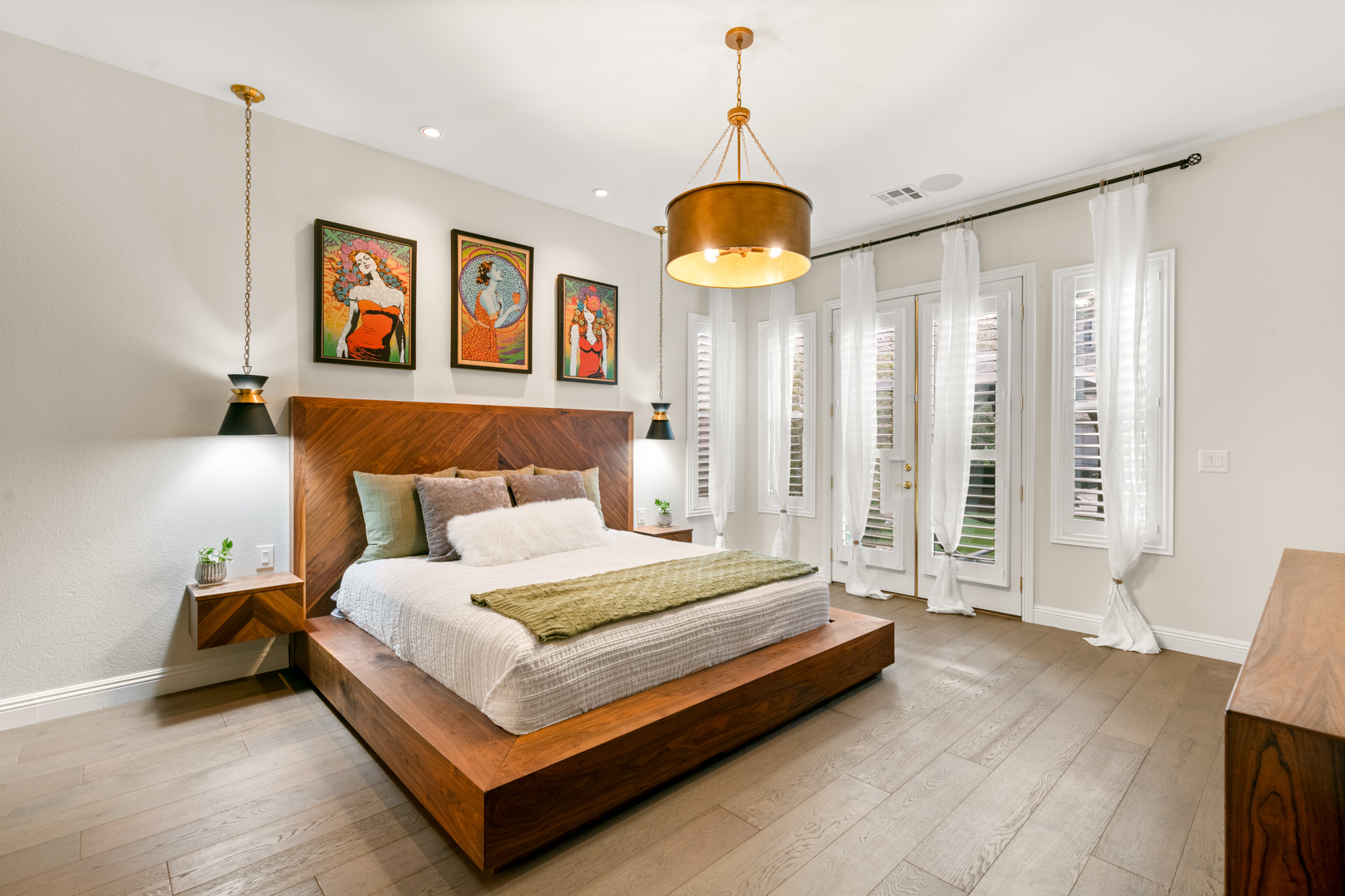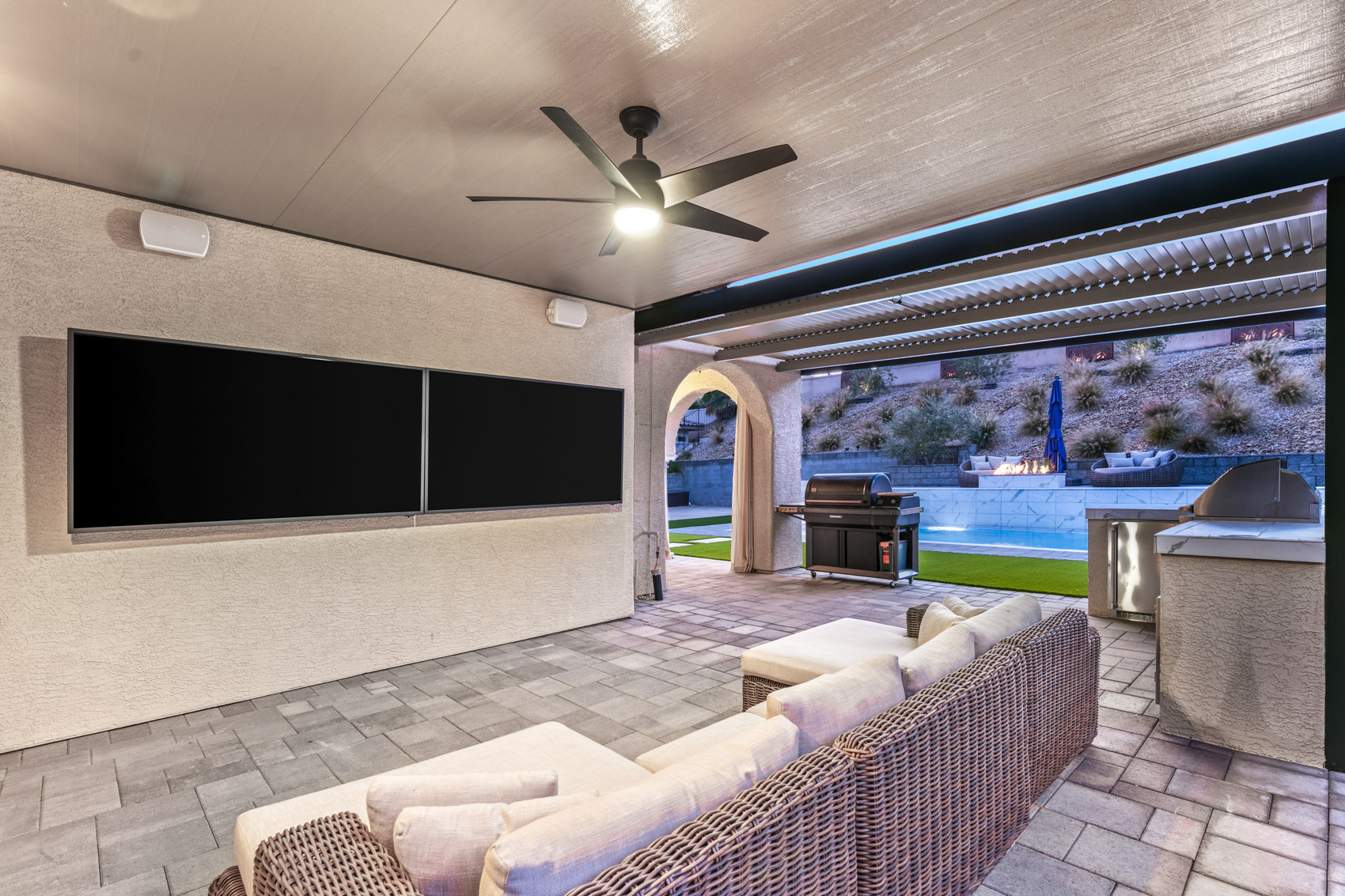 Highlights include a modern pool, elevated firepit, sport court area, built-in BBQ and a covered patio for outdoor lounging. The upscale interior features hardwood floors throughout, designer lighting fixtures, and special details like patterned tile.