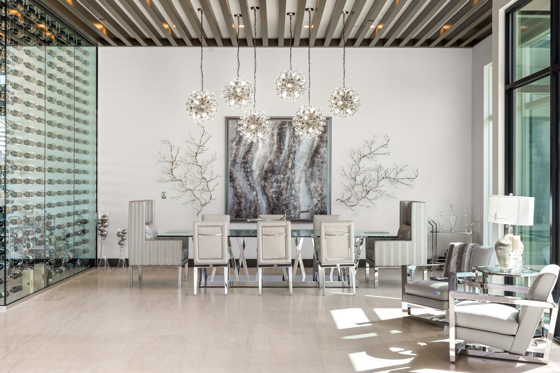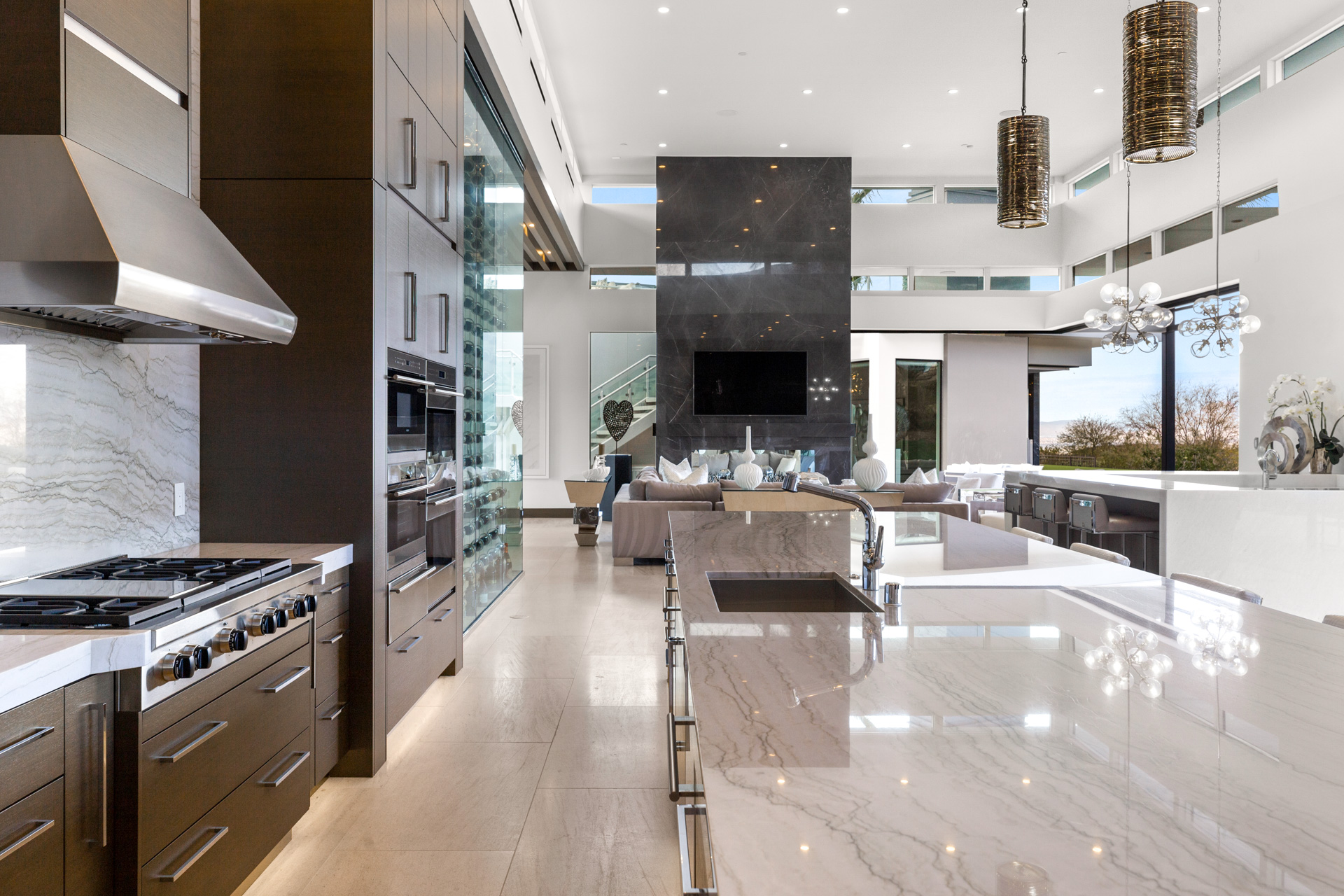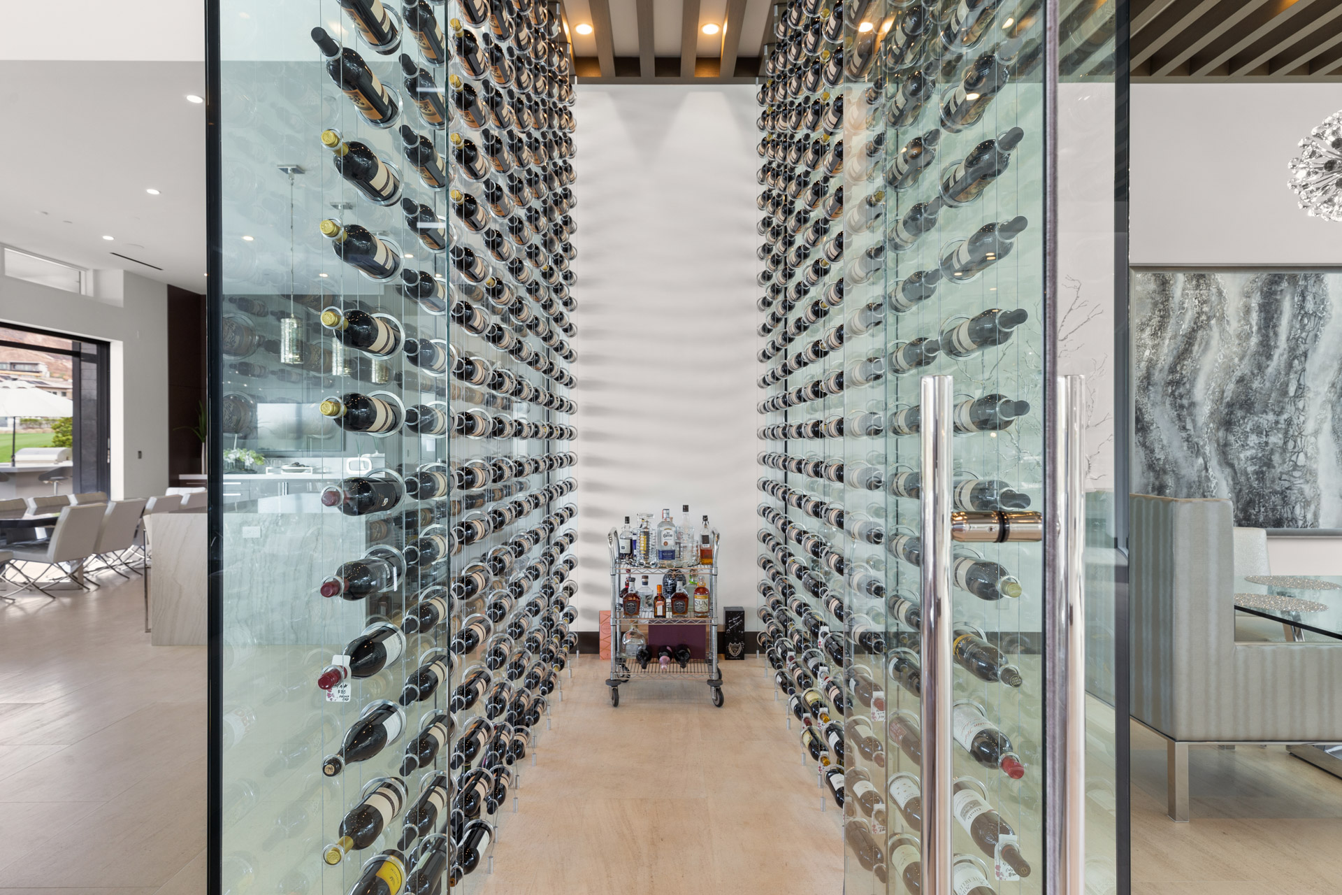 With expertly crafted finishes, such as imported marble floors, bold wooden accents, floor-to-ceiling windows with folding doors, and ultra sleek fireplaces, no detail is overlooked in this extravagant estate. At the homeās epicenter is the chefās kitchen, featuring a dramatic waterfall kitchen island, custom cabinetry, professional-grade appliances, and a temperature-controlled wine cellar off the kitchen.