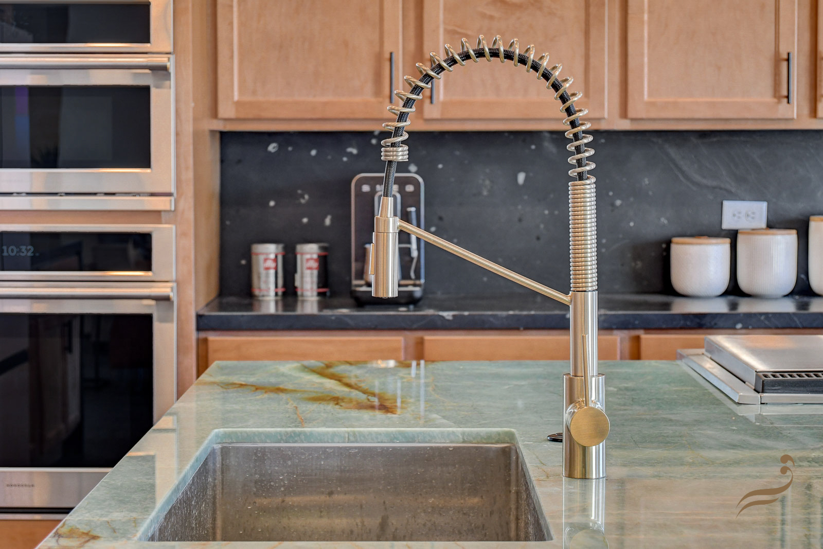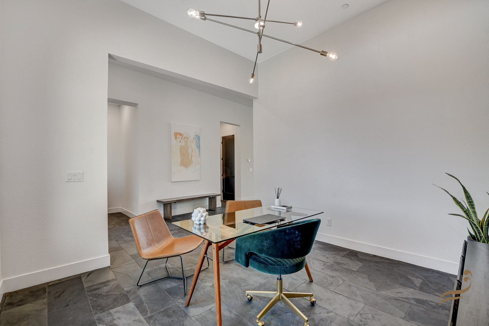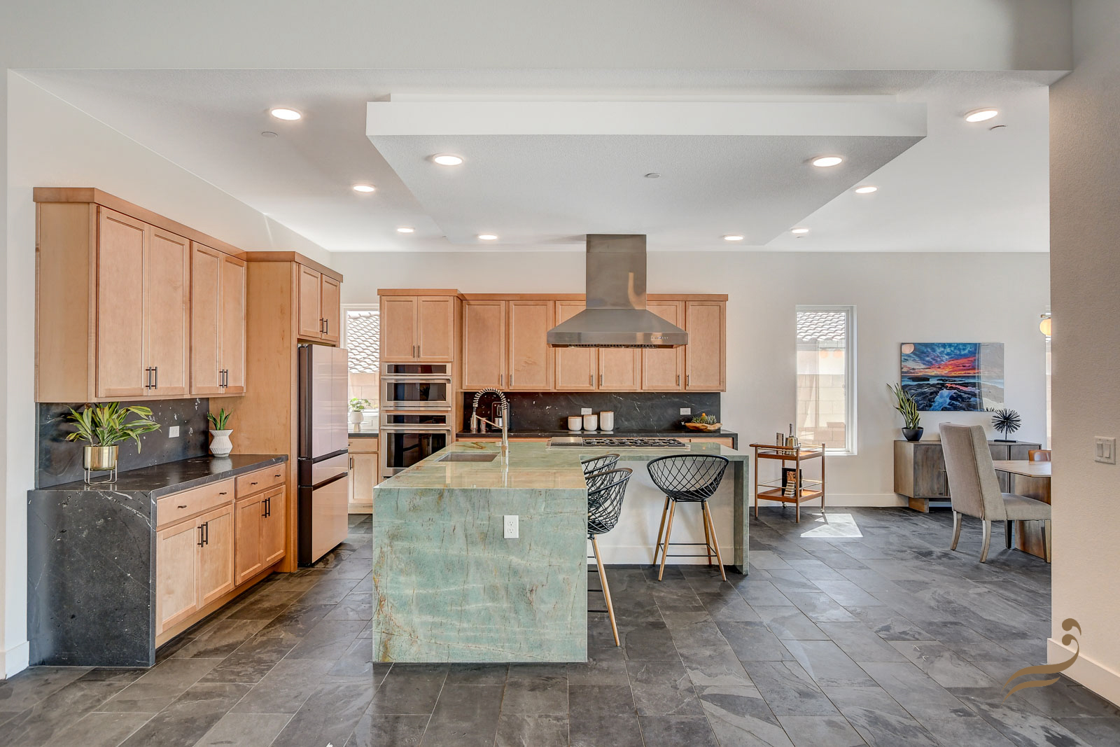 Custom design and finishes are found throughout the home. Finishes that dress this home include upgraded appliances such as the drop down range hood, stunning 2-tone quartz and leathered marbled countertops finished with extra thick bullnose and waterfall edges, full backsplash, in ceiling surround sound pre-wire, added recessed lighting throughout, custom geometric tiled accent walls, high-ceilings and many more too numerous to list.