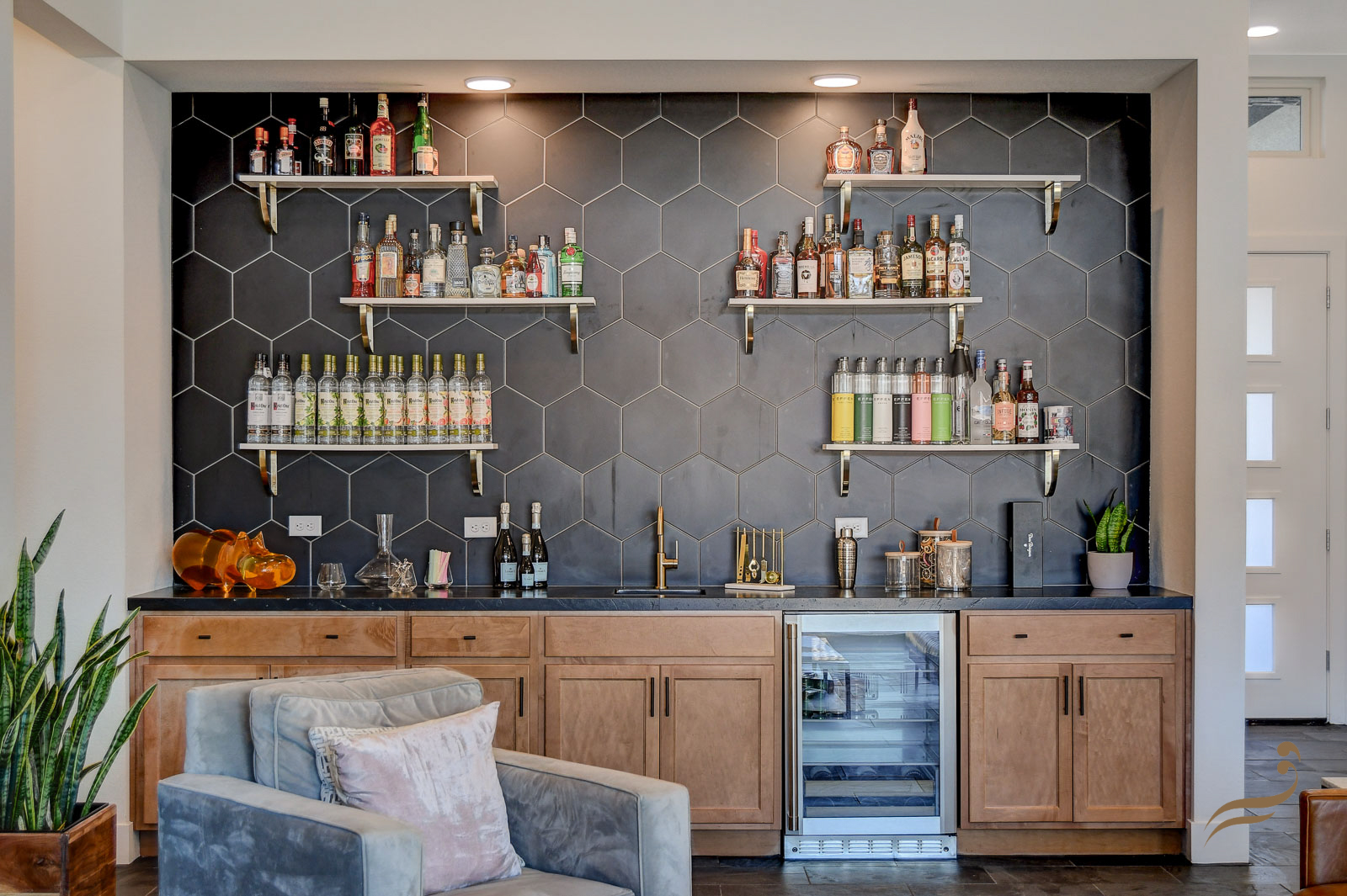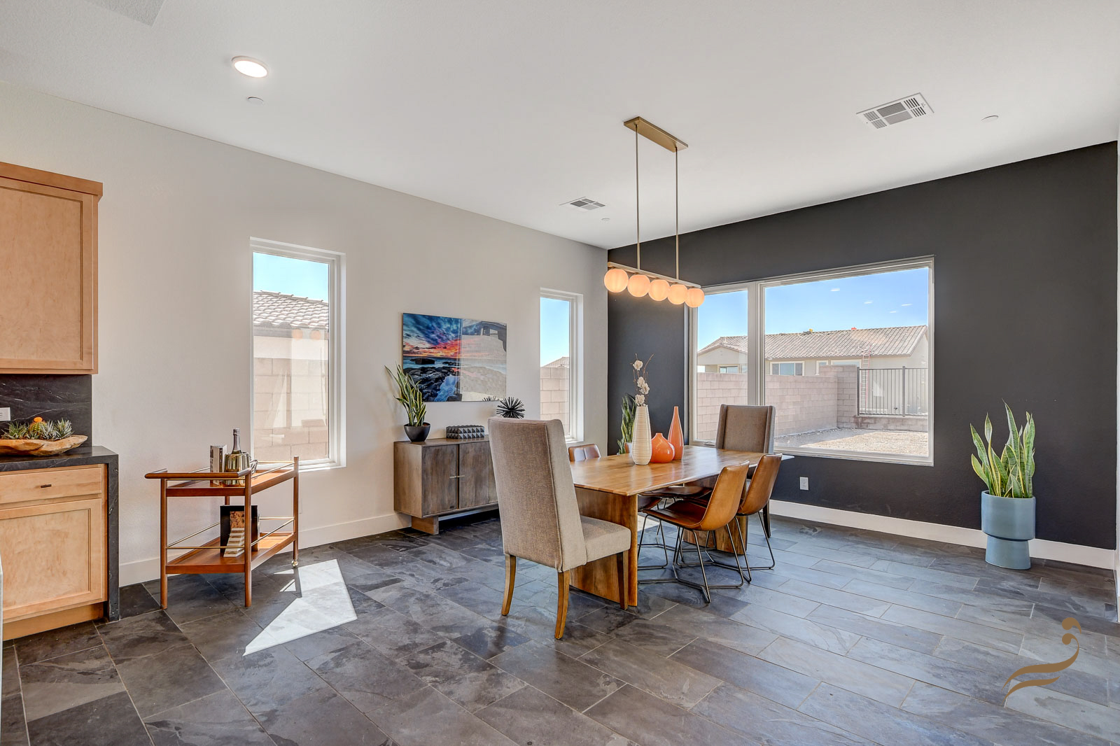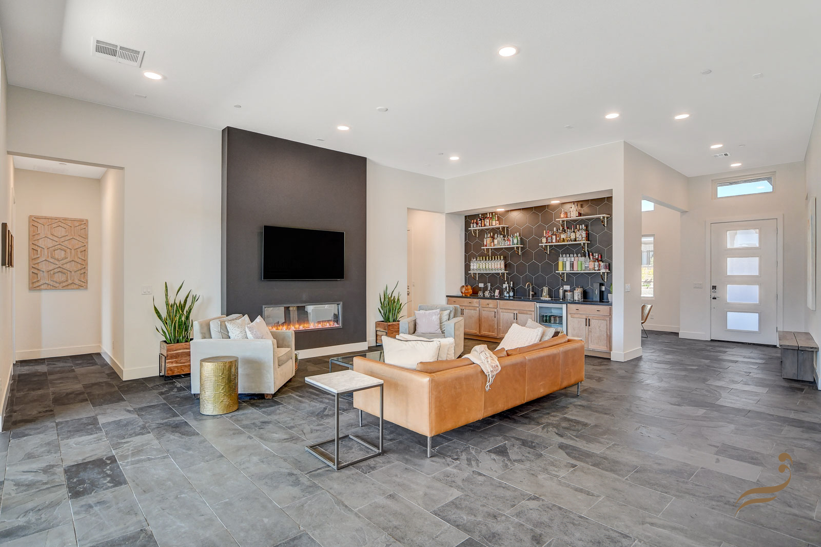With a great room open concept Byers will find the spacious design to be functional and thoughtful no matter the occasion. A large spacious great room open to the kitchen, outdoors and the custom bar is ideal for entertaining with the bar being finished with modern floating shelving & accent wall tiling paired with the gauged black slate flooring offering aesthetic design and durability. The primary boasts a spa like bathroom w/ floor to ceiling polished marble/glass walk in shower and stand alone bath. Two other additional bedrooms share a full bath with custom finishes. Outside the premium .26 acre lot backs to the future arroyo and offers endless possibilities for resort style living.