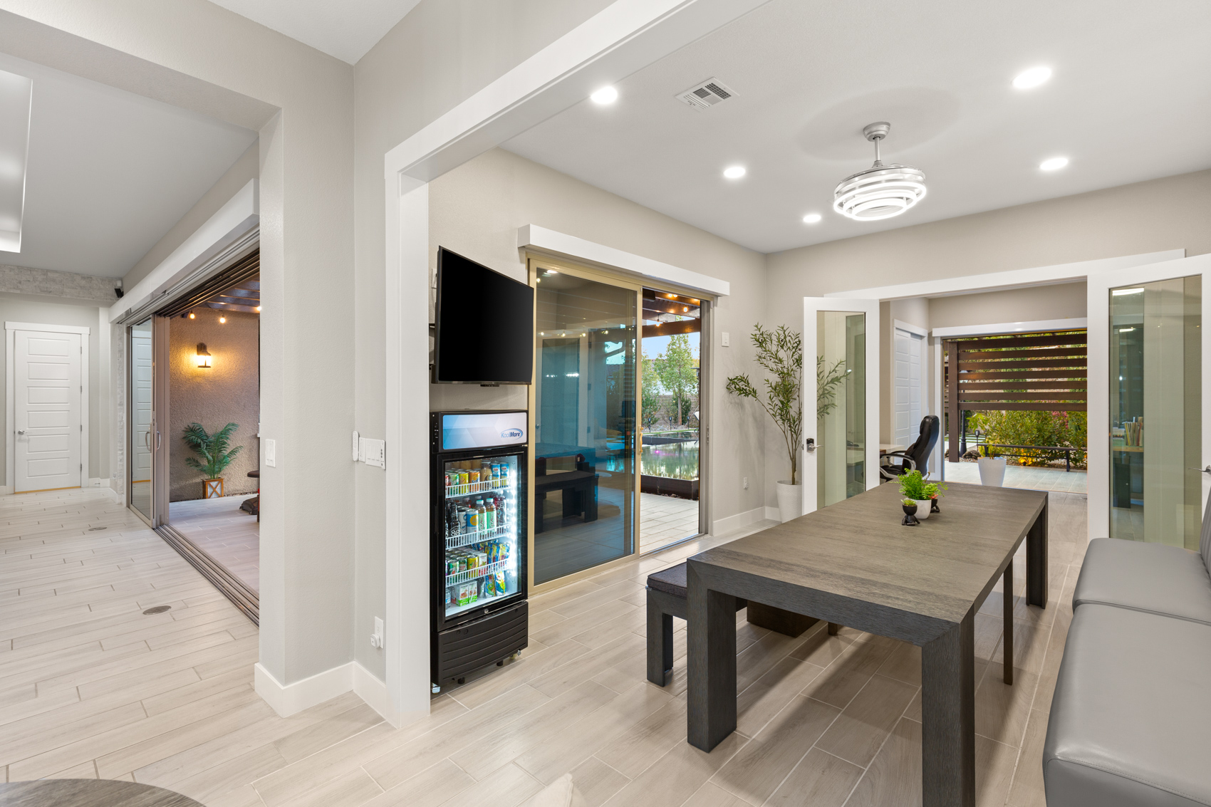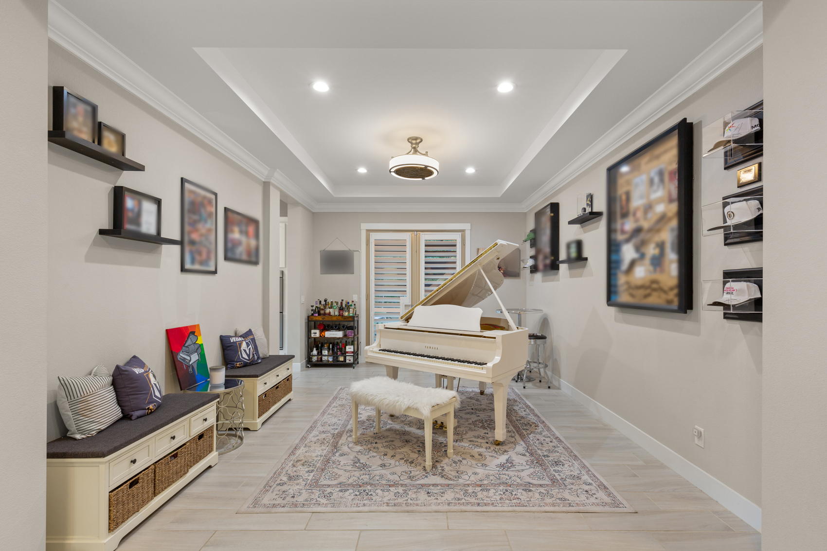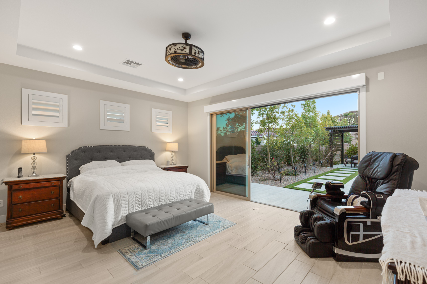 Enhanced privacy comes with window security screens and a gated entry. Tech-savvy features include EV charging, a gas backup generator, and a security system cameras throughout. The family room and master suite feature sheer and blackout curtains for optimal comfort. All four spacious bedrooms include en-suite baths, and the lot is walking distance to a top-rated elementary school. The backyard sheds are rare community-approved additions. With luxurious amenities and meticulous upgrades, this home offers unparalleled comfort and convenience.