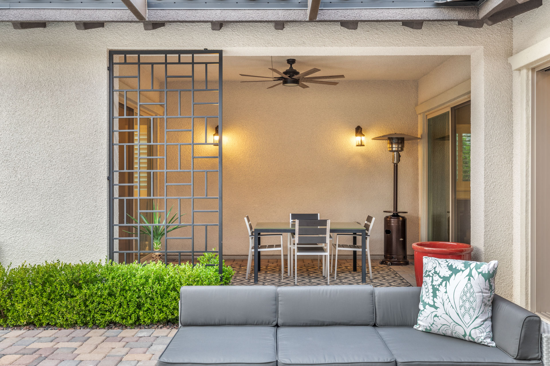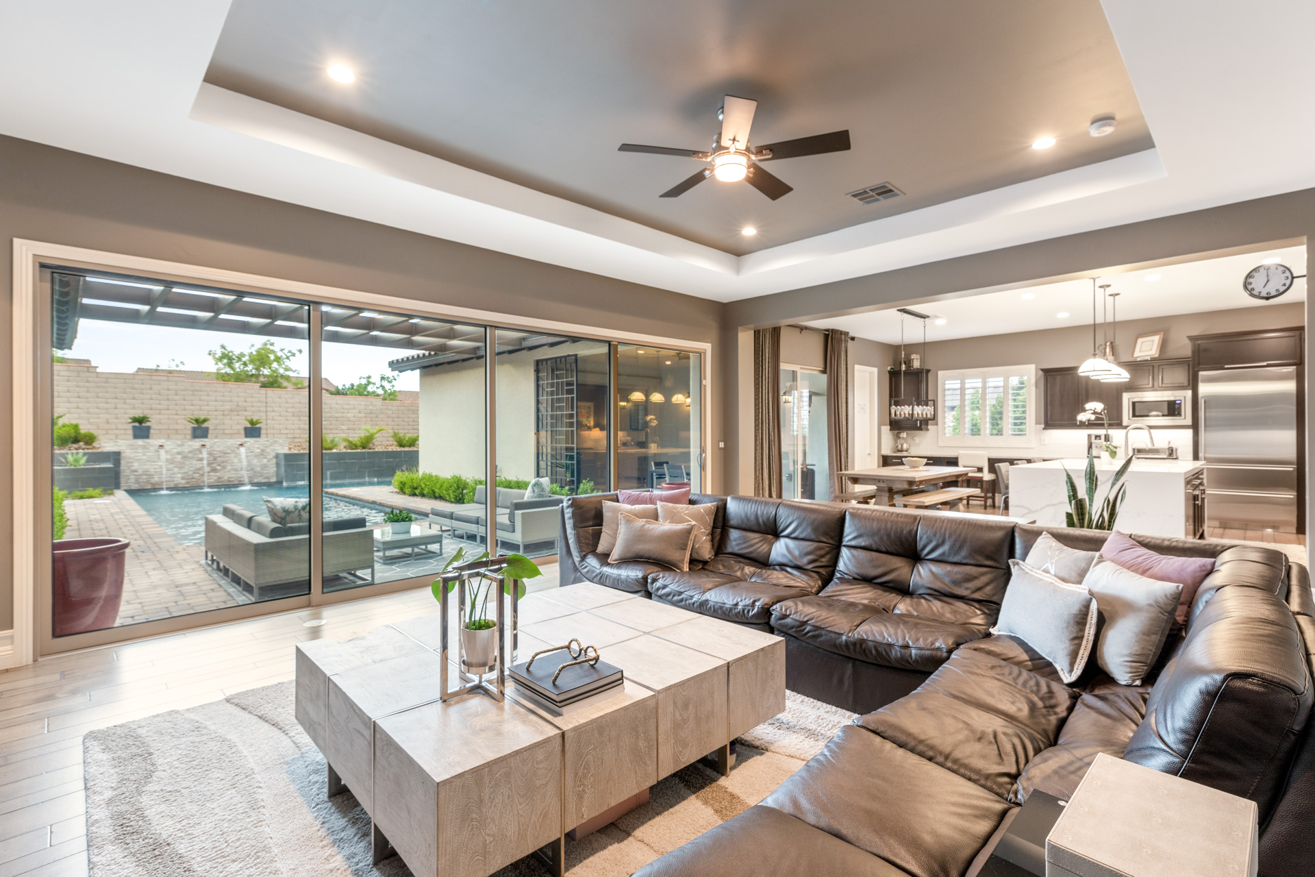 The heart of the home lies in the expansive great room, where a cozy fireplace beckons you to unwind and create lasting memories with loved ones. Hosting gatherings is a joy in this inviting space, enhanced by the abundance of natural light that pours in through the large windows, creating a warm and inviting ambiance. Prepare to be enchanted by the gourmet kitchen, designed to satisfy the most discerning chef. Adorned with top-of-the-line stainless steel appliances, including a sleek island with a gas cooktop, this culinary haven seamlessly blends style and functionality. Ample cabinetry and a walk-in pantry provide an abundance of storage space, ensuring that every culinary tool and ingredient has its place. Retreat to the expansive primary suite, where tranquility awaits. The generous proportions of this private sanctuary provide ample room for relaxation, while the plush carpeting and tray ceilings add an air of sophistication. The attached primary bathroom is a true oasis, featuring a luxurious soaking tub, a glass-enclosed shower, and dual vanities adorned with elegant fixtures. Mornings are made easier with the inclusion of a spacious walk-in closet, offering a perfect blend of organization and style. With three additional well-appointed bedrooms, each with their own en-suite bathroom, this home offers plenty of space for family and guests. The versatility of these rooms allows for customization, whether you require a home office, a media room, or a personal fitness center. The allure of this residence extends beyond its walls, as the backyard presents a true outdoor oasis. Dive into the sparkling pool to cool off on warm summer days. The covered patio provides a shaded retreat for alfresco dining, while the well-manicured landscaping adds a touch of natural beauty to the surroundings.