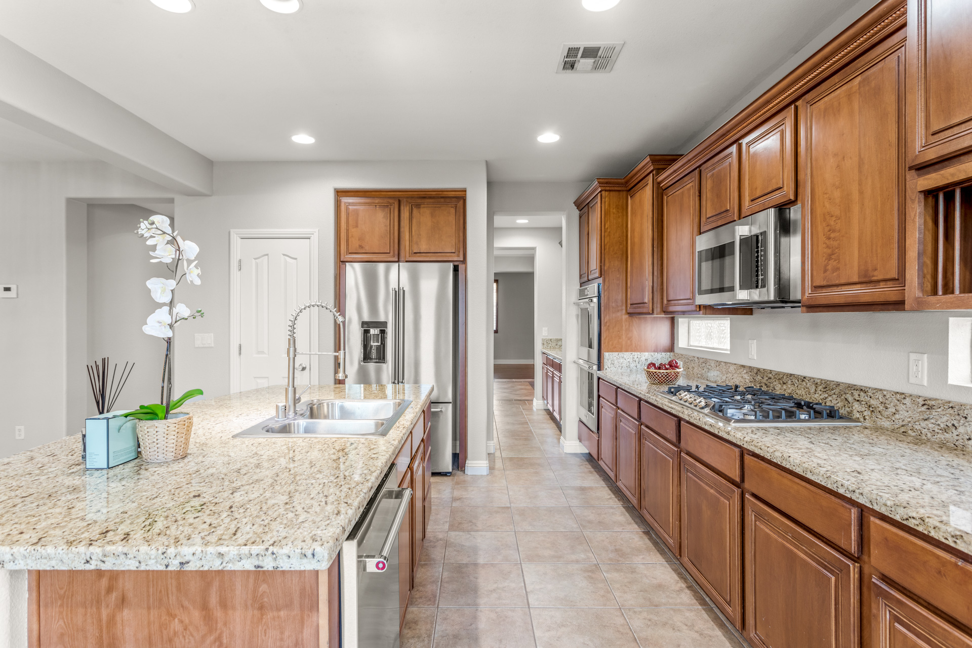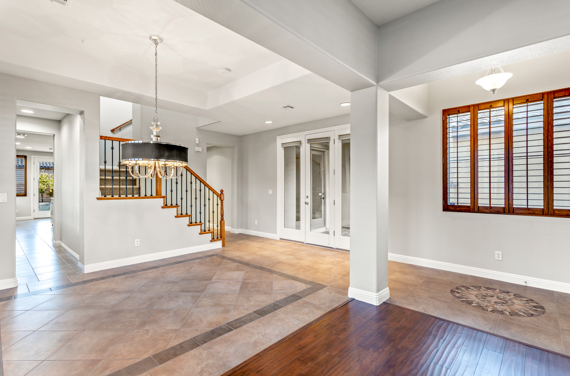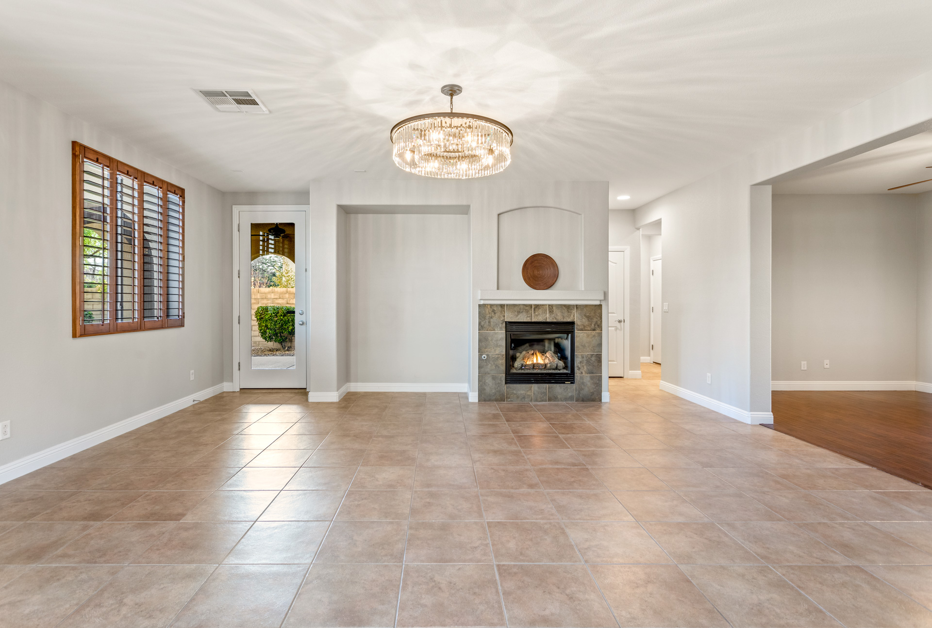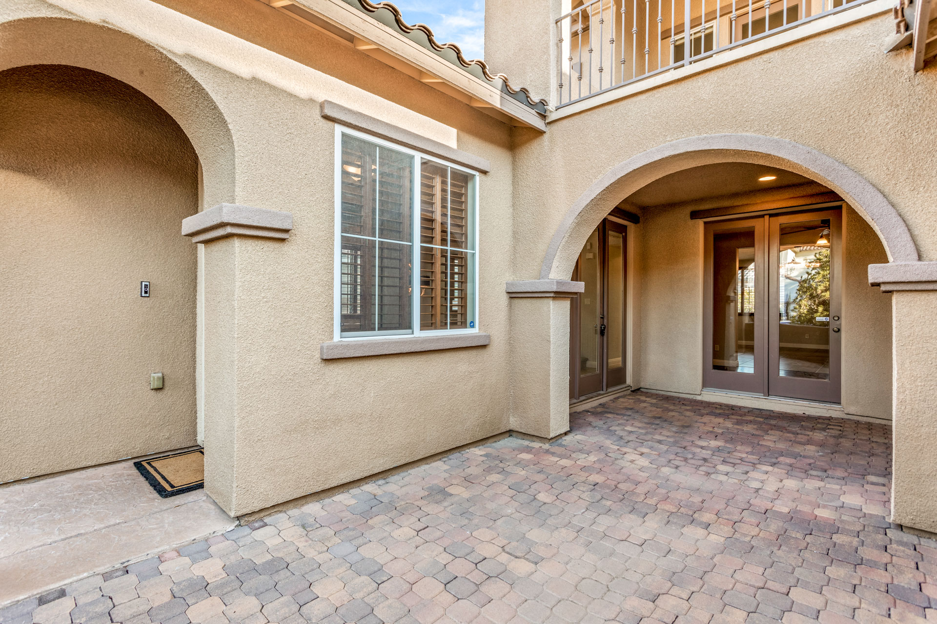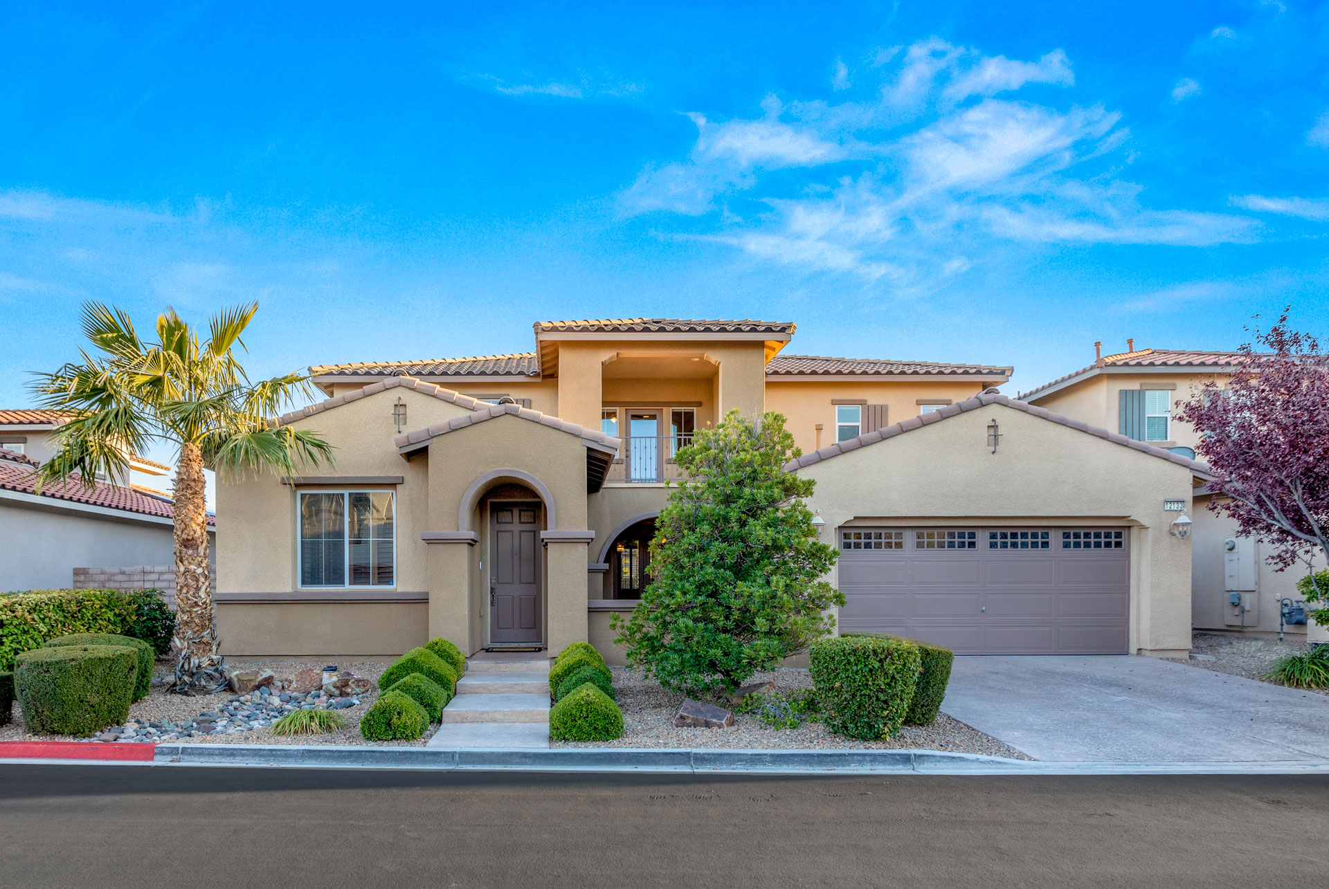 Beautiful curb appeal! This four-bedroom, plus den, single-family home in the highly sought-after Paseos, stands regal and high, facing the gorgeous Las Vegas Mountains. With its spacious floorplan, upgraded flooring and light fixtures, two fireplaces, and new stainless-steel appliances, this wonderful house has many little gems waiting to be discovered! All new carpet and paint throughout.