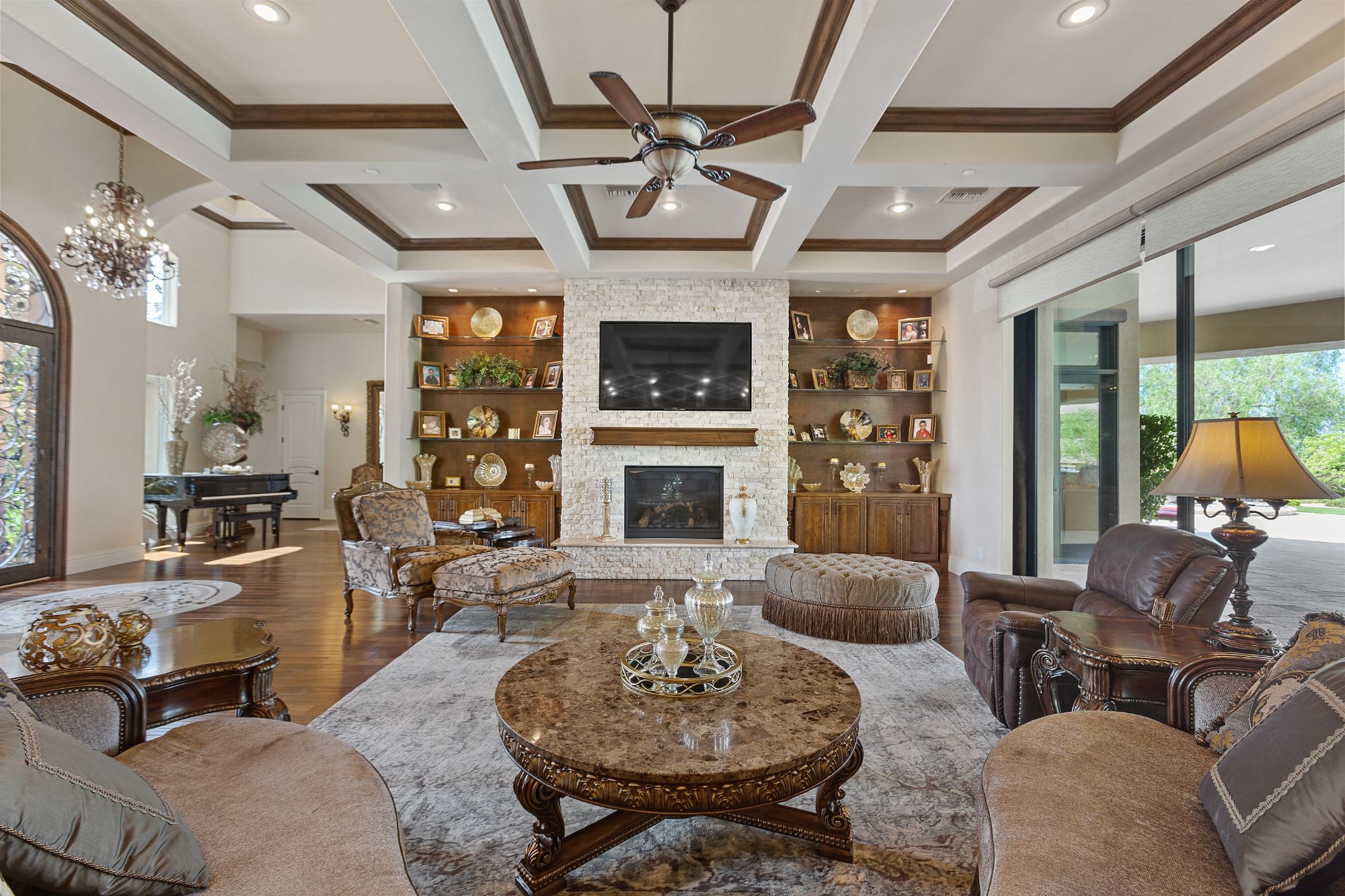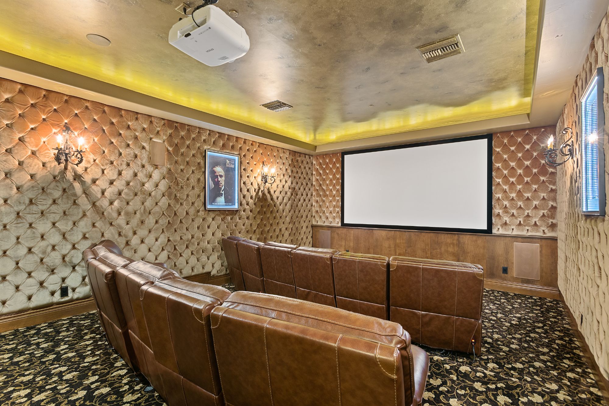 Real wood flooring is used throughout the home's public spaces, with a custom mosaic tile medallion inset on the floor of the foyer. The adjacent den, large enough to accommodate a grand piano, has a courtyard view, while the open-plan leads directly into the main living area accented with a fireplace set into a natural stone wall and surrounded by built-in cabinets and shelving. The chef's kitchen features Sub-Zero and Wolf appliances, two dishwashers, double islands, and granite counters, and abundant storage. A charming dining nook overlooks the backyard, and a butler's pantry and serving bar lead to the formal dining room with its grand 19-foot ceilings and massive chandelier. The home's primary bedroom suite features an oversize ensuite bath and dressing room with a custom closet system, a second linear gas fireplace, and access to the rear yard and garden. Three secondary bedrooms, including one that functions as a junior master suite with a custom closet/dressing room, each have ensuite baths and outdoor access. This distinctive smart-home residence has a designated home movie theater, surround sound systems throughout, and individual thermostats in each room.