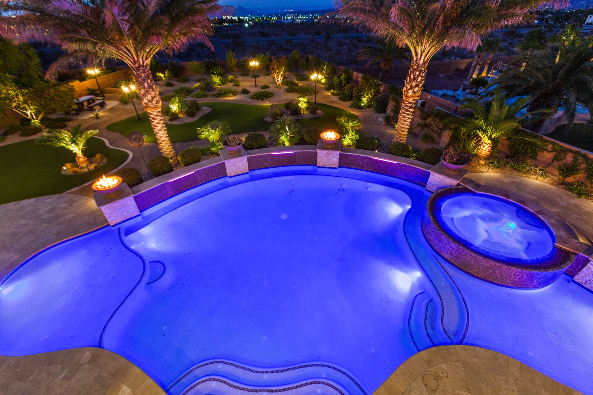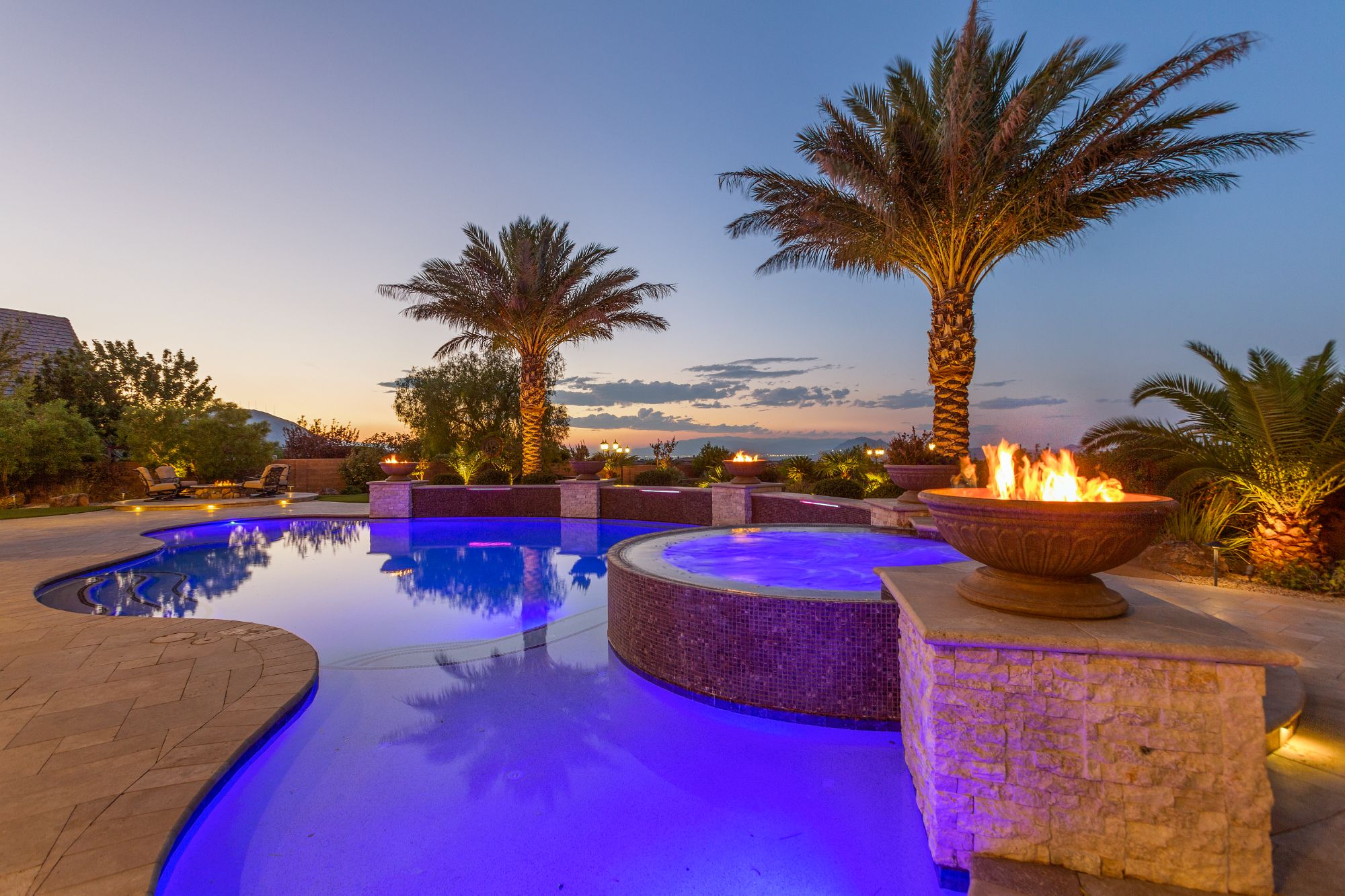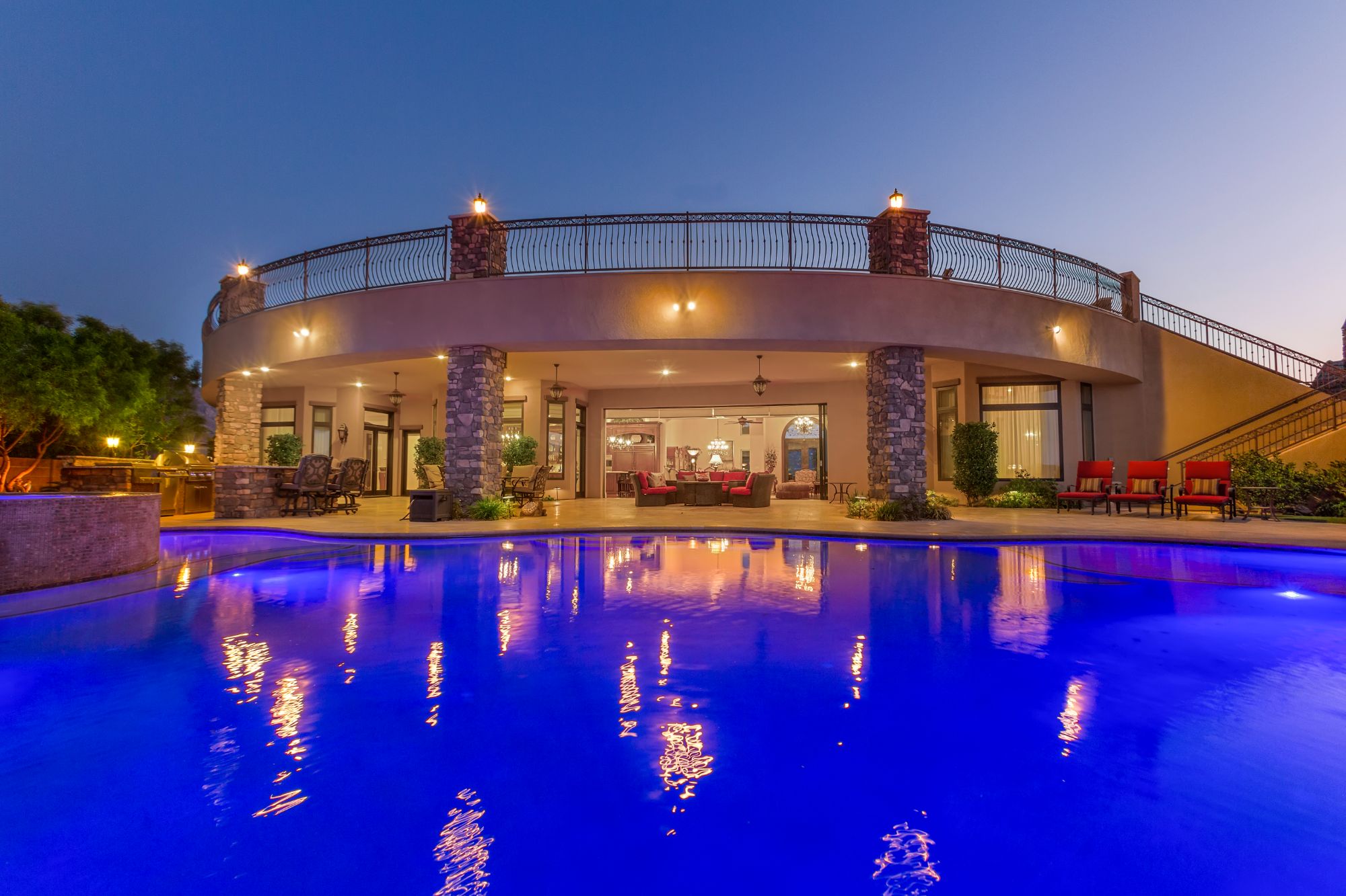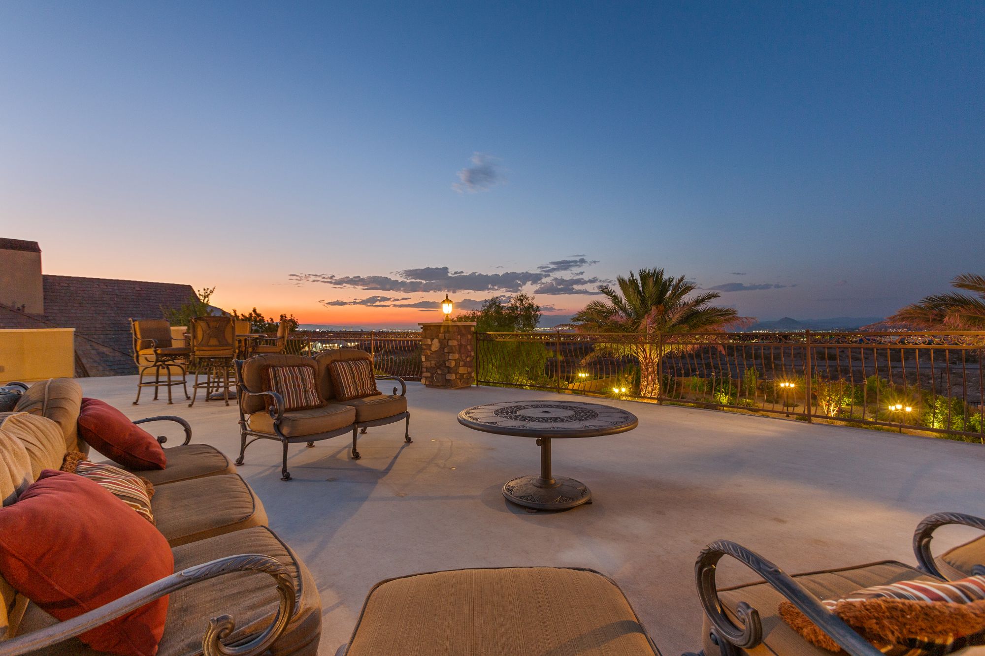 The tile-roofed residence features 5,715 square feet of interior living space, an expansive second-floor deck with 360* views of the city and surrounding mountains, a resort-style pool with an infinity-edge spa and fire features, a luxurious outdoor kitchen and eating bar, and private parklike grounds. Automatic window walls completely retract to open the interior to the park-line grounds.