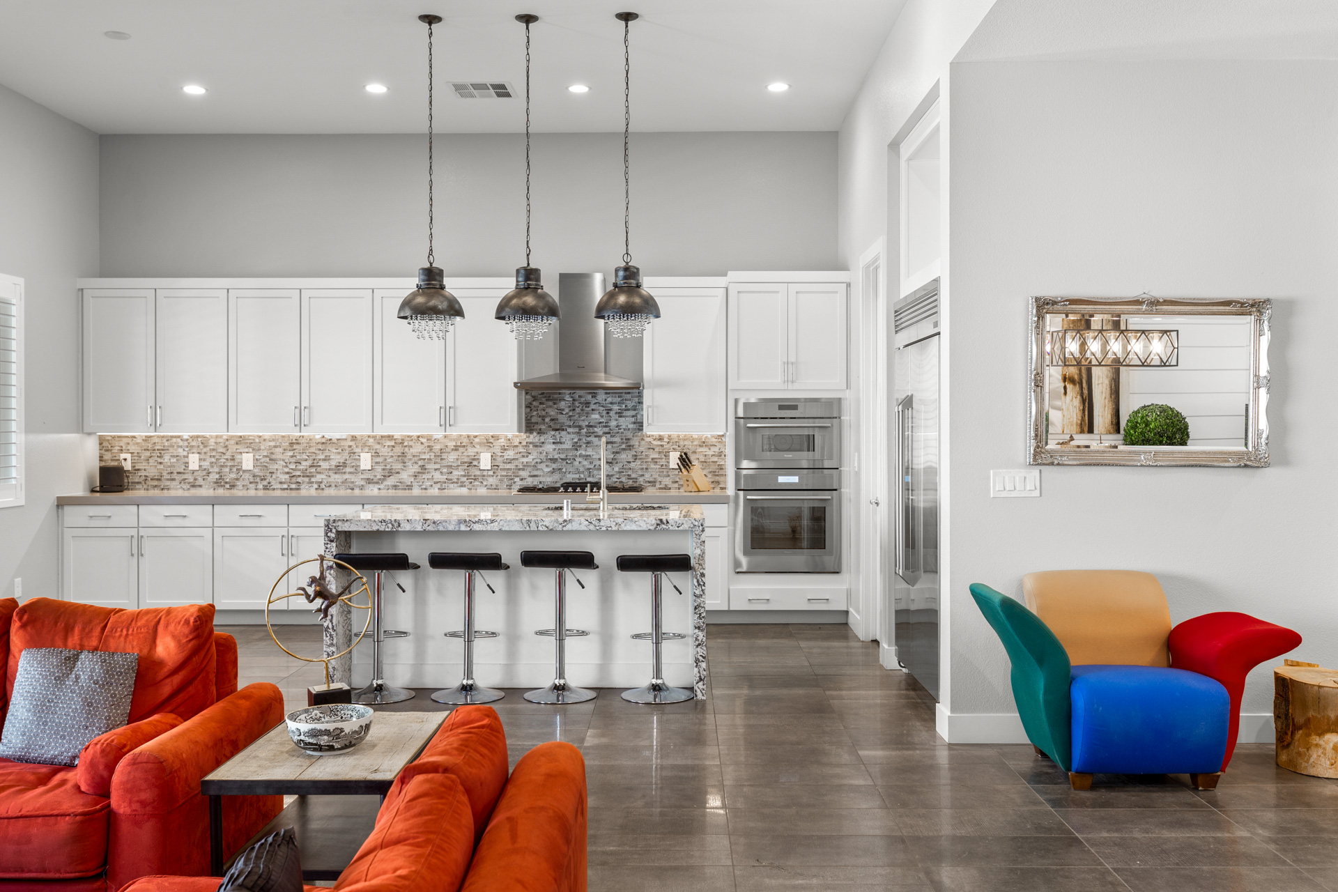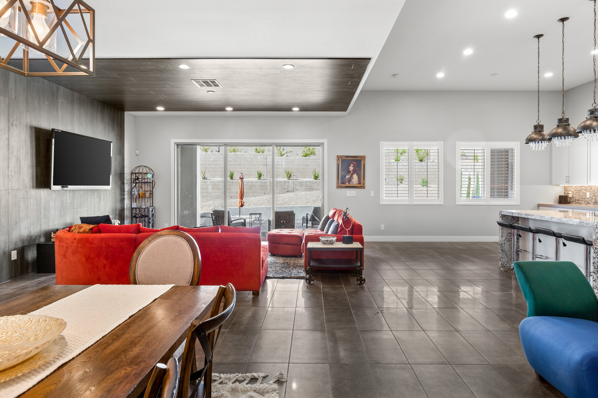 Constructed in 2019, this contemporary home has a main-level master suite and two additional bedrooms downstairs, with an additional bedroom and spacious loft upstairs. The home's main level open floor plan features oversize tile flooring and an artistic ceiling treatment over the sitting area, formal dining space, and a spacious efficiently organized kitchen with a walk-in pantry. A large island sheathed with highly-grained stone features ample space to accommodate four people with stool seating. Glass doors open directly to the outdoor patio and pool area.