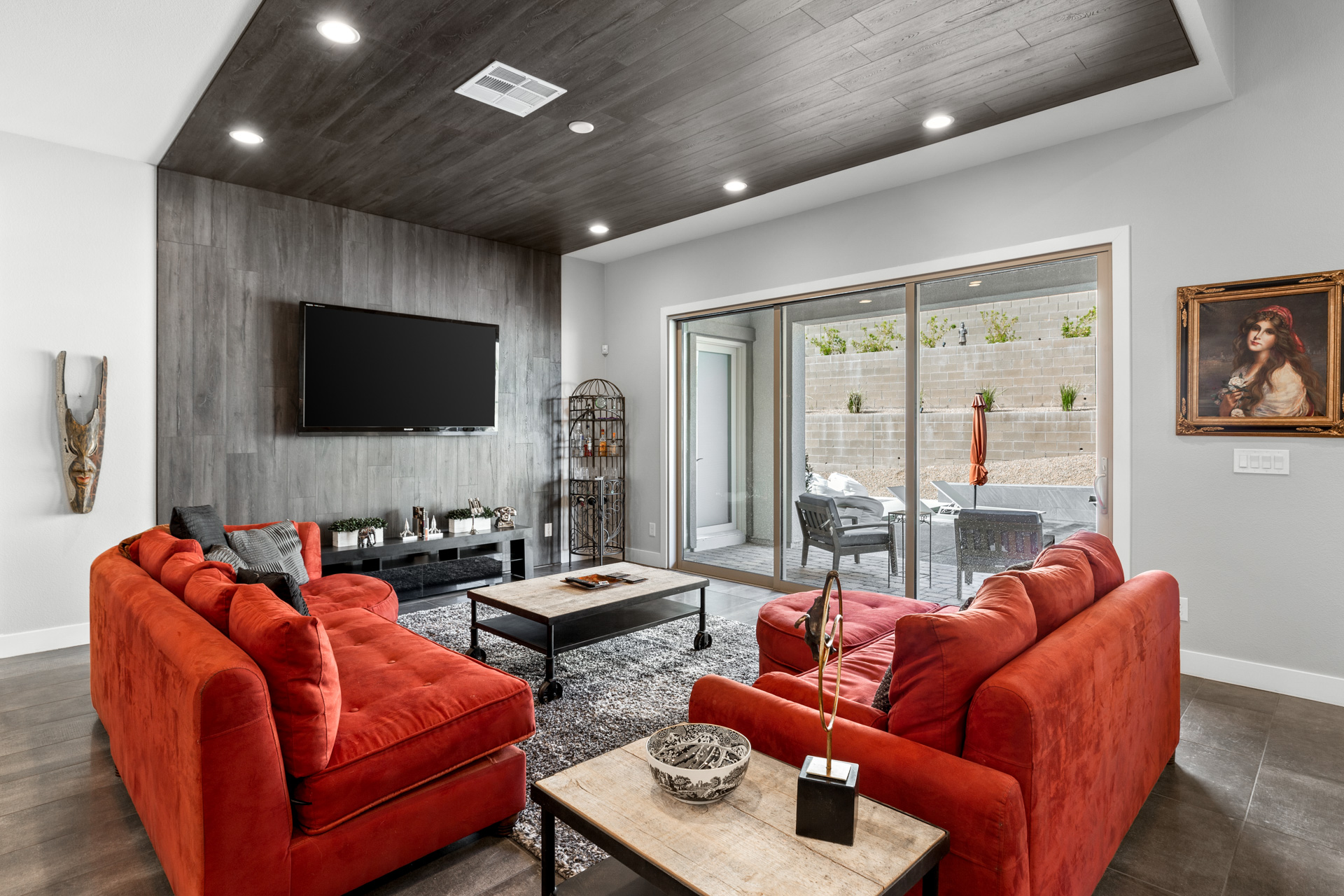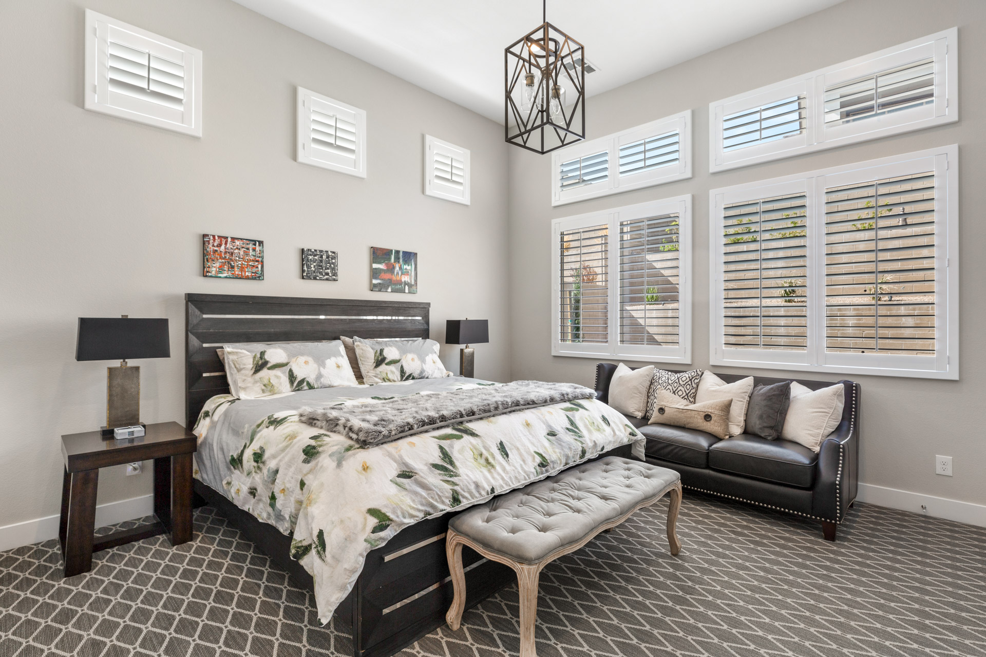 The master suite includes dual vanities, a contemporary bath with an immense shower, and a stylized soaking tub set into a corner. Two additional bedrooms, a full bath, powder room, and large laundry complete the downstairs living area. Upstairs, the loft has an interior balcony overlooking the main level, while the bedroom features a private balcony that overlooks the pool, in addition to a spacious dual-vanity bath with a large glass-walled shower. All the home's bedrooms feature patterned low-pile carpet and custom closets. The home's interior decor is primarily gray and white, offering a subdued backdrop for personal art and furnishings, and the contemporary exterior is enhanced by desert landscaping.