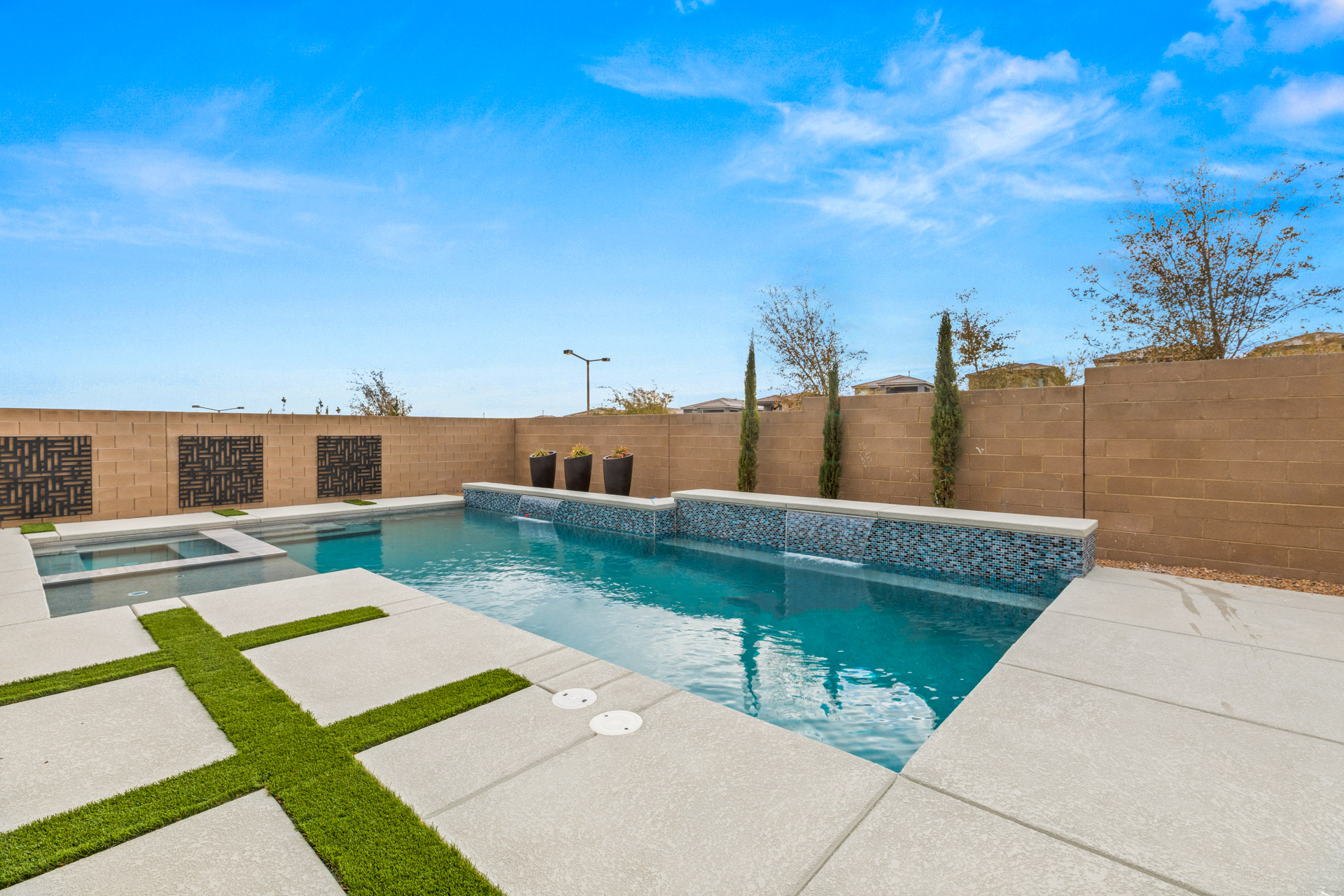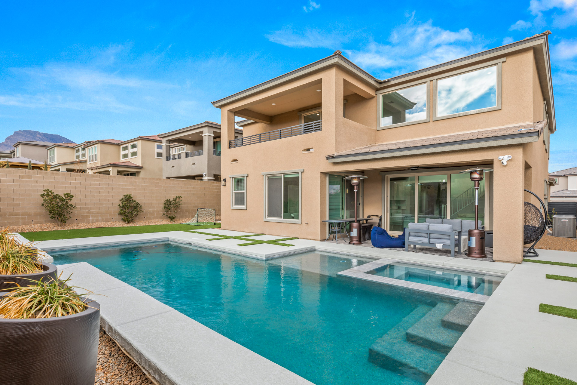 Large backyard with sparkling pool and spa. Incredible view of the Mountain, City and The Strip views! spacious open concept from kitchen to great room.
