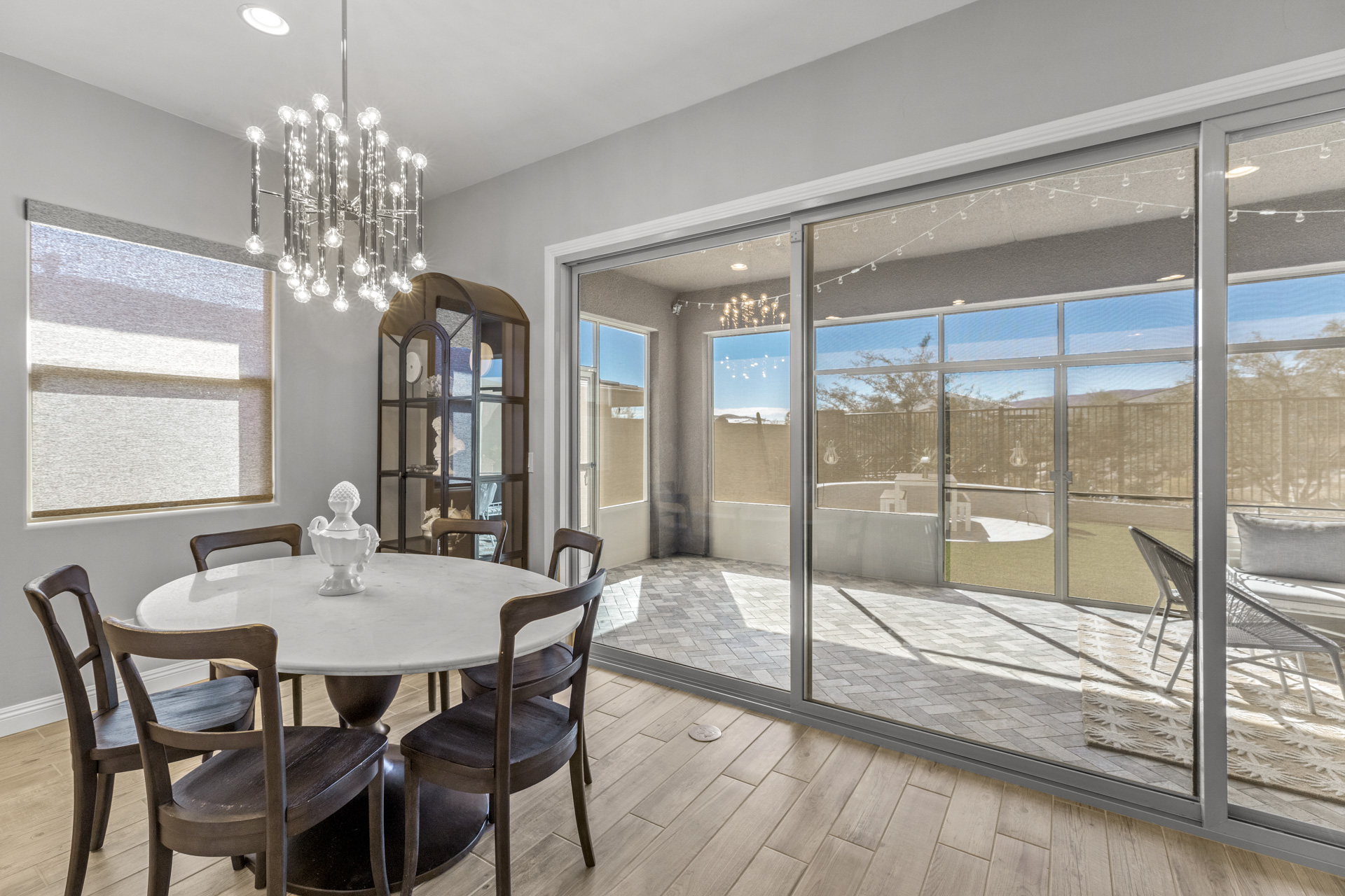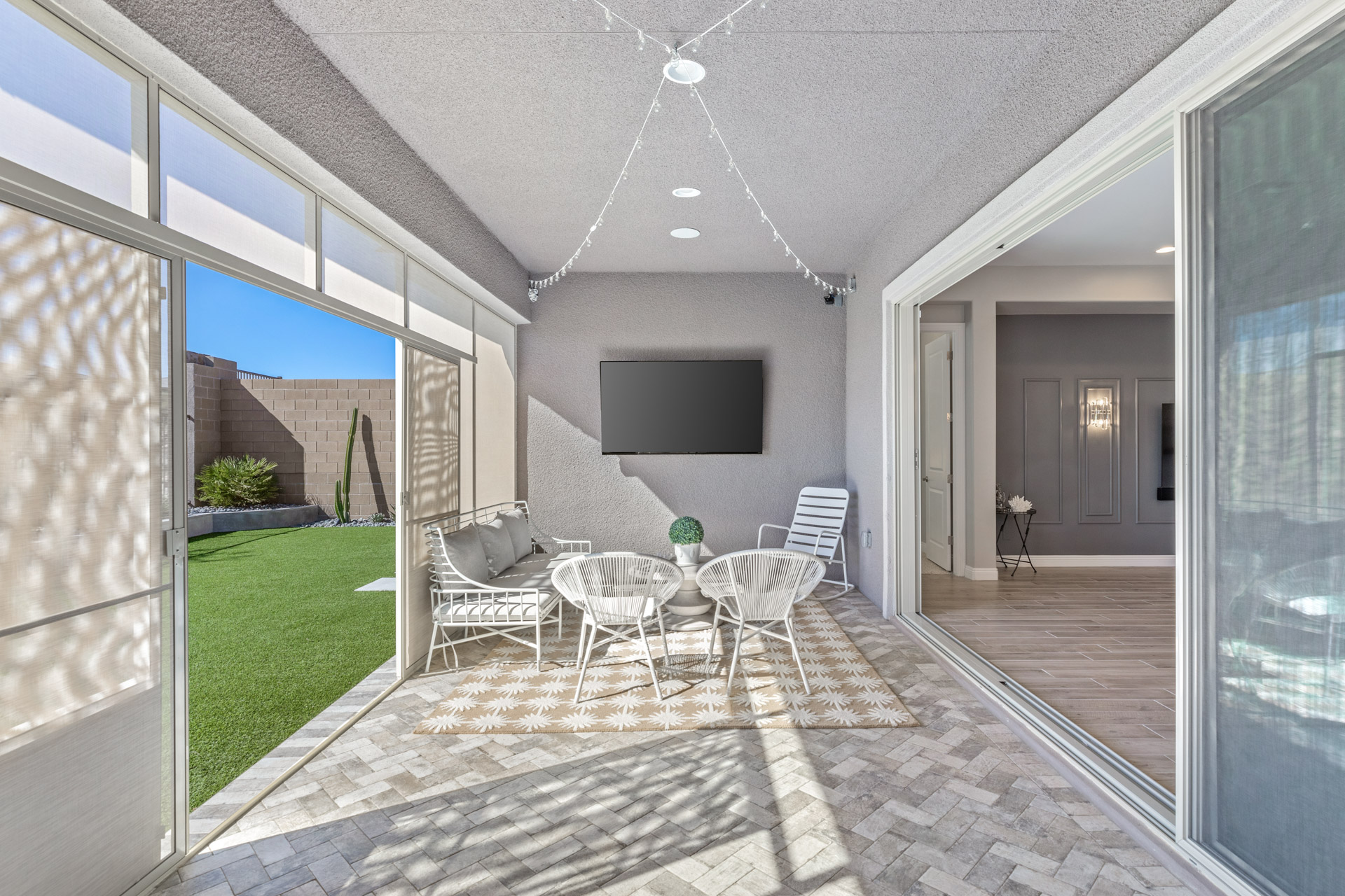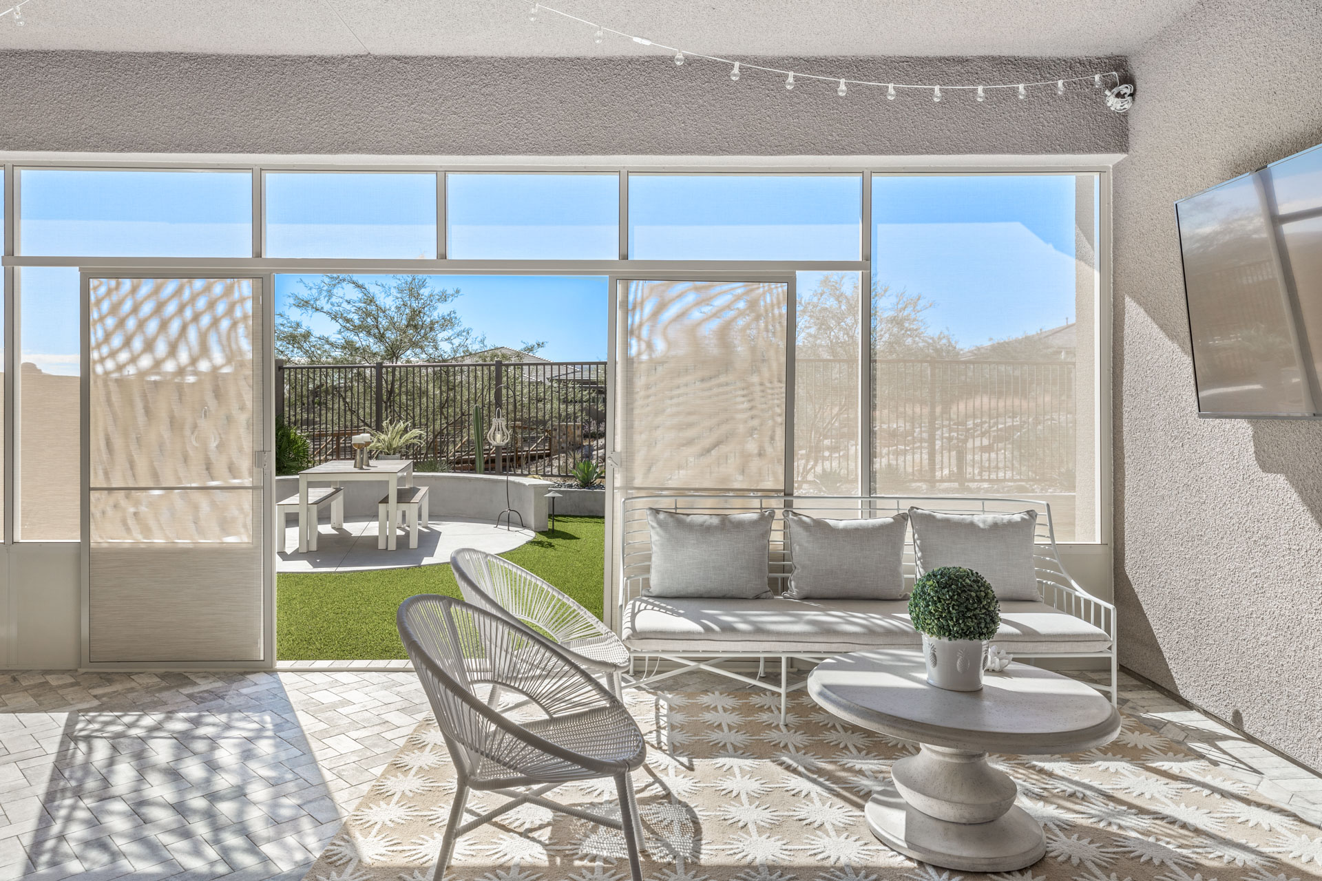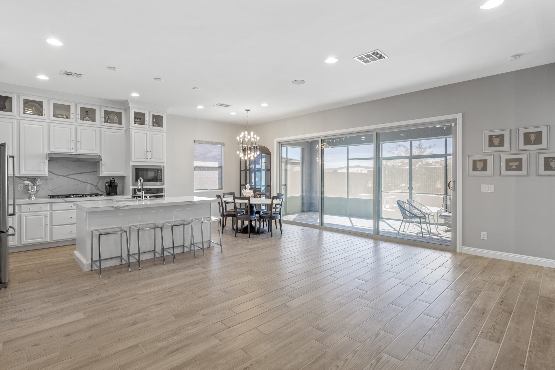 This sparkling home tucked in the gated community of Stonebridge, Summerlin, is a jewel. The premium lot backs to a Paseo with lovely views and a spaciously private feel. Part of the living/dining open concept is the kitchen with stainless appliances, pantry, and a large center island with seating. Through the wide screen doors is the adjoining screened-in patio/sunroom, perfect for outdoor dining.