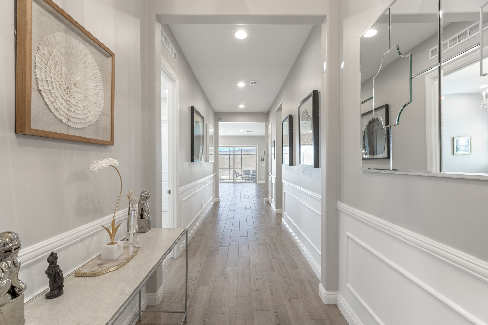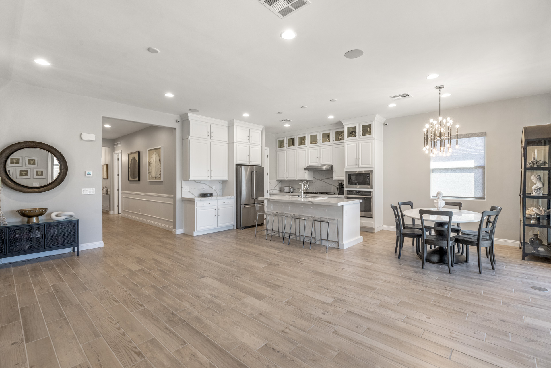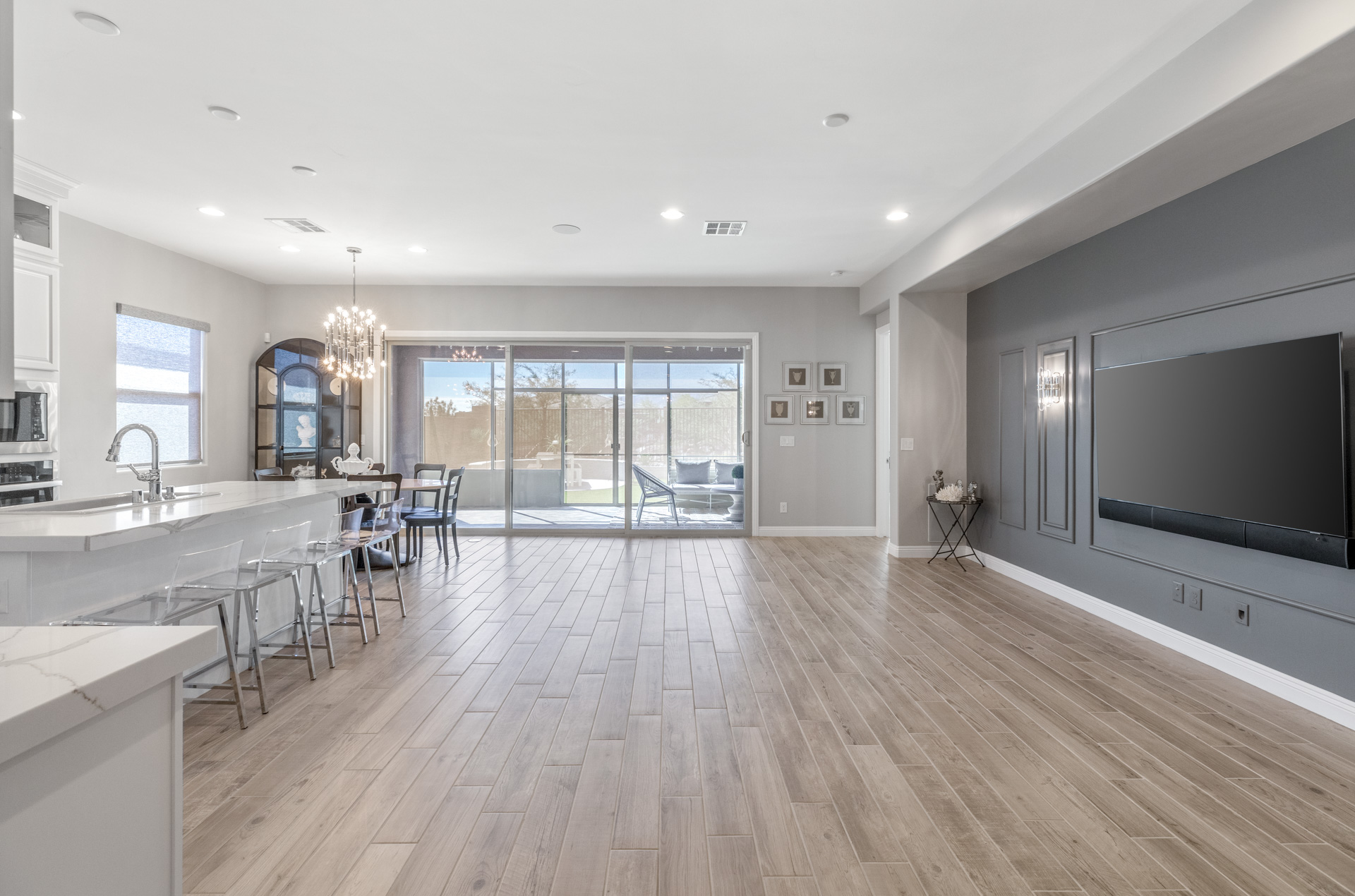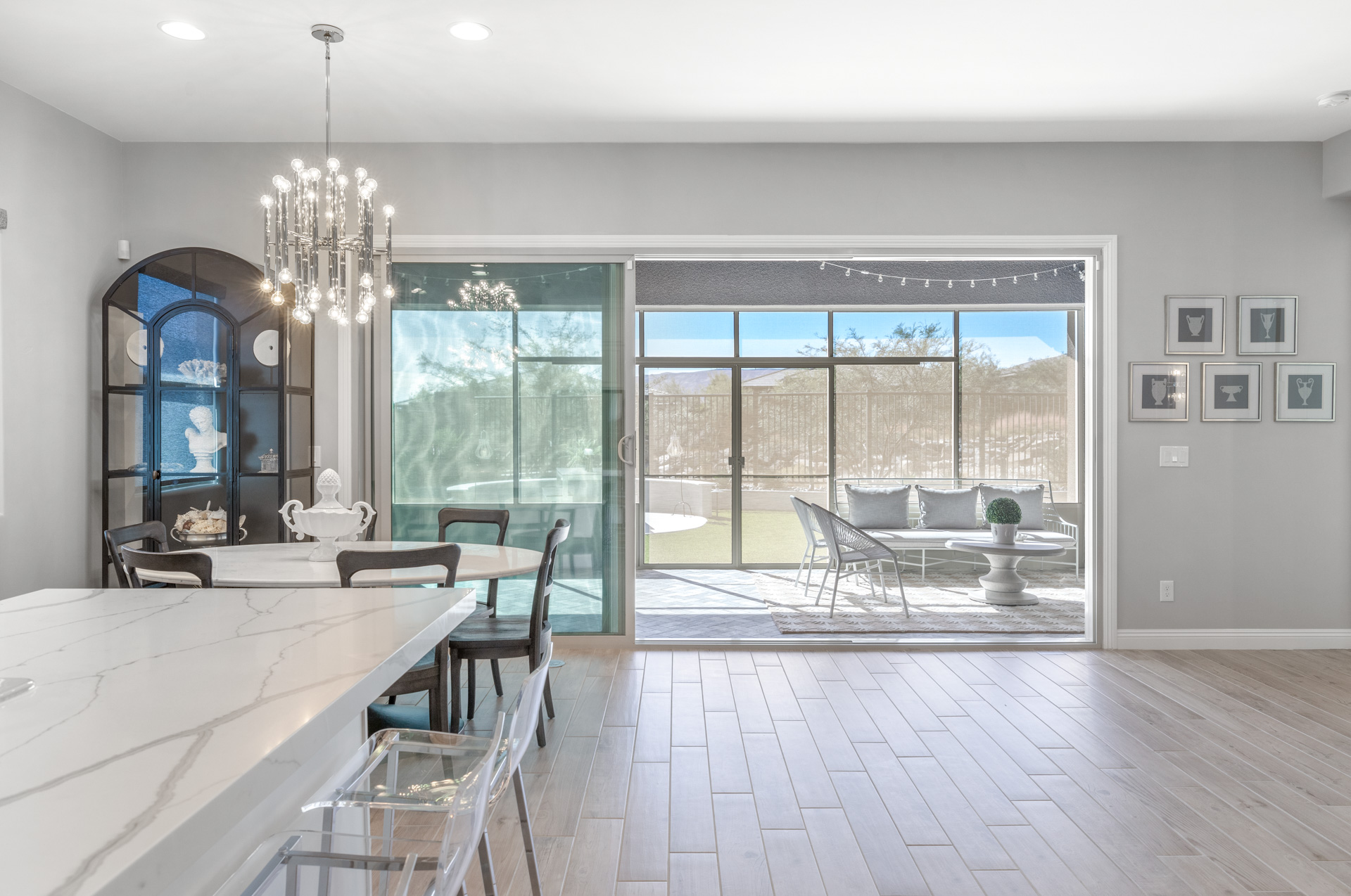 This sparkling home tucked in the gated community of Stonebridge, Summerlin, is a jewel. The premium lot backs to a Paseo with lovely views and a spaciously private feel. Part of the living/dining open concept is the kitchen with stainless appliances, pantry, and a large center island with seating. Through the wide screen doors is the adjoining screened-in patio/sunroom, perfect for outdoor dining.