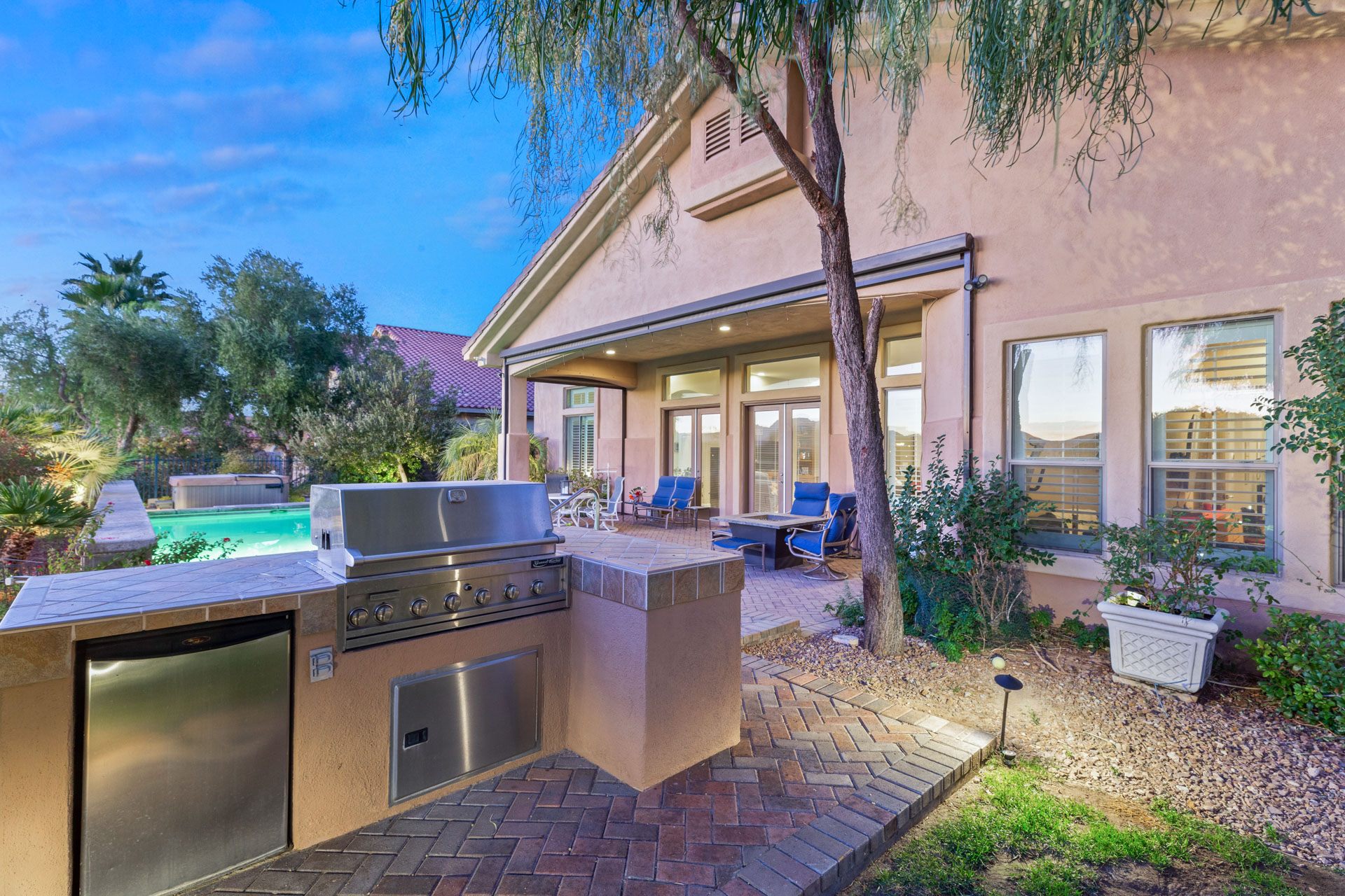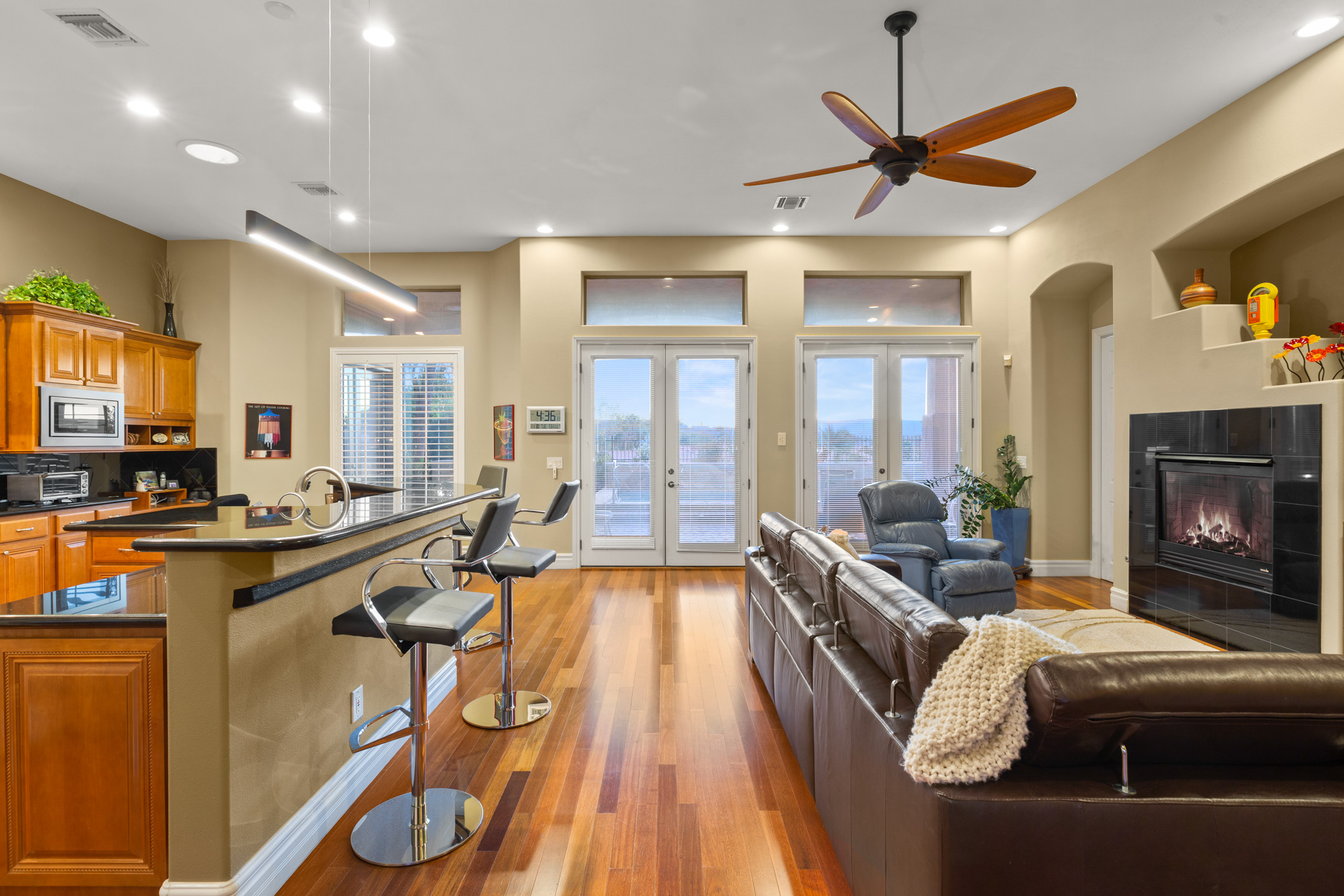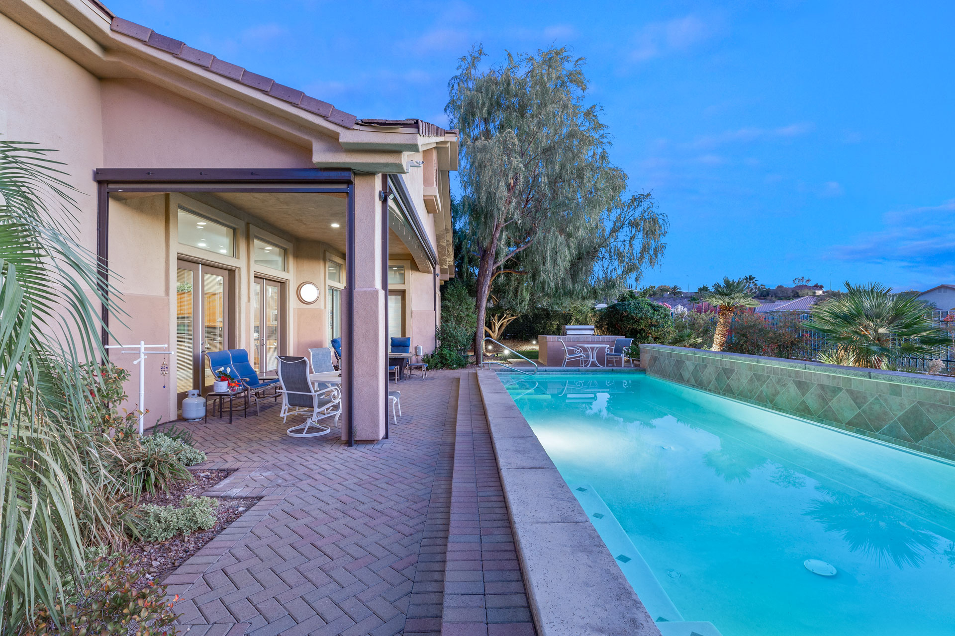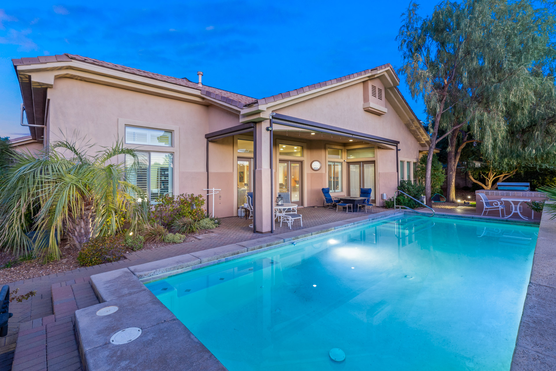Transitional single story with mountain view, no home behind. Volume ceilings, architectural details, French doors. Wood floors, shutters. Entertaining open floor plan, wet bar, master w/retreat walk-in shower/jetted tub/fireplace/his-hers walk-in closets. Bright kitchen, nook, breakfast bar, s/s appliances. Guest suite/office w/sep entry, full bath. Pool & BBQ & fabulous custom dog run.