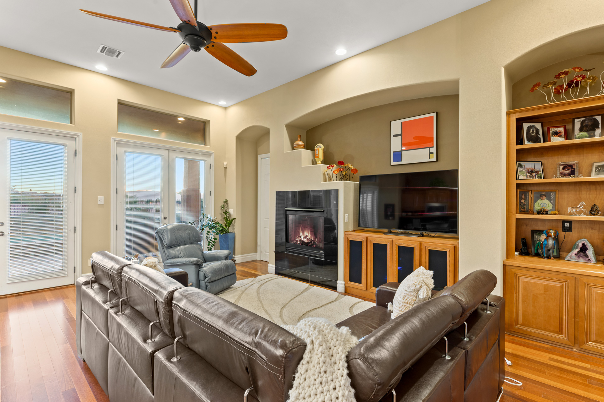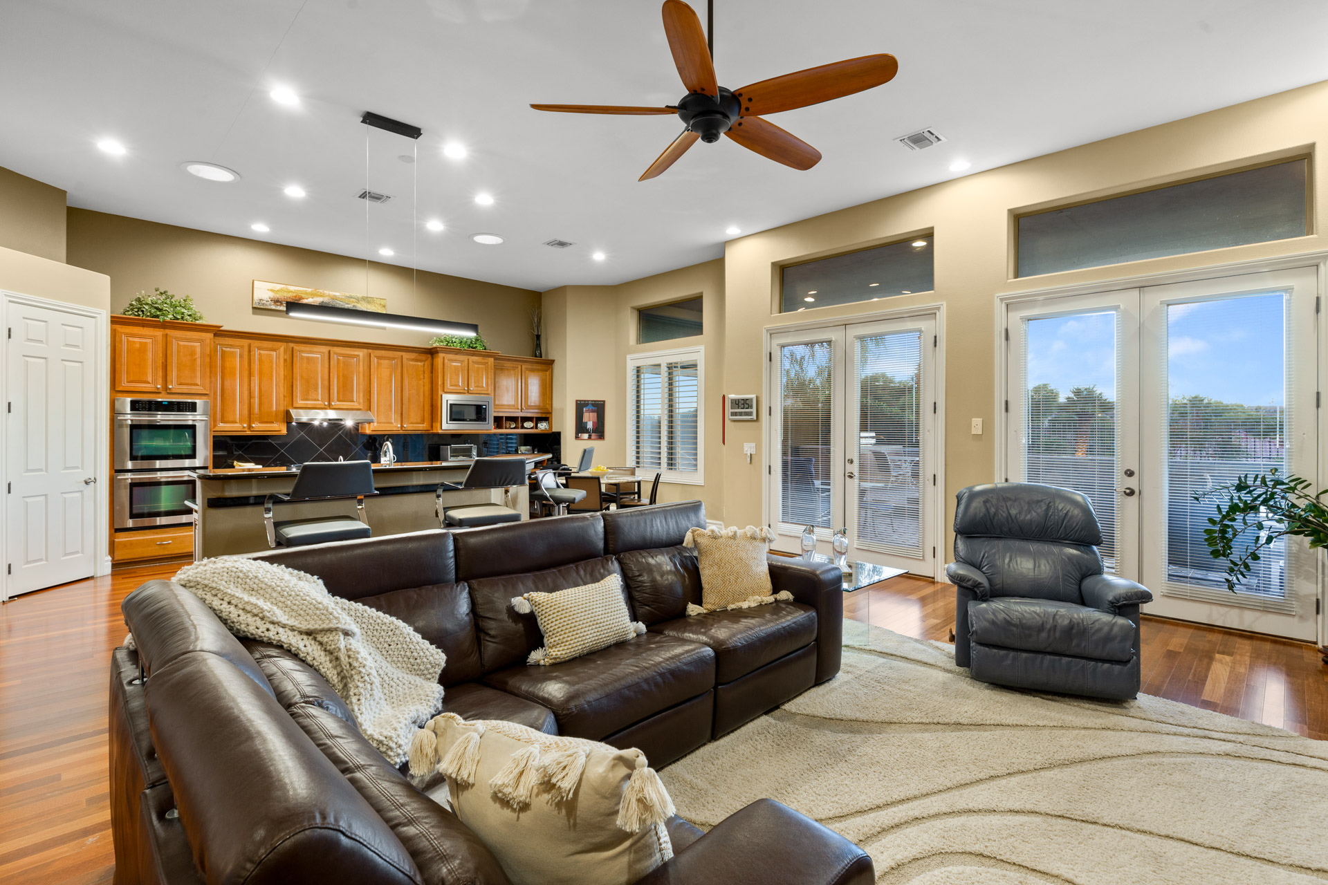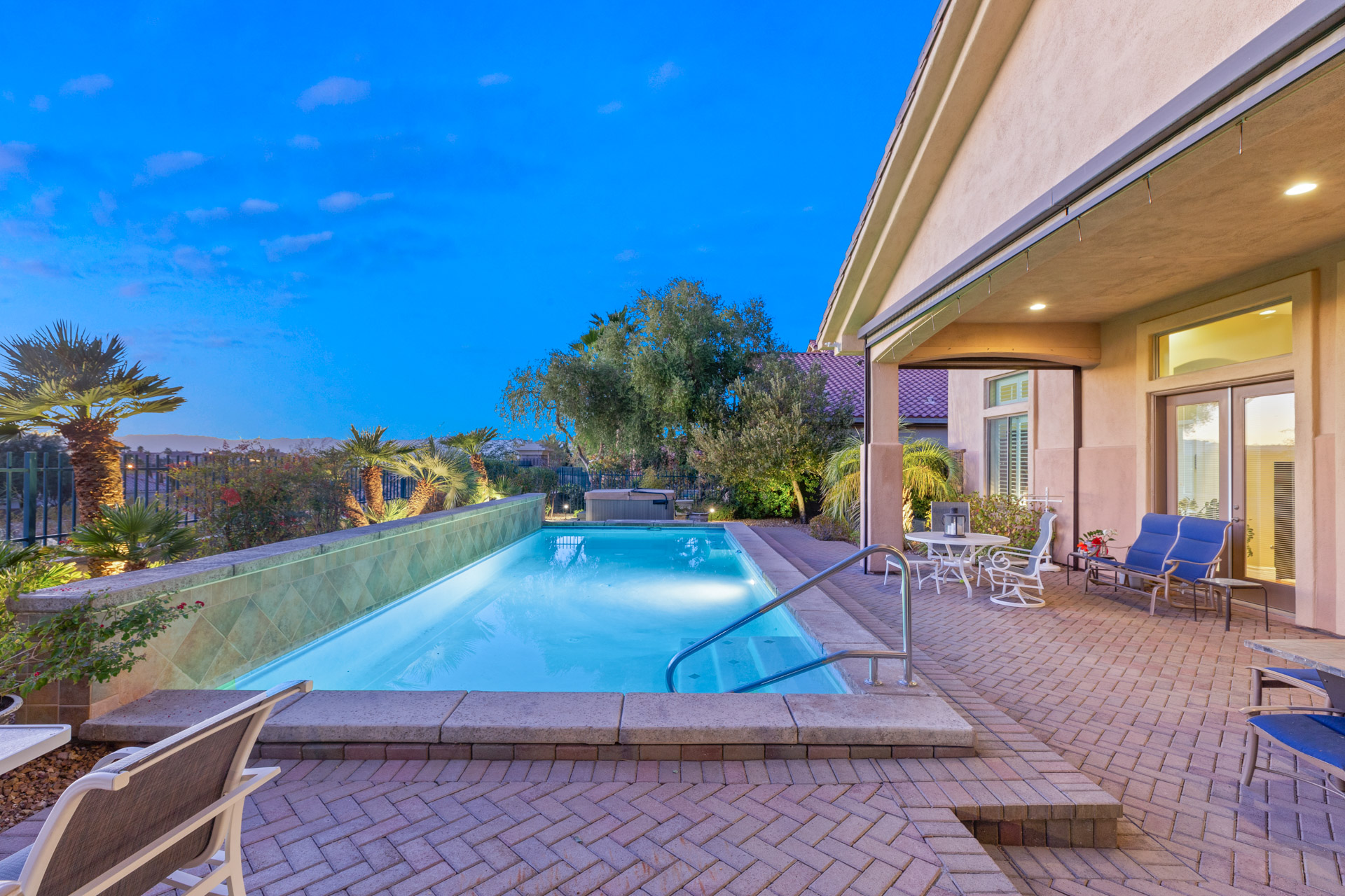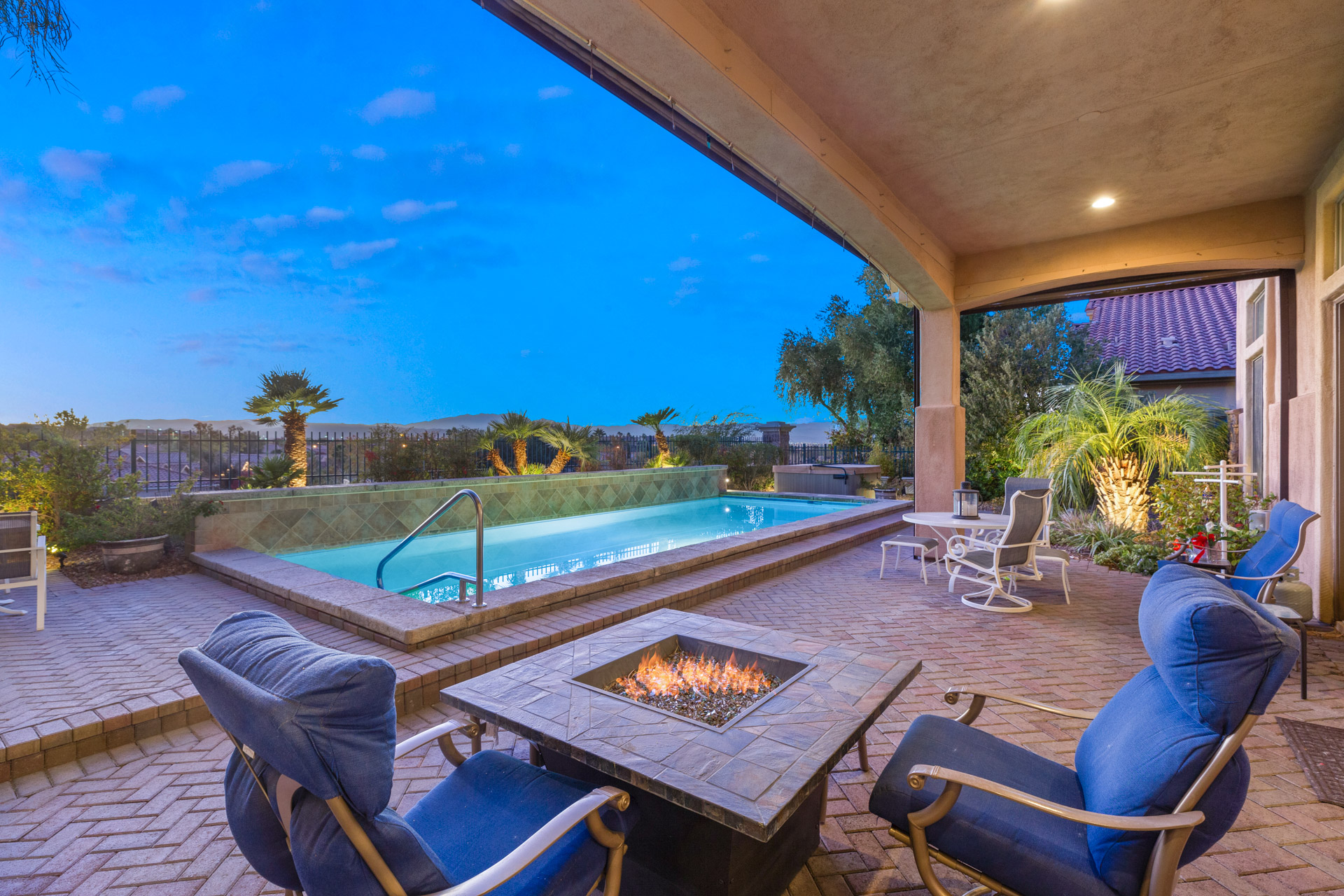 Transitional single story with mountain view, no home behind. Volume ceilings, architectural details, French doors. Wood floors, shutters. Entertaining open floor plan, wet bar, master w/retreat walk-in shower/jetted tub/fireplace/his-hers walk-in closets. Bright kitchen, nook, breakfast bar, s/s appliances. Guest suite/office w/sep entry, full bath. Pool & BBQ & fabulous custom dog run.