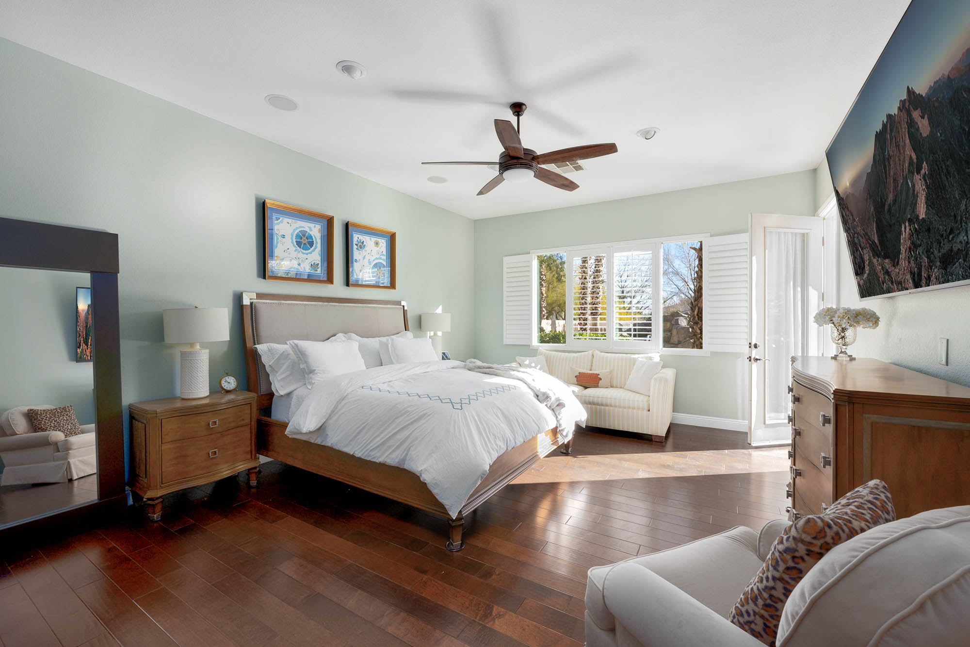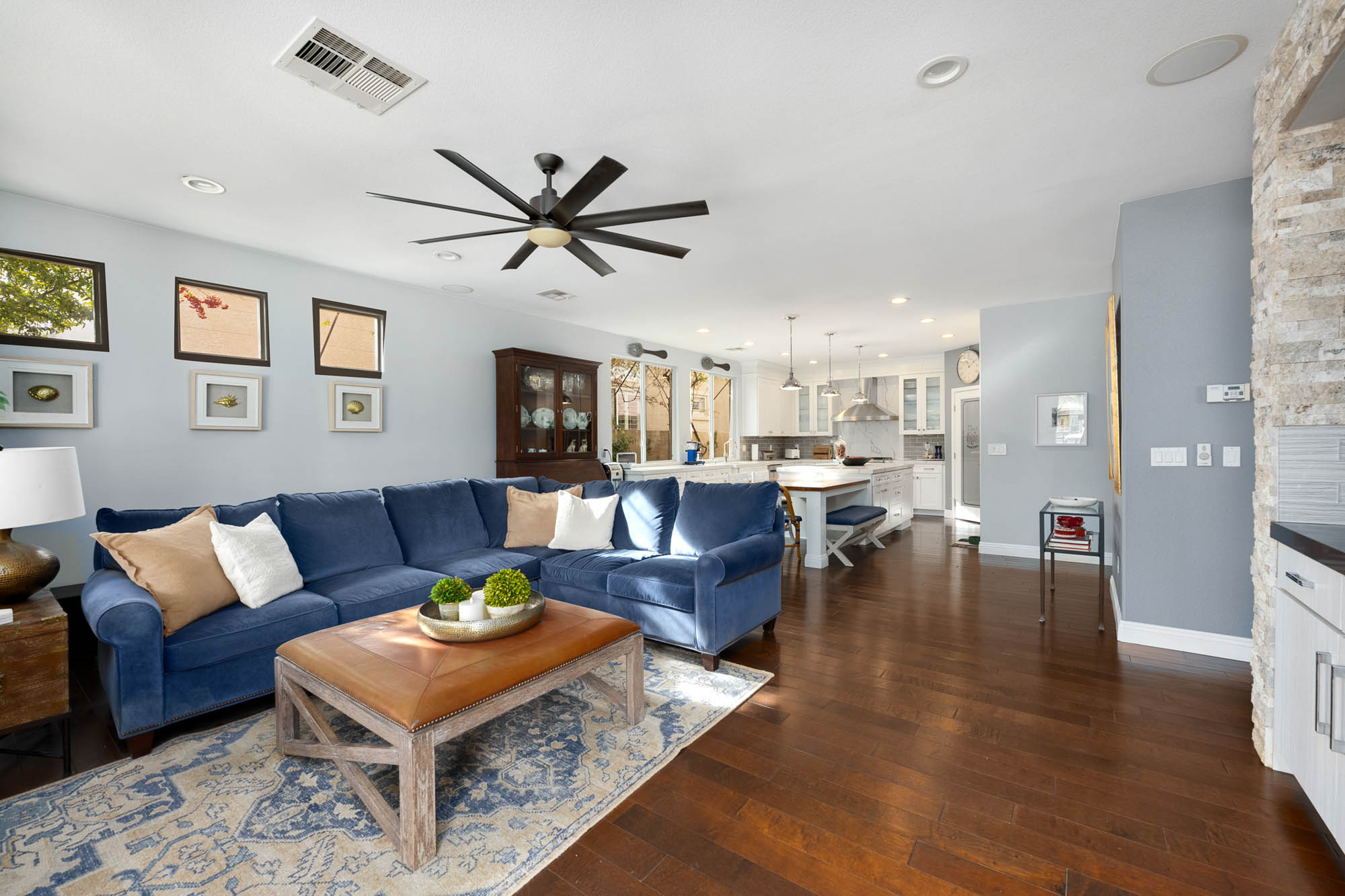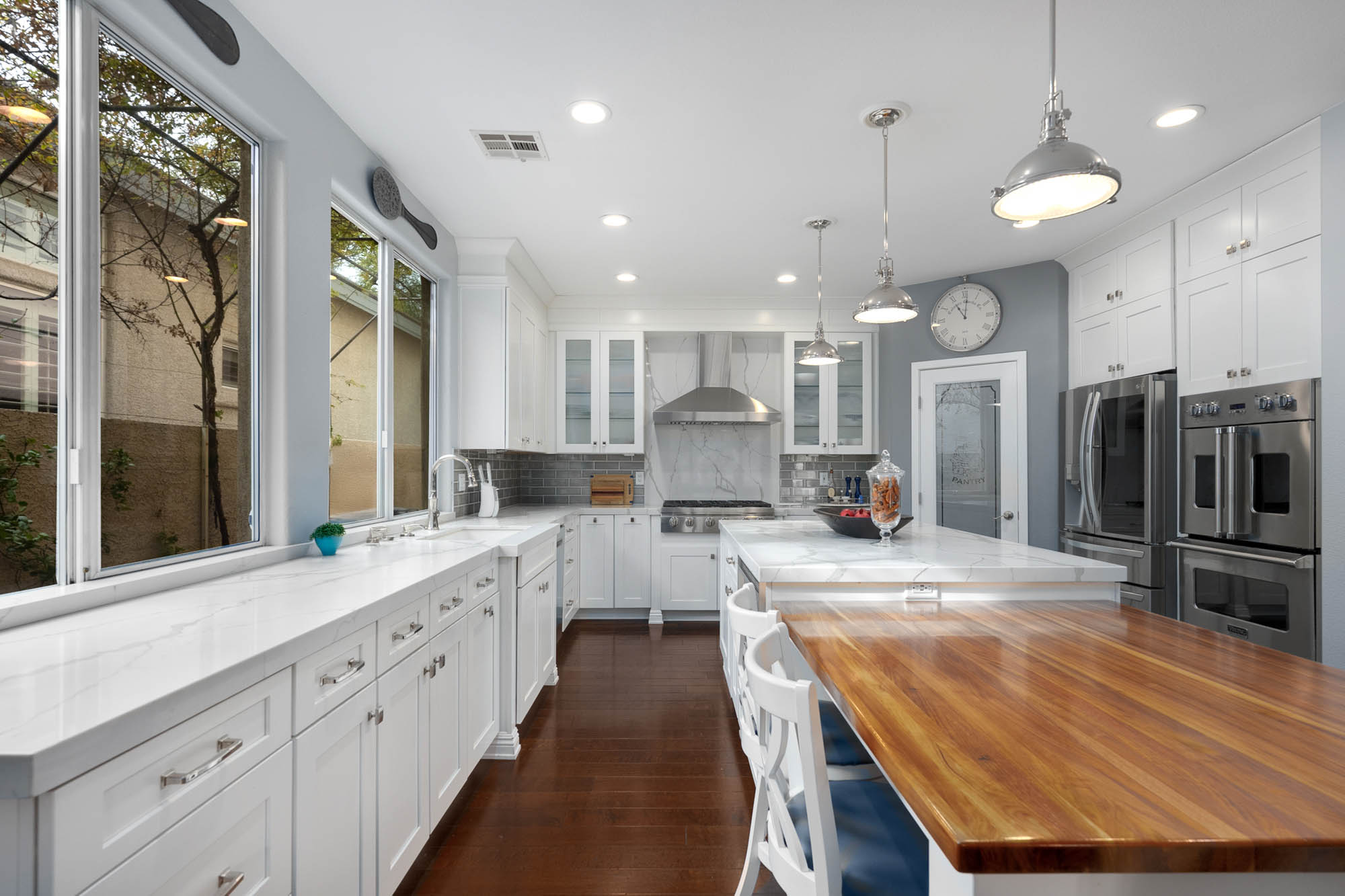 The timeless interiors feature rich wood floors throughout, a white shaker-style kitchen, quartz countertops, and a beautiful butcher block island. The expansive backyard backs to a serene greenbelt, providing exceptional privacy and tranquility. This home truly embodies comfort and elegance in one of Summerlin's most prime locations.
