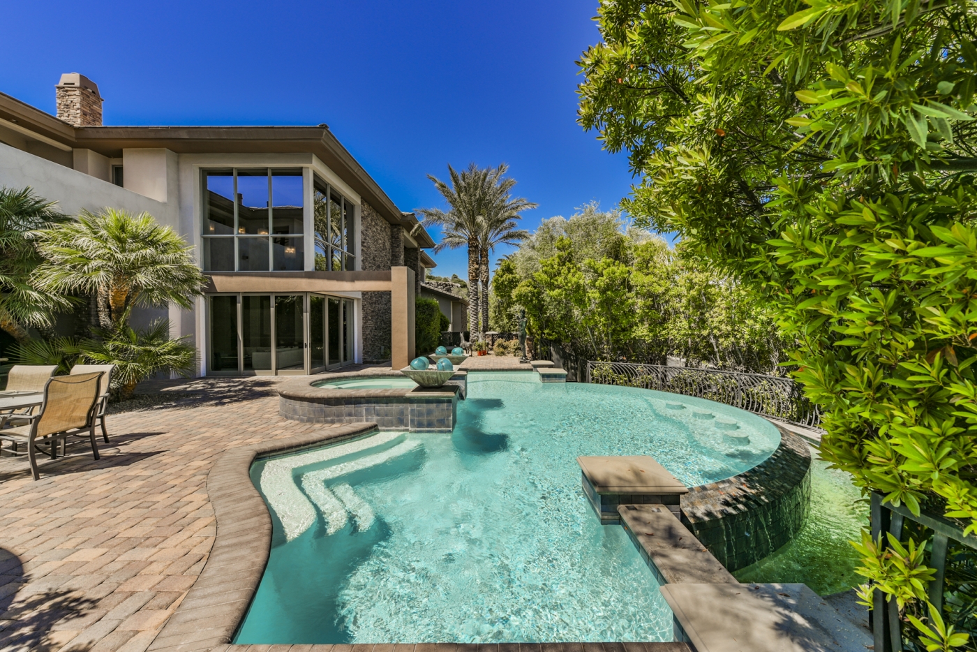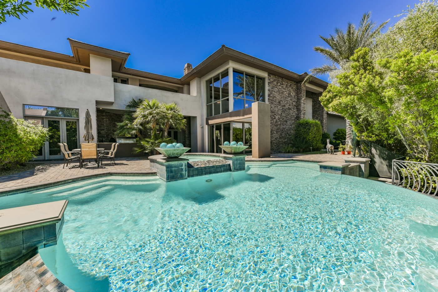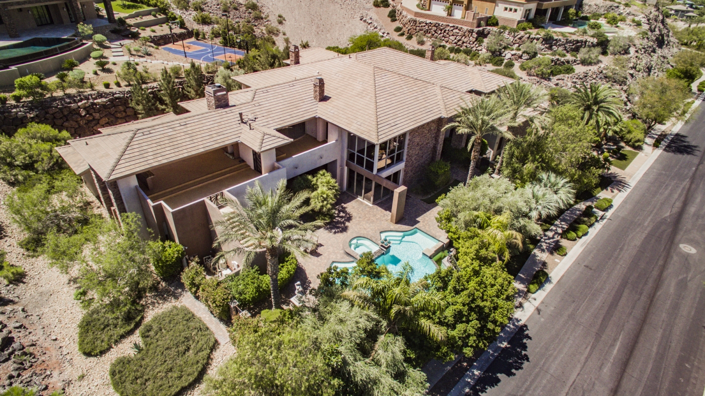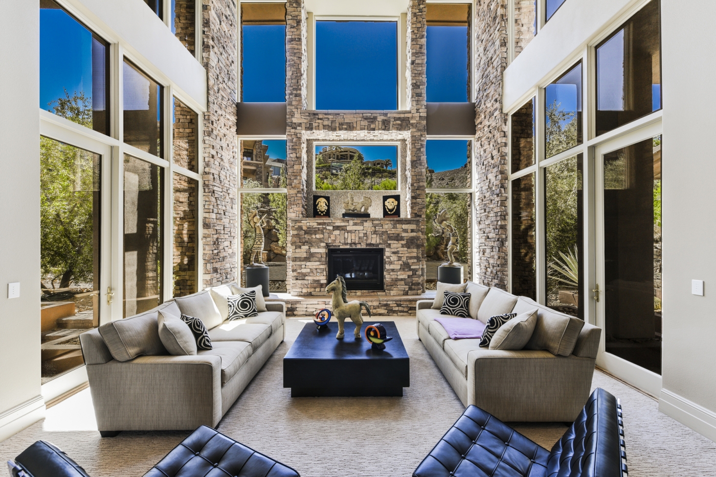 Soaring glass window walls accented by stone columns and stacked stone walls combine for dramatic effect in this custom MacDonald Highlands home. The light-filled interior is punctuated with views of lush landscaping, an enticing outdoor entertainment complex, sweeping desert vistas, and the nighttime spectacle of the Las Vegas Strip awash with lights.