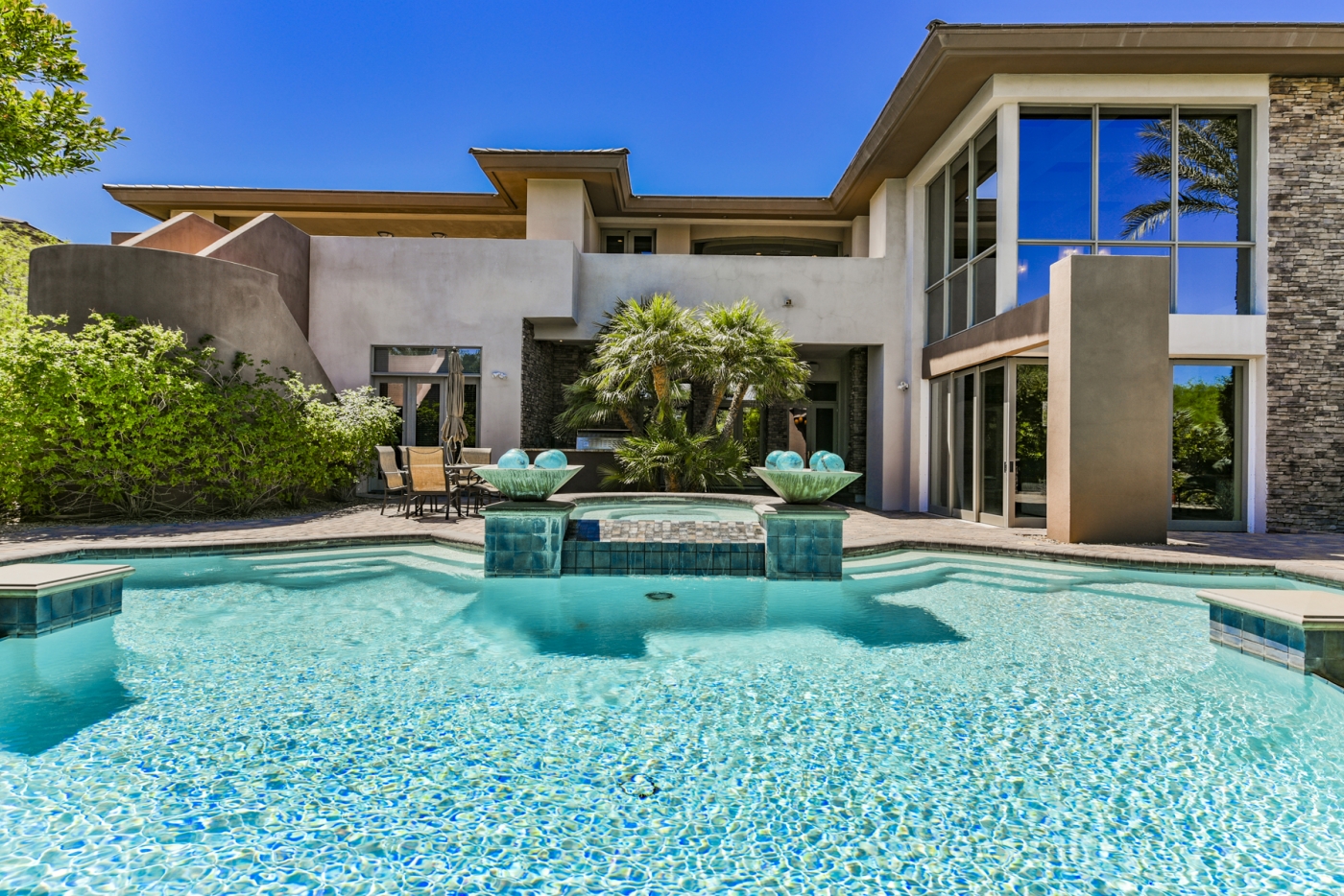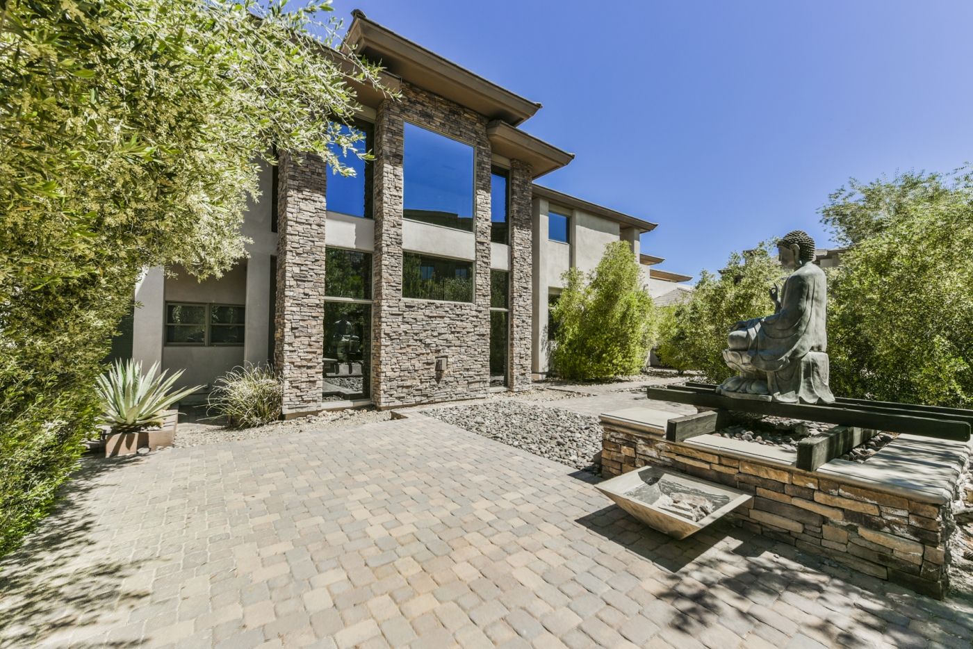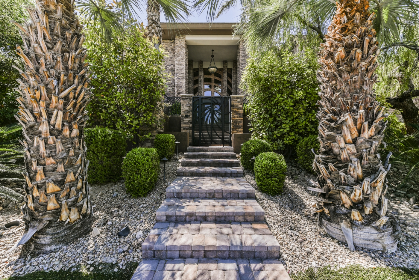 Soaring glass window walls accented by stone columns and stacked stone walls combine for dramatic effect in this custom MacDonald Highlands home. The light-filled interior is punctuated with views of lush landscaping, an enticing outdoor entertainment complex, sweeping desert vistas, and the nighttime spectacle of the Las Vegas Strip awash with lights.