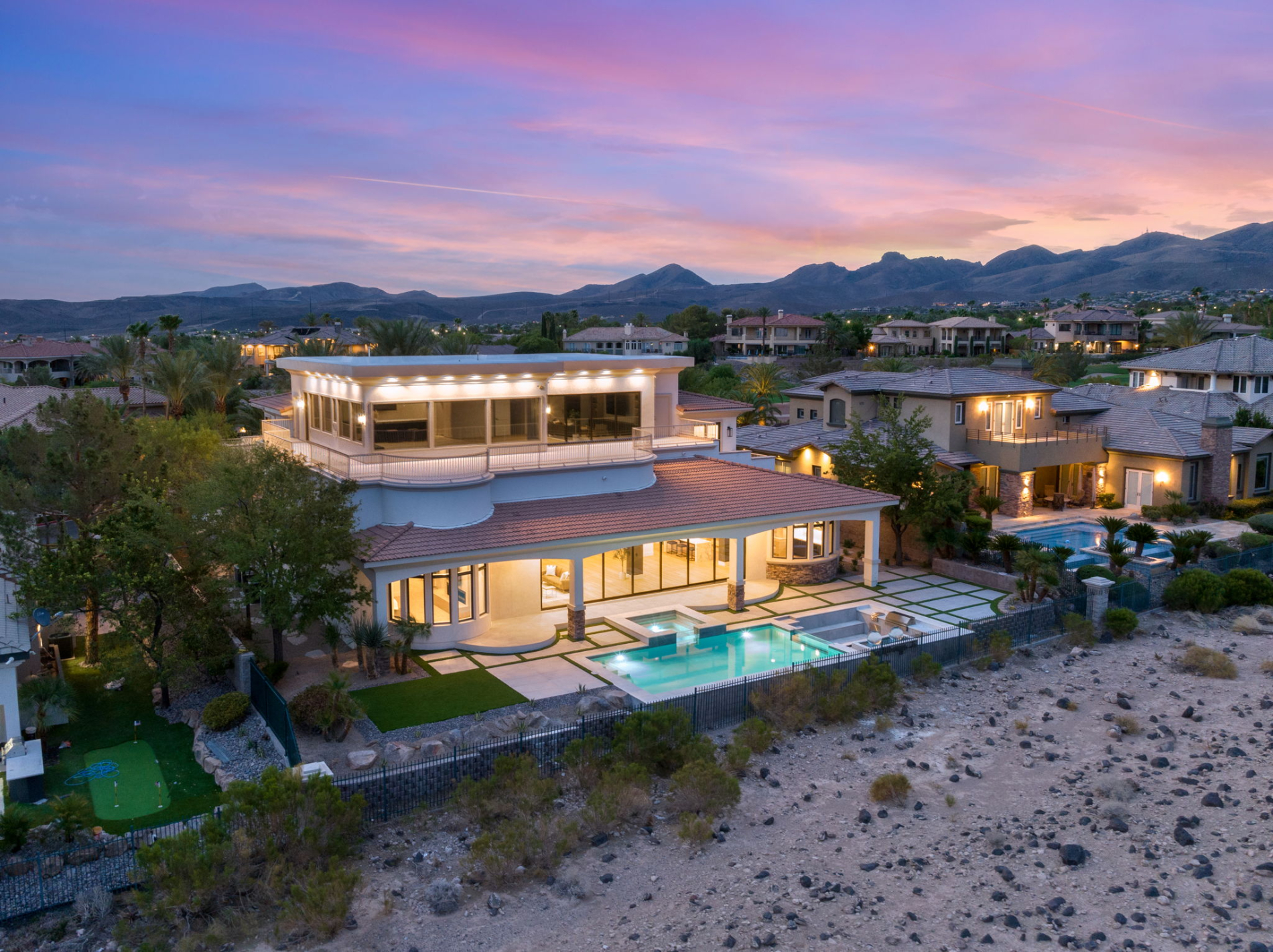 Inside, every detail has been carefully considered to create a space that exudes sophistication and luxury. Custom cabinets and millwork grace every room, and the open floor plan allows an abundance of natural light to flood the interior. This results in an inviting atmosphere that feels simultaneously elegant and welcoming. The heart of the home is a chef's dream kitchen, boasting top-of-the-line appliances, ample counter space, and a layout that encourages both culinary creativity and social engagement. The kitchen seamlessly connects to the dining and living areas, making it a perfect space for entertaining. The high-end fixtures and finishes extend throughout the home, ensuring that every corner radiates timeless elegance. With five generously sized bedrooms and eight bathrooms, this home offers the perfect blend of privacy and comfort for your family and guests. Each bedroom is a serene oasis with its own en-suite bathroom, promising relaxation and privacy for all. Whether you choose the master suite with its own private balcony, a guest room with stunning views, or one of the other beautifully appointed bedrooms, you'll find your own sanctuary within this modern masterpiece. The lower level of the home is designed for entertainment and relaxation, featuring a spacious recreation room and a wet bar, creating an ideal setting for movie nights, game nights, or simply unwinding after a long day. You can also step outside to the beautifully landscaped backyard, where you'll find a private oasis complete with a sparkling pool and spa, surrounded by lush greenery and a stunning view. It's the perfect spot for hosting gatherings or simply enjoying a serene day in the sun. One of the standout features of this property is its location within the guard-gated sub-community of Terracina in Seven Hills. This adds an extra layer of security and peace of mind, allowing you to enjoy the beautiful surroundings without any worries. Seven Hills is renowned for its upscale amenities, including world-class golf courses, parks, and miles of walking and biking trails. It's a community that embraces the natural beauty of the area, creating a serene and peaceful atmosphere that is perfect for those who appreciate an active and outdoor lifestyle. Seven Hills offers the best of both worlds. While you'll enjoy the tranquility and natural beauty of this neighborhood, the vibrant and exciting Las Vegas Strip is just a short drive away. You'll have easy access to world-class dining, entertainment, and nightlife, making this location ideal for those who want the best of both serene suburban living and city excitement. In summary, 1535 Teramo is a rare opportunity to own a remarkable property in the highly sought-after Seven Hills community. With its modern, sexy, and timeless design, exceptional features, and breathtaking views, it truly is a dream home that offers the epitome of luxury living. Don't miss your chance to make this extraordinary property your own. Schedule a viewing today and experience the perfect balance of elegance, comfort, and convenience that awaits you in Seven Hills. Your dream home is here, waiting for you to make it your own.