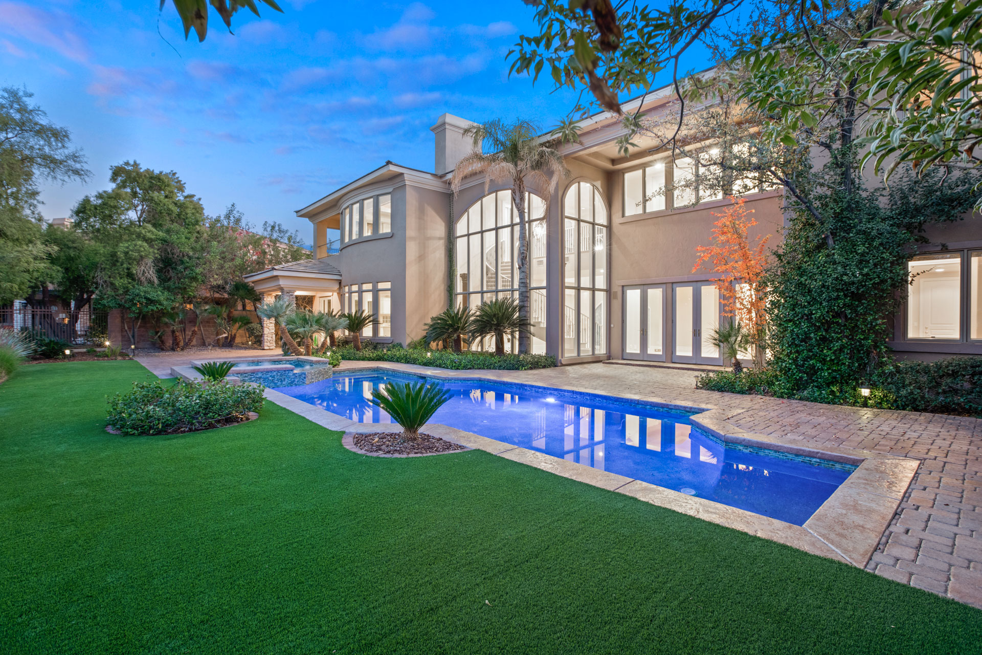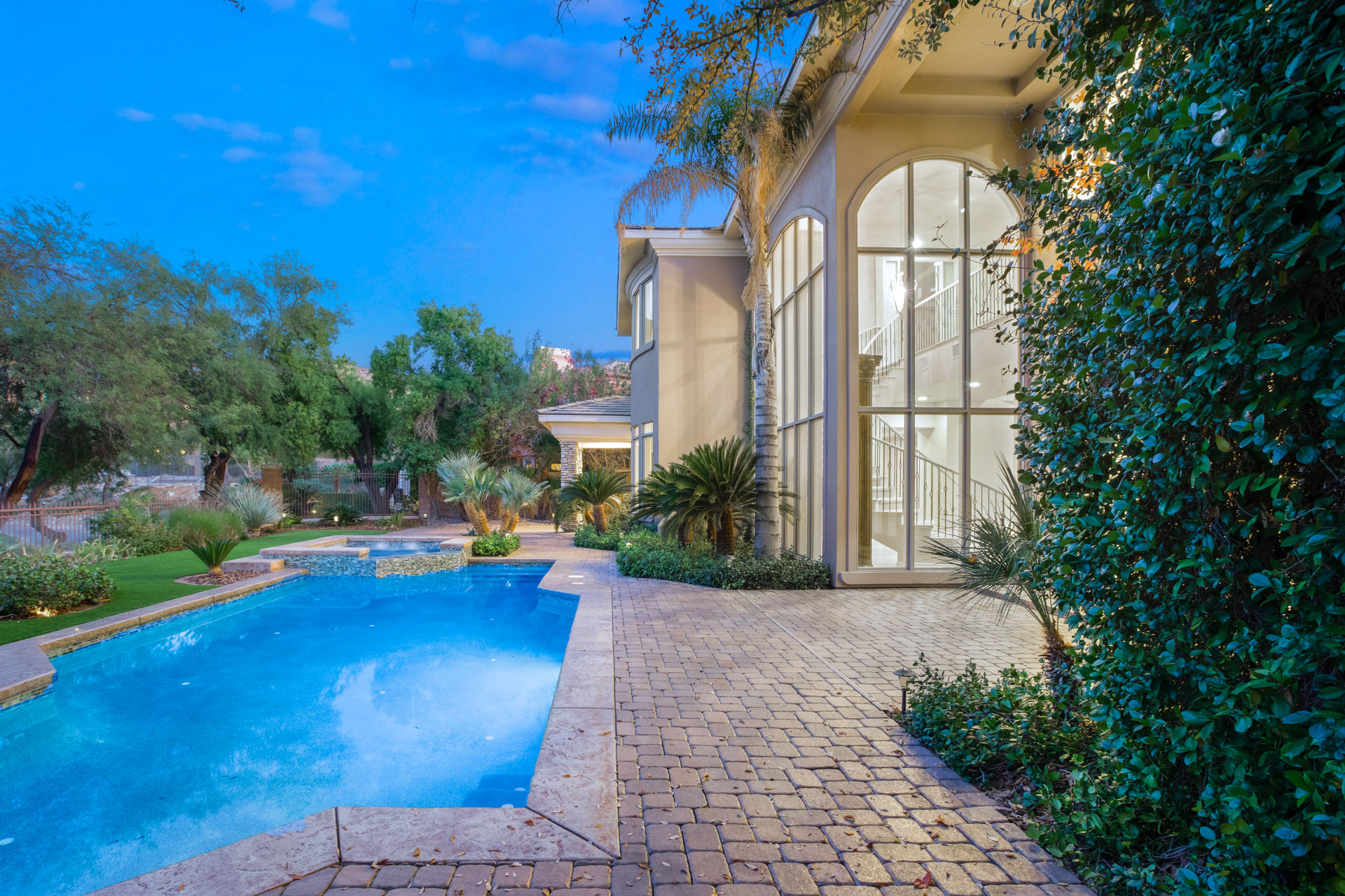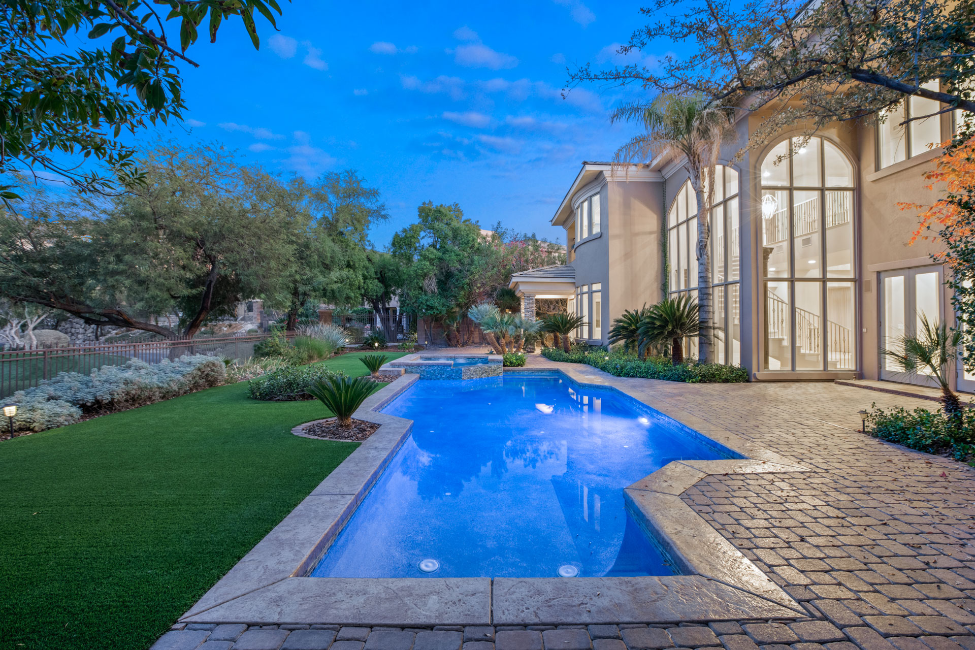 Residents will be greeted to by a guarded, gated community, providing additional security and peace of mind. From there, this modern, Mediterranean-style home boasts stunning curb appeal and an impressive dual garage, flanking both sides of the home. Stepping through the doors of the resort-style entrance, you will be in awe of the impressive spiral staircase and cathedral ceilings, where you will catch a sneak peek at the incredible backyard.