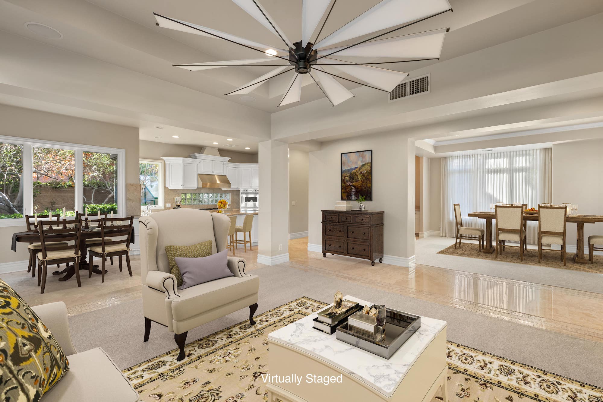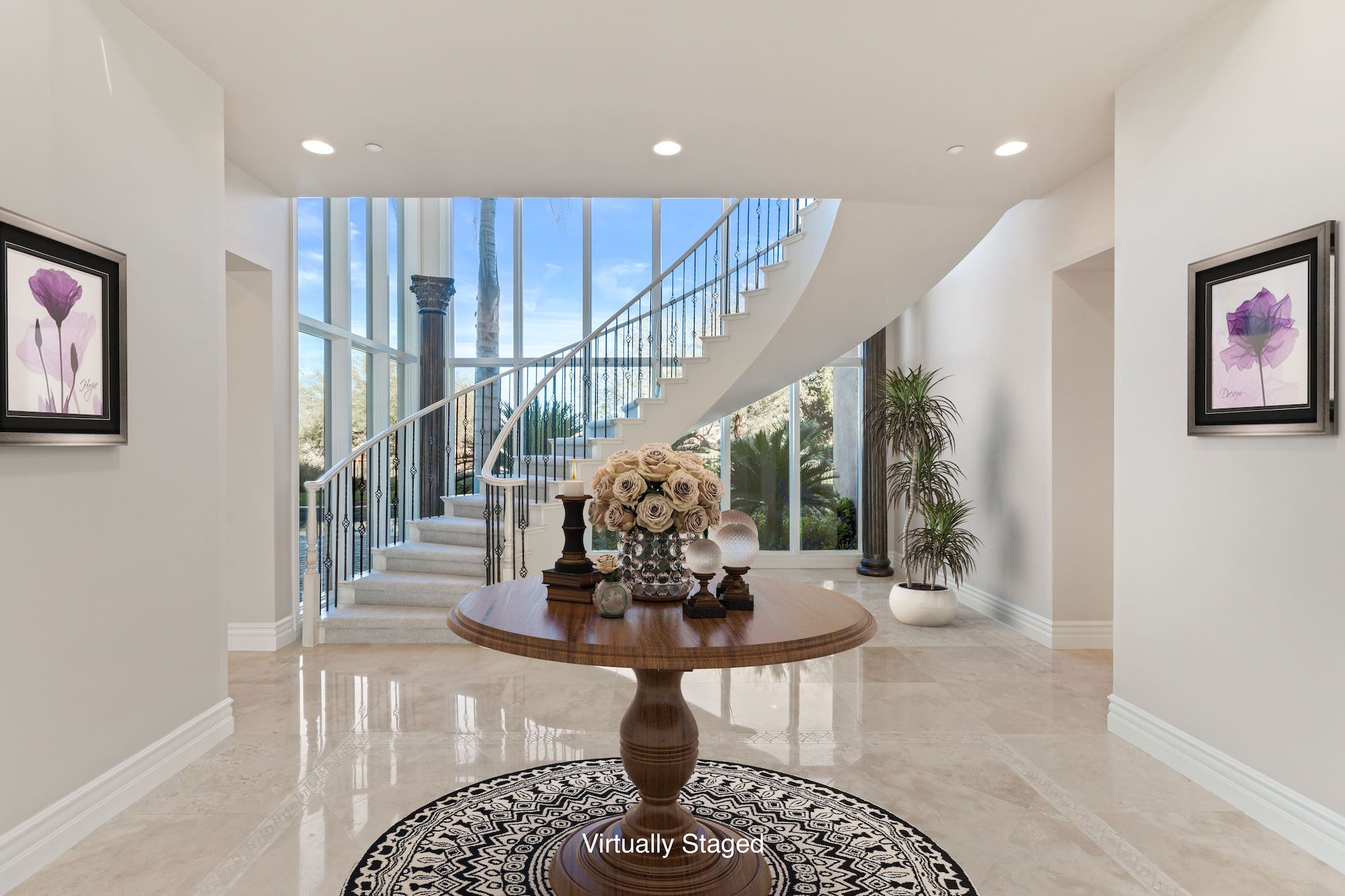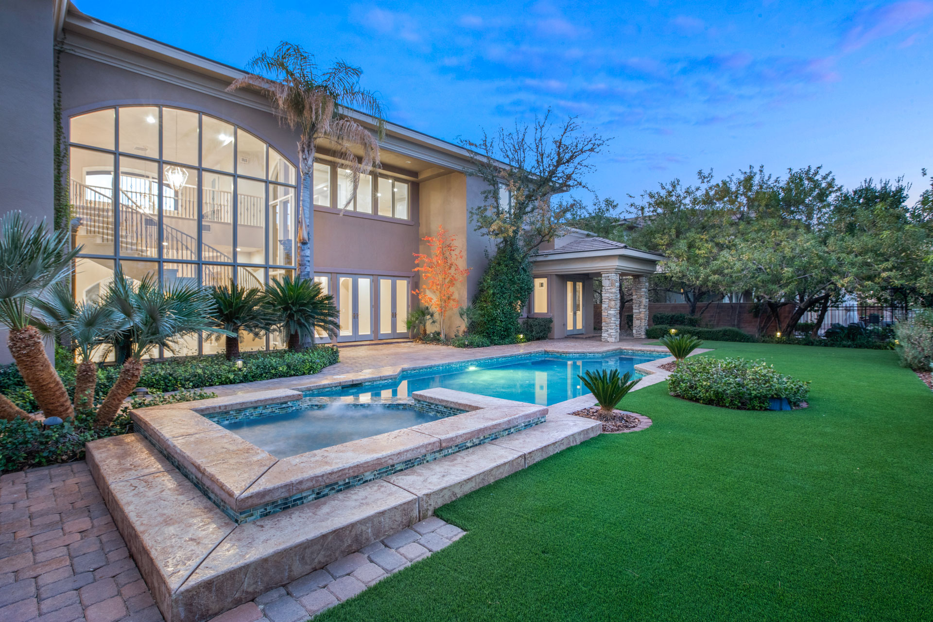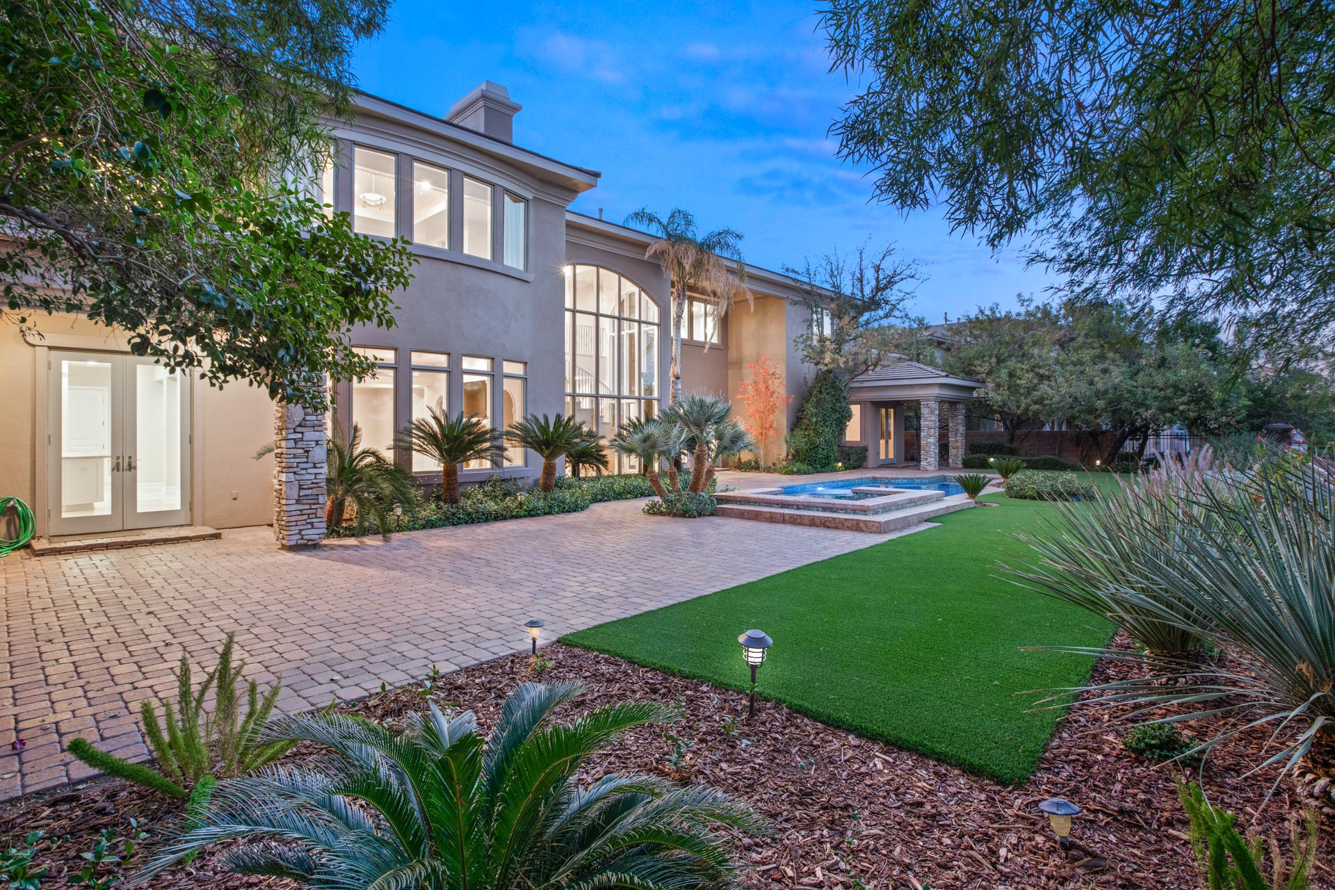 Residents will be greeted to by a guarded, gated community, providing additional security and peace of mind. From there, this modern, Mediterranean-style home boasts stunning curb appeal and an impressive dual garage, flanking both sides of the home. Stepping through the doors of the resort-style entrance, you will be in awe of the impressive spiral staircase and cathedral ceilings, where you will catch a sneak peek at the incredible backyard.