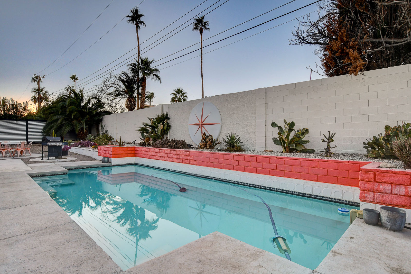 Features include stained concrete floors, a wood-burning fireplace, a breezeway block wall, and expansive floor-to-ceiling windows that flood the home with natural light. The open floor plan is perfect for entertaining, flowing seamlessly to a private backyard with a sparkling saltwater pool and modern desert landscaping. A two-car carport adds convenience. Located in a historically rich, no-HOA community, Paradise Palms offers a close-knit atmosphere with monthly socials and events. Don’t miss the chance to own a piece of vintage Vegas history, where timeless style meets modern living in an iconic neighborhood.