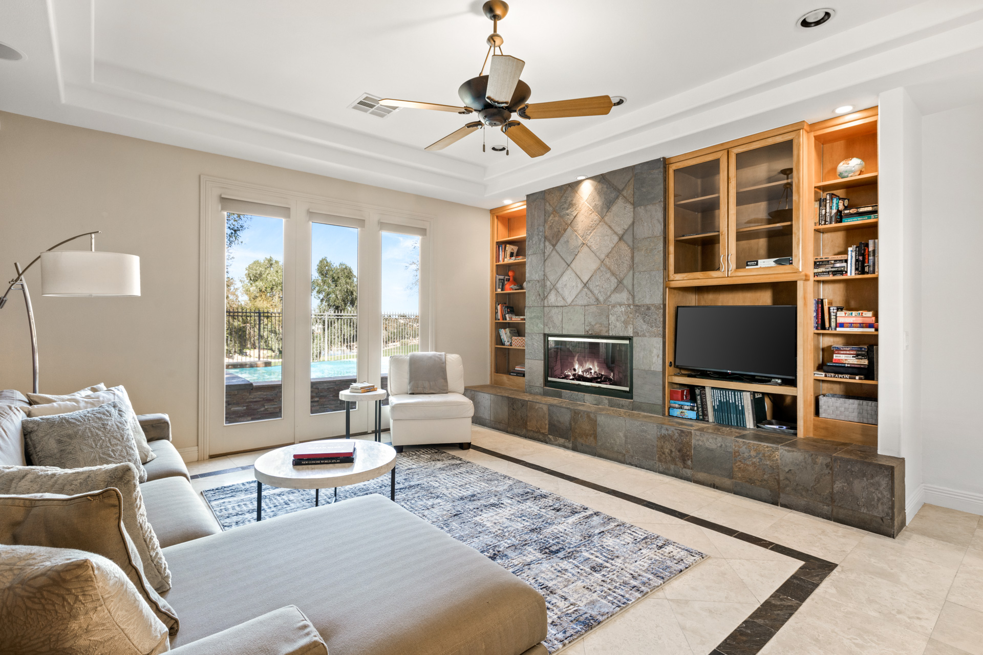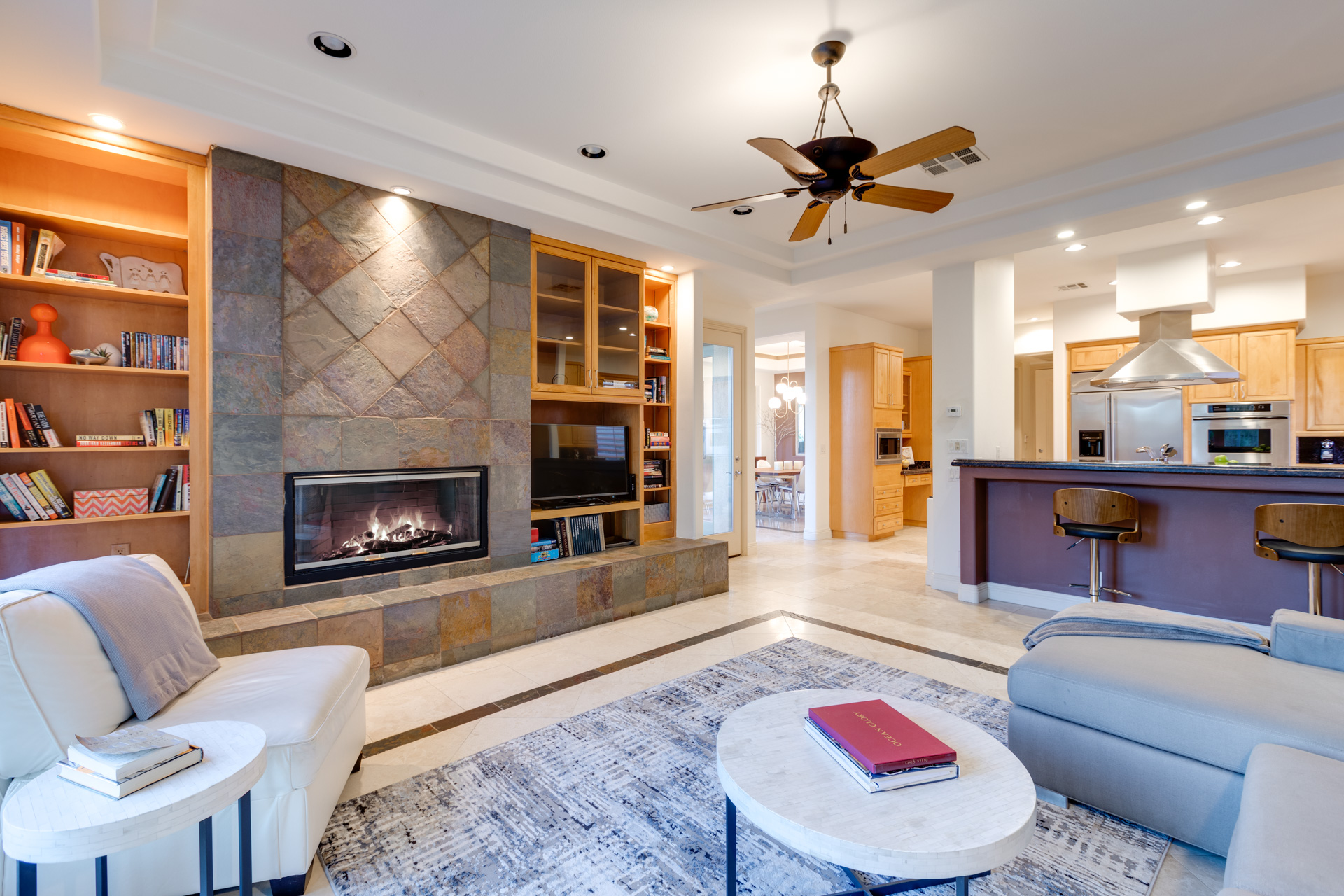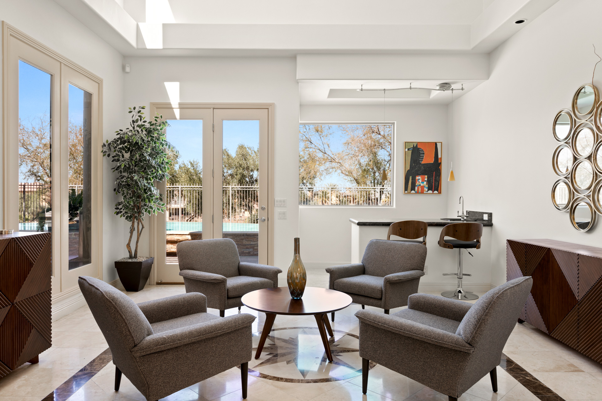 This beautiful two-story home packs a lot of living space into its floor plan with five bedrooms and five and a half baths. Take in the fabulous golf course views looking down the fairway toward the lake. After passing the tranquil water feature in the courtyard, enter the sunlight-filled entry leading to a sitting room with a wet bar featuring two-story ceilings.