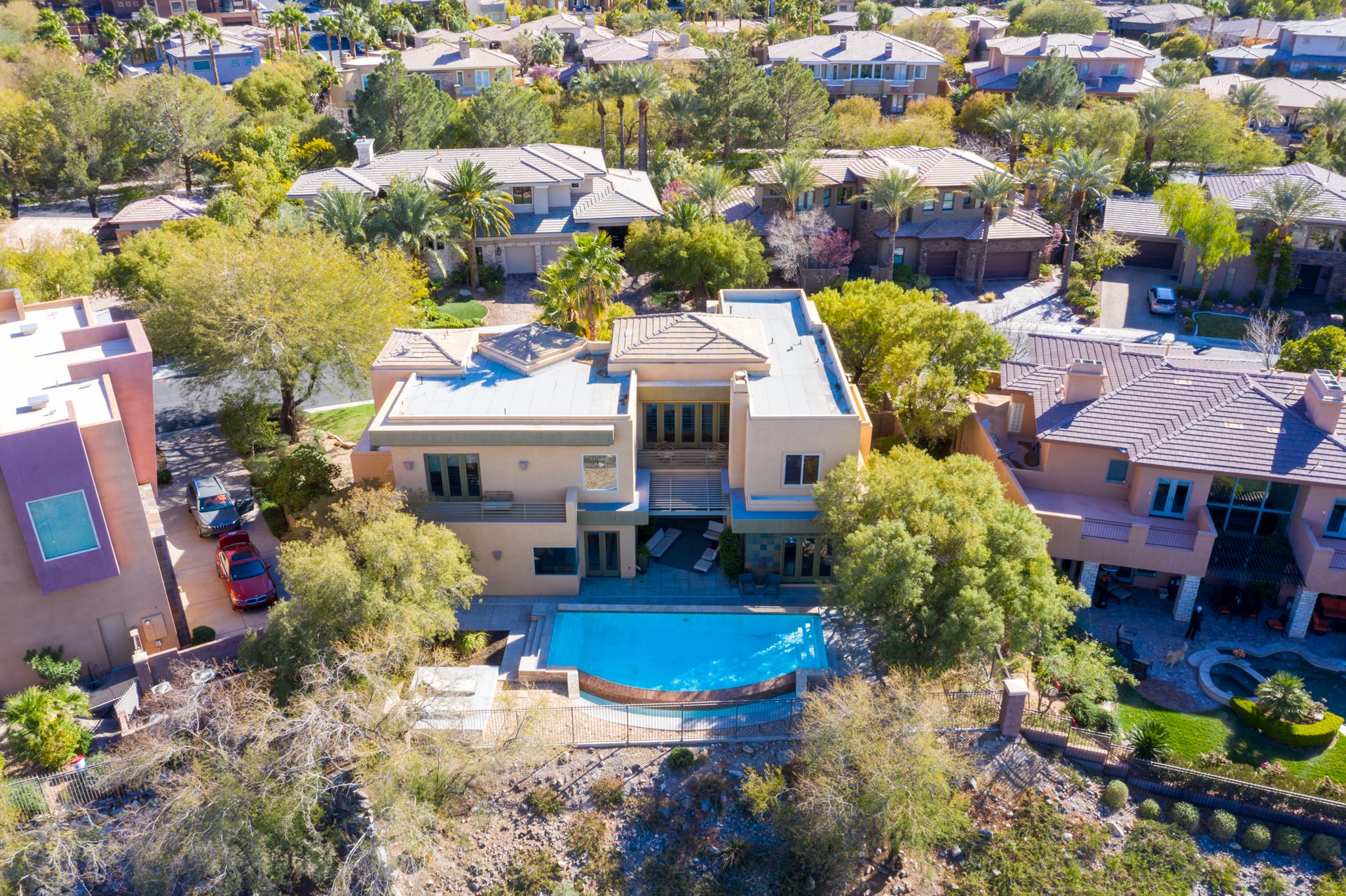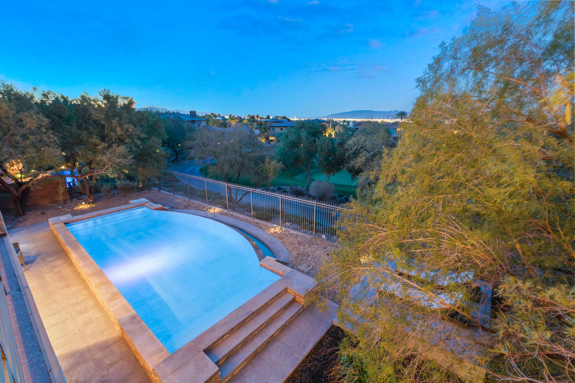 The kitchen boasts stainless steel appliances and opens to a comfortable family room with a gas fireplace. The first-floor master bedroom offers access to the pool and landscaped rear patio, and a well-appointed bathroom with a glass-block shower in addition to a corner soaking tub, dual water closets, and dual vanities. A library/office with built-in bookshelves can also serve as the fifth bedroom with French doors that lead to the courtyard. Upstairs offers three large bedrooms, including a second master suite featuring a luxurious jetted tub, in addition to a separate glass-walled shower, and a private balcony overlooking the pool with fabulous city views. Two additional large bedrooms share a bathroom. A media room designed to accommodate an oversize flat-screen television completes the second floor.