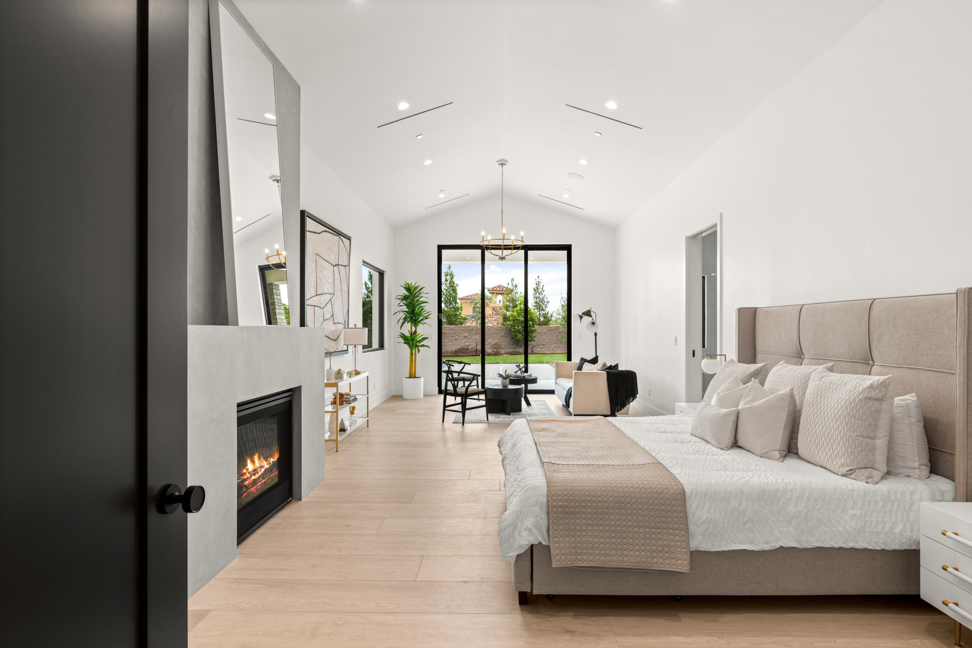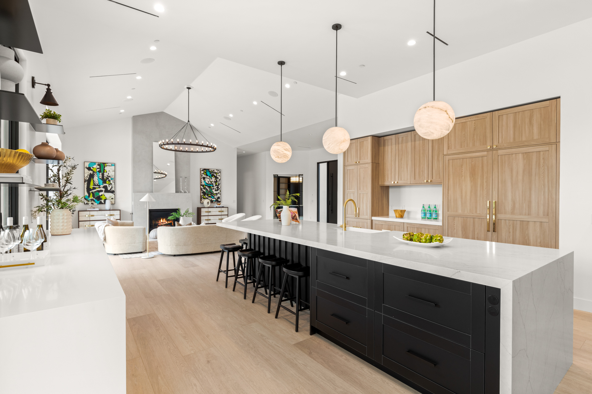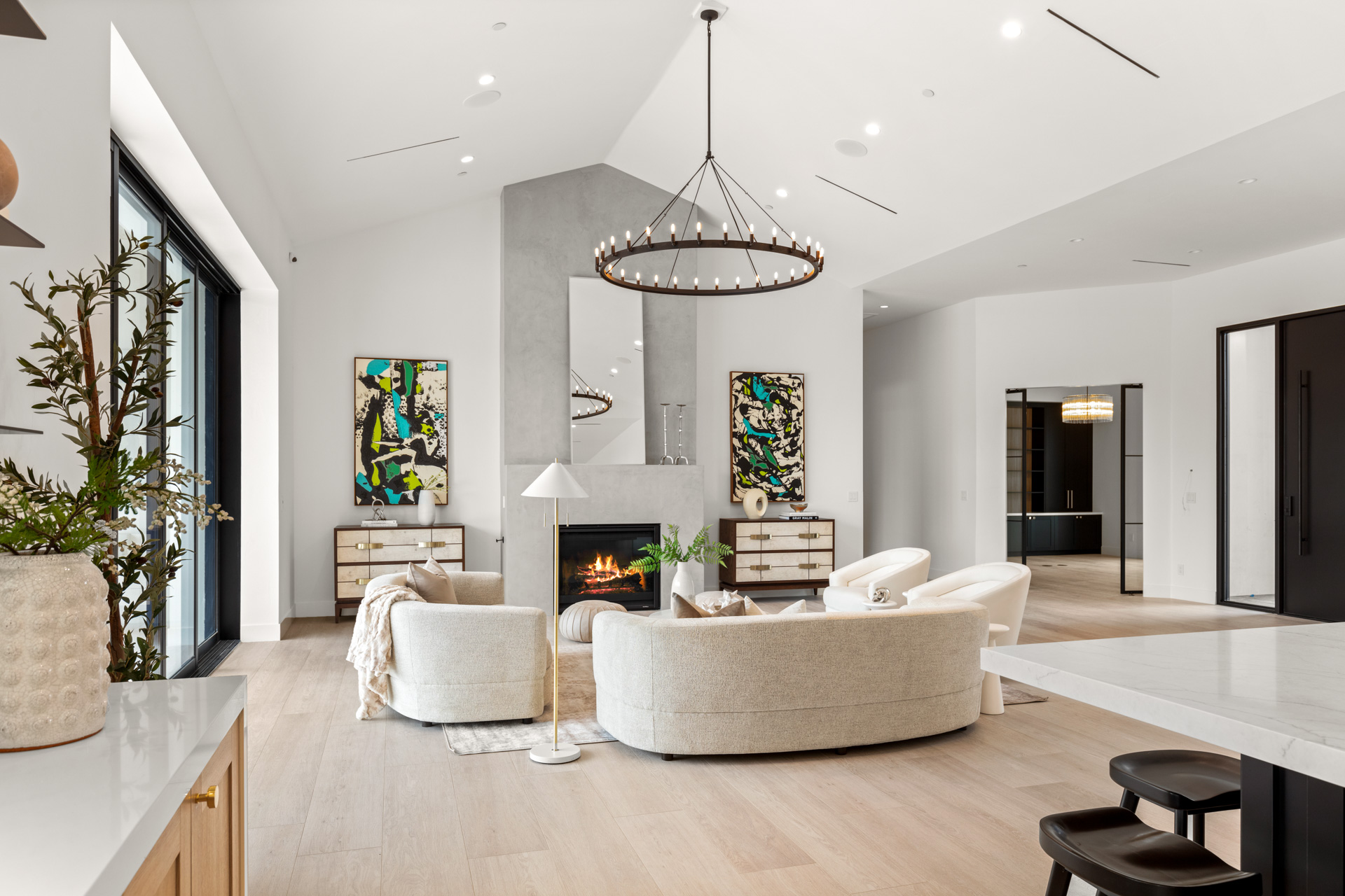 Metal pivot entrance door opens to great room with 17' disappearing glass doors. 4 en suite bedrooms plus office. Amazing kitchen with Jenn Air Pro appliance package. Fabulous master retreat ā wet room with steam shower, soaking tub, closet with storage island with built-in washer/dryer. Lime-washed fireplaces. Alabaster pendants. Porcelain wood-look floors. Laundry room with dog wash. Fully integrated smart home (lighting, sound, cameras, pool).