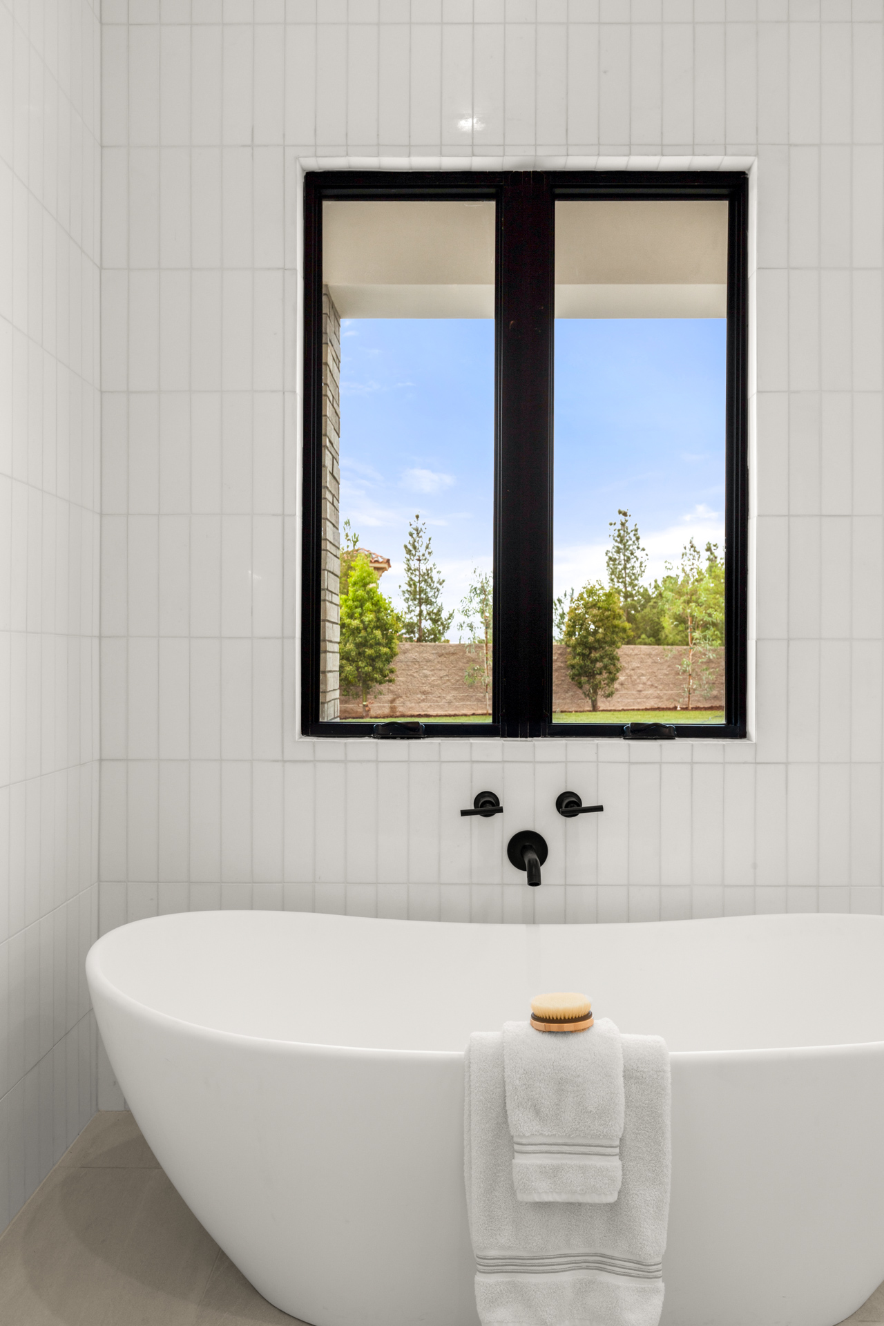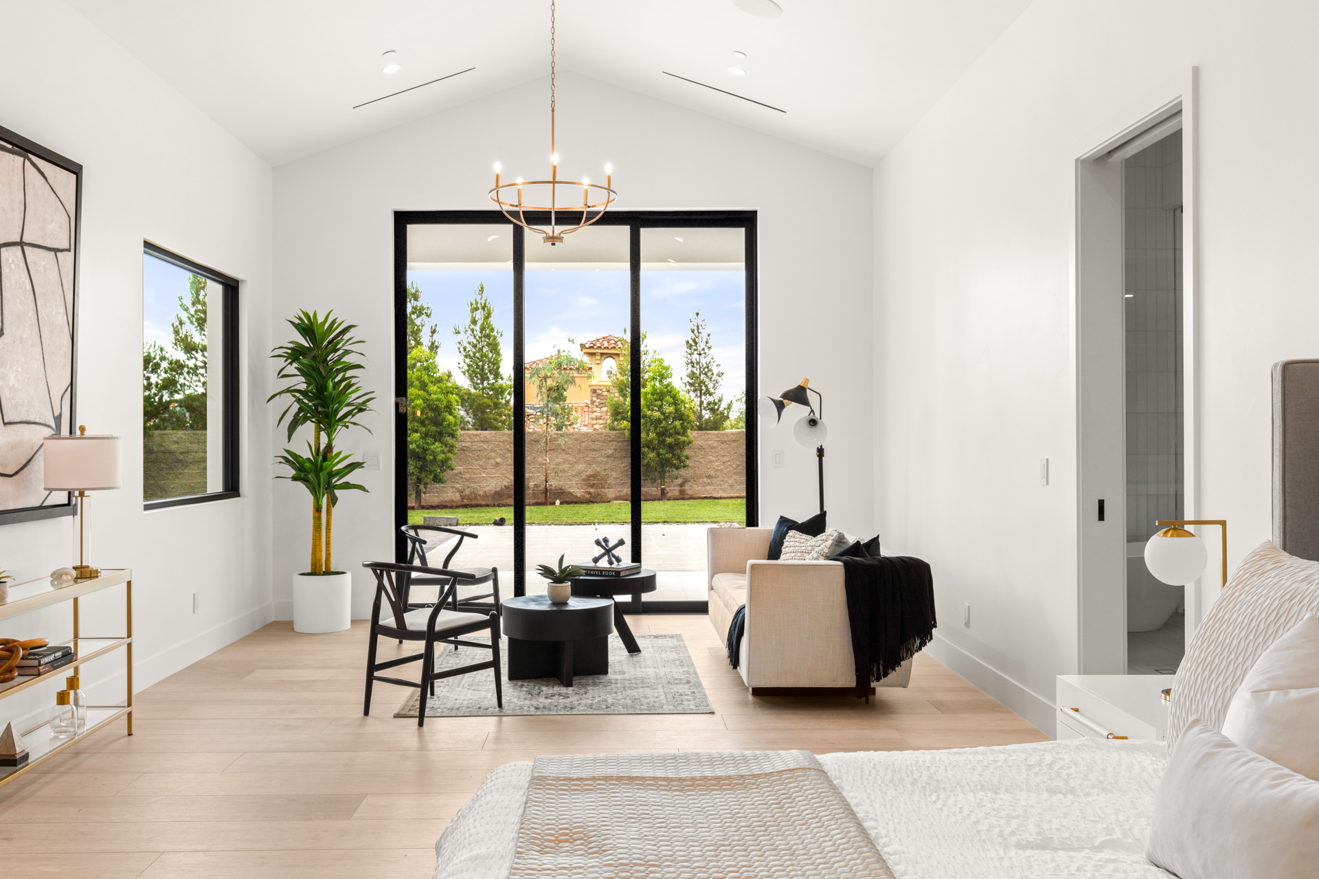 Beautiful white facade with contemporary black accents and welcoming courtyard. Interior features an open floorplan with high ceilings throughout.